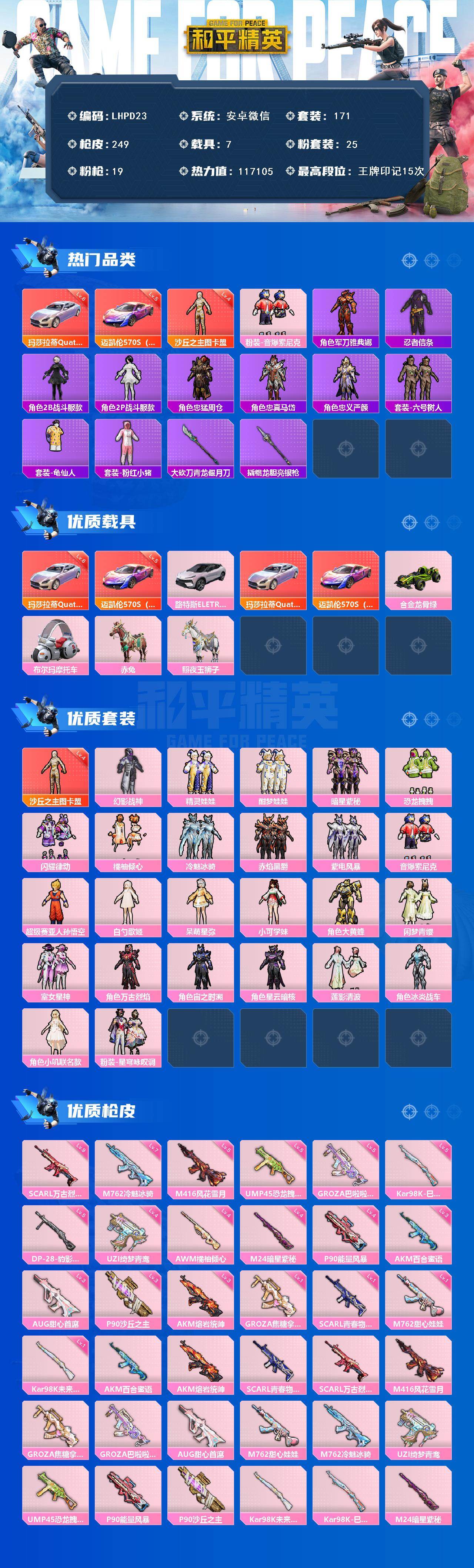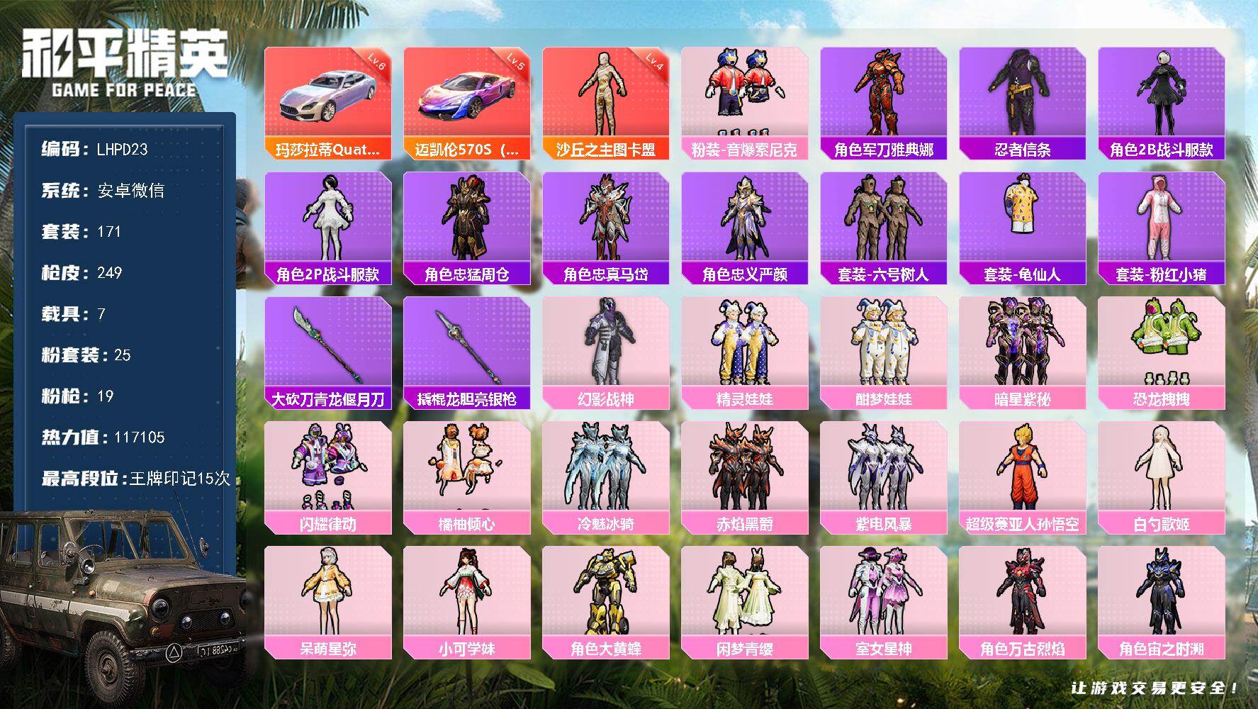 [15670453]【特价出售/店主推荐】安卓 微信-1神装-25粉装-19特效枪-7载具-9粉色飞行器-117105热力值-15王牌印记-171套装-249枪皮【红色载具】:玛莎拉蒂Quattroporte(幻星粉)(六级),迈凯伦570S(镭射紫)(五级)【红色神装等级】:沙丘之主-图卡盟(四级)【红色角色神装】:沙丘之主-图卡盟【热门品类】:粉装-音爆索尼克,角色-军刀雅典娜,套装-忍者信条,角色-2B战斗服款,角色-2P战斗服款,角色-忠猛周仓,角色-忠真马岱,角色-忠义严颜,套装-六号树人,套装-龟仙人,套装-粉红小猪,大砍刀-青龙偃月刀,撬棍-龙胆亮银枪【粉色套装】:粉装-幻影战神,粉装-精灵娃娃,粉装-酣梦娃娃,粉装-暗星紫秘,粉装-恐龙拽拽,粉装-闪耀律动,粉装-橘柚倾心,粉装-冷魅冰骑,粉装-赤焰黑爵,粉装-紫电风暴,粉装-音爆索尼克,超级赛亚人-孙悟空,角色-白勺歌姬,角色-呆萌星弥,角色-小可学妹,角色-大黄蜂,粉装-闲梦青缨,粉装-室女星神,角色-万古烈焰,角色-宙之时溯,角色-星云暗核,粉装-莲影清波,角色-冰炎战车,角色-小叽联名款,粉装-星穹咏叹调【粉色枪皮等级】:AKM-百合蜜语(三级),AKM-熔岩统帅(三级),SCAR-L-青春物语(一级),SCAR-L-万古烈焰(九级),M416-风花雪月(五级),GROZA-焦糖拿铁(一级),GROZA-巴啦啦小魔仙(五级),AUG-甜心首席(三级),M762-甜心娃娃(一级),M762-冷魅冰骑(七级),UZI-绮梦青鸾(四级),UMP45-恐龙拽拽(五级),P90-能量风暴(四级),P90-沙丘之主(三级),Kar98K-未来歌姬(一级),Kar98K-巳巳如意(五级),M24-暗星紫秘(四级),AWM-橘柚倾心(四级),DP-28-豹影疾电(五级)【粉色载具】:路特斯ELETRE(花绽灰),玛莎拉蒂Quattroporte(幻星粉),迈凯伦570S(镭射紫),合金龙骨(绿),布尔玛摩托车,赤兔,照夜玉狮子【粉色枪皮】:AKM-百合蜜语,AKM-熔岩统帅,SCAR-L-青春物语,SCAR-L-万古烈焰,M416-风花雪月,GROZA-焦糖拿铁,GROZA-巴啦啦小魔仙,AUG-甜心首席,M762-甜心娃娃,M762-冷魅冰骑,UZI-绮梦青鸾,UMP45-恐龙拽拽,P90-能量风暴,P90-沙丘之主,Kar