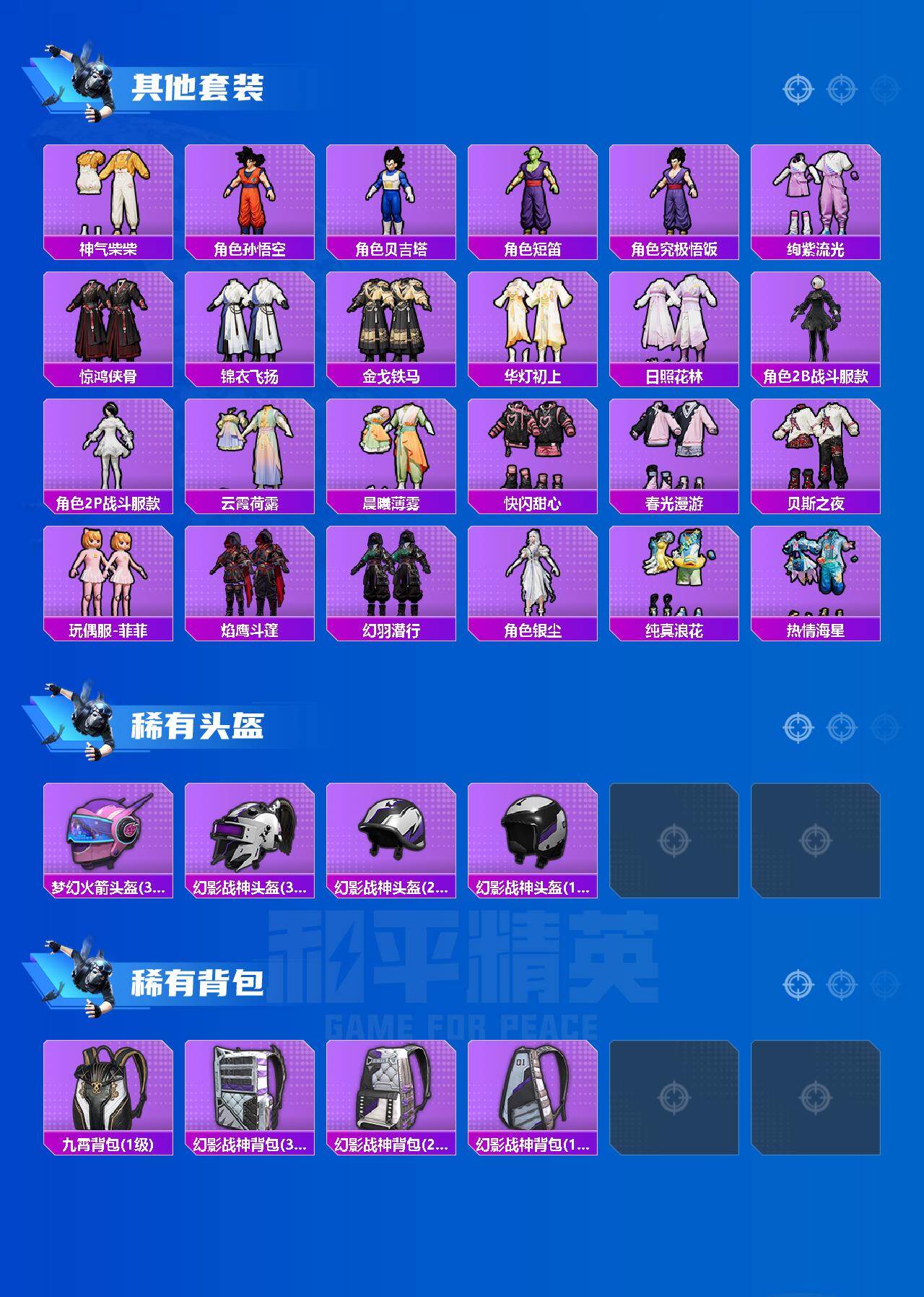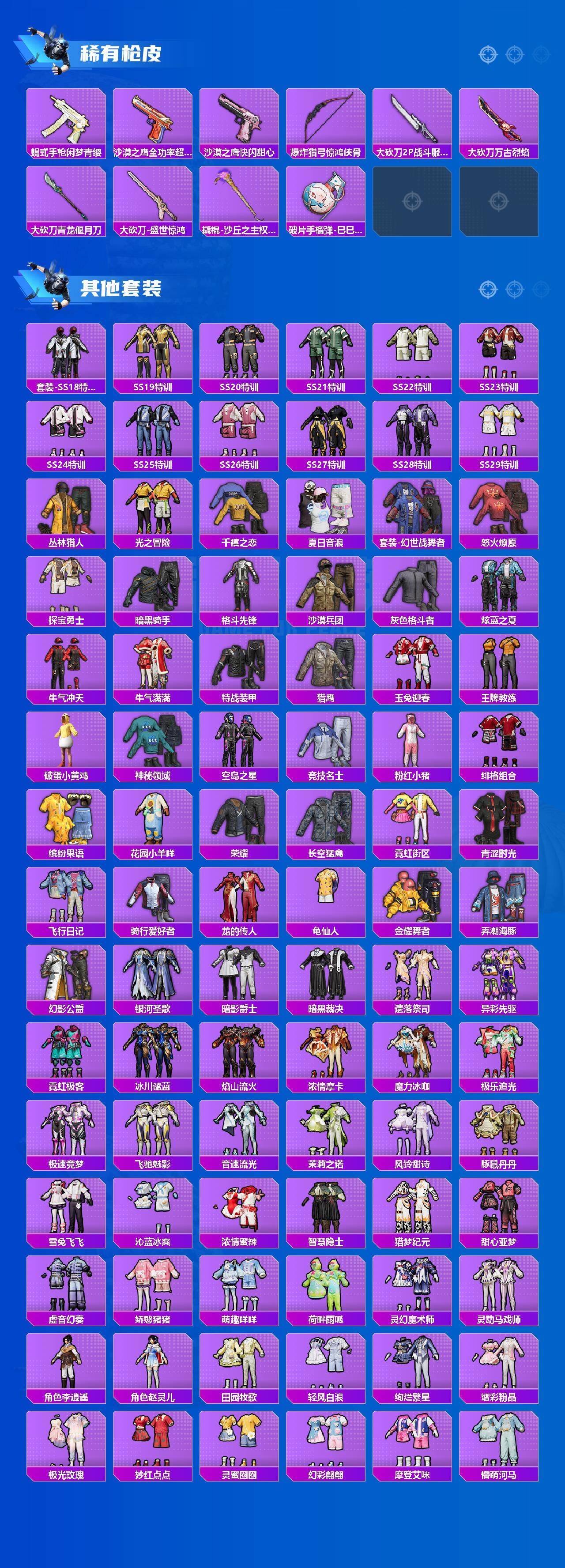- [11651418]11粉装 4特效枪 2载具 3印记 可二次 可修改实名 优质装备:玛莎拉蒂Grecale(薄荷绿),玛莎拉蒂Quattroporte(夜幕蓝),梦幻火箭(新101)(新火箭少女101粉色套装),蝶舞迷情,天使彩虹糖,冰霜白皇,M416风花雪月,SCAR-L纯梦嫁纱,Kar98K-巳巳如意 热门装扮:蜜桃特工,橘柚倾心,寒光使者,太空嘟嘟,仲夏莫吉托,圣堂之誓,美雪,胖达圆圆 稀有枪皮:DP-28-豹影疾电 六级特效枪:六级M416-风花雪月 四级特效枪:四级SCAR-L-纯梦嫁纱 二级特效枪:二级Kar98K-巳巳如意 一级特效枪:一级DP-28-豹影疾电 紫色装扮:星夜迷魅,田园牧歌,轻风白浪,和煦暖阳,SS22特训,莱茵河畔,SS23特训,幻彩翩翩,妙红点点,摩登艾咪,娇憨猪猪,梦幻奶油,樱桃黑巧,暖心橘喵,萌趣咩咩,SS21特训,绚烂繁星,冰川特警,SS33特训套装,SS20特训,青春冒险家,潮流游乐家,SS15特训,时空追击者,SS16特训,星梦畅游,SS14特训,萌趣颜团子,特种颜团子,SS19特训,豚鼠丹丹,吉莉礼服,瑞龙福将,团圆交子,SS17特训,SS18特训,都市漫游者,酷潮明星,长空猛禽,霓虹街区,缤纷果语,蜜露汐语,飞行日记,骑行爱好者,魅力单车,鹤鸣,龙魂突击队,沙漠毒蛇,格斗先锋,海岛探路者,涂山之恋,滨海假日,夏日音浪,幻世战舞者,探宝勇士,湖蓝色名流,滨海厨神,绮丽涂鸦,破蛋小黄鸡,福星高照,空岛之星,甜蜜熊情侣,灿烂千阳,牛气满满,狂沙舞者,SS29特训,湖畔霞光,SS28特训,玉兔迎春,巳巳如意,竞技名士,绒宝小鹅,神气柴柴,懵萌河马,SS24特训(SS24特训套装),月光变奏,皇家花园,锦衣飞扬,星际旅行,舰行太空,无暇誓言,明鸳圣池,牛仔情诗,浪漫天命,SS26特训,晶辉守护,淡雅花蕊,玲珑飞花,辉星之火,纯白誓言,暗夜契约,本愿之火,耀粉歌者,SS32特训服(SS32特训套装),幽秘之星,萌黄之夏,光之冒险,海上生明月 优质战备:圣堂之誓降落伞,彩装战姬降落伞,萌物绒绒降落伞,星之彼岸降落伞,蜜语绒猫降落伞,太空嘟嘟飞行器,甜梦小狐降落伞,彩虹甜喵降落伞,太空嘟嘟降落伞,圣光天使降落伞,飞行器-圣光天使,环太平洋降落伞,暗夜鎏金降落伞,音爆索尼克降落伞,仲夏莫吉托降落伞,第五大道降落伞,春暖花开降落伞,飞行器-春暖花开