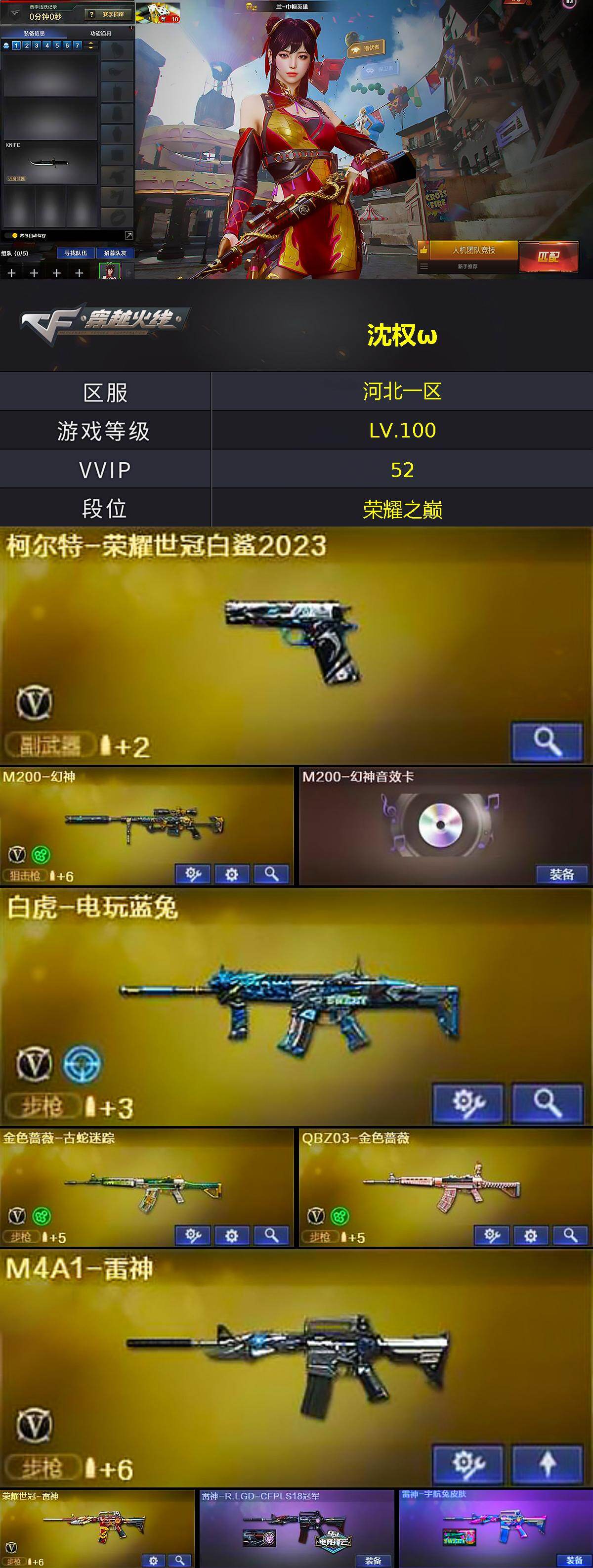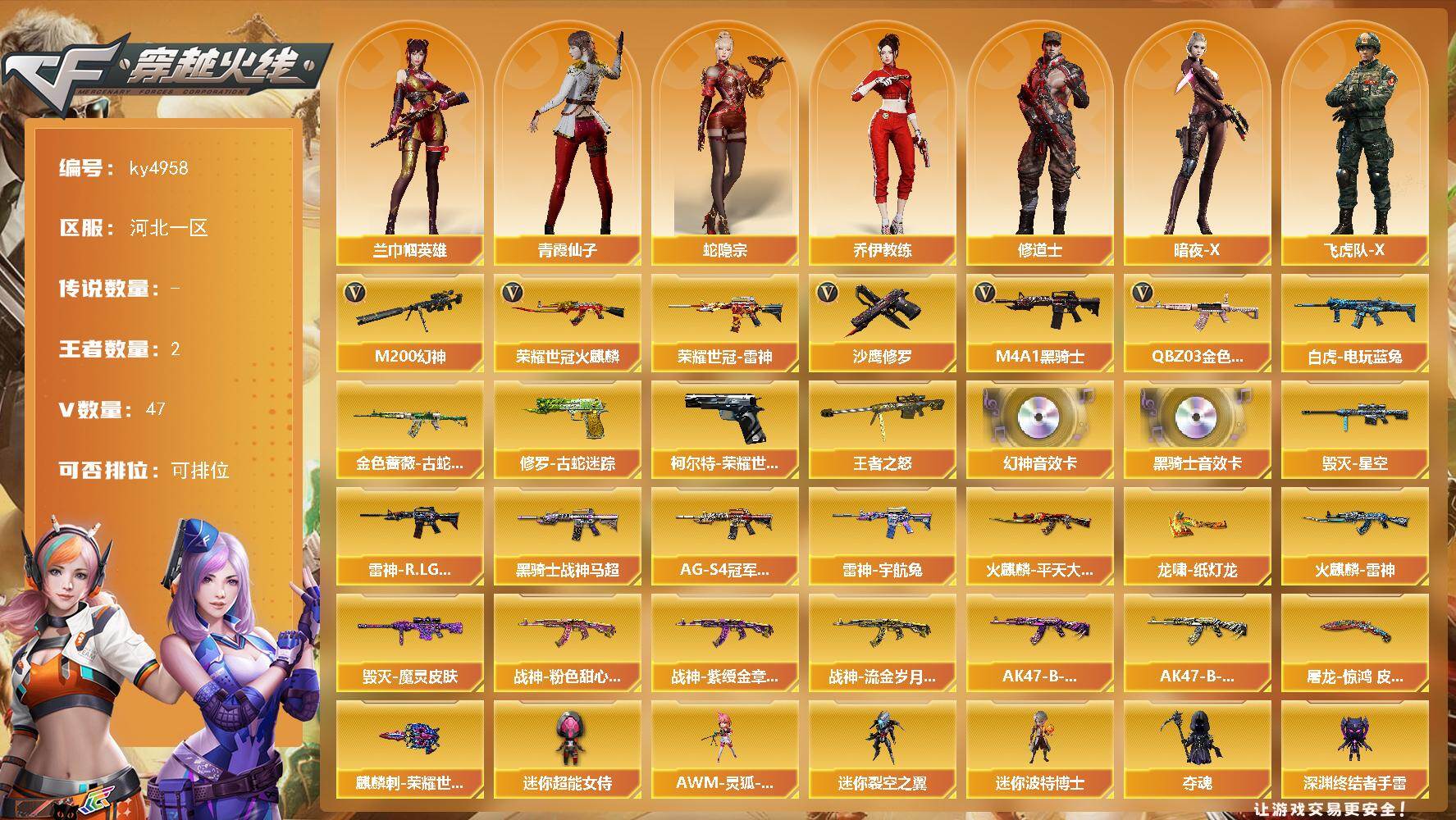 [15670630]河北一区-47V-2王者-0炫金 【热门武器】:QBZ03-金色蔷薇,M200-幻神,柯尔特-荣耀世冠白鲨2023,金色蔷薇-古蛇迷踪,修罗-古蛇迷踪,荣耀世冠-火麒麟,荣耀世冠-雷神,白虎-电玩蓝兔,M4A1-黑骑士,沙鹰-修罗*3 【王者炫金武器】:王者之怒 【音效卡】:M200-幻神音效卡,M4A1-黑骑士音效卡 【皮肤】:雷神-R.LGD-CFPLS18冠军,雷神-宇航兔皮肤,火麒麟-雷神,火麒麟-平天大圣,毁灭-星空,毁灭-魔灵皮肤,黑骑士-战神马超,黑骑士-AG-S4冠军典藏,战神-粉色甜心皮肤,战神-紫绶金章皮肤*3,战神-流金岁月皮肤*5,AK47-B-常胜将军-曹操,AK47-B-常胜将军-刘备,屠龙-惊鸿 皮肤,龙啸-纸灯龙皮肤,麒麟刺-荣耀世冠白鲨 【角色】:兰-巾帼英雄,蛇隐宗,乔伊教练,修道士,暗夜-X,飞虎队-X,风暴女,虎妞,嘉年华灵狐,灵狐者-黄金海岸,麻雀,潘多拉-X,青霞仙子,蛇姬,斯沃特-X,兔囡囡,雪莉杨-摸金校尉,夜玫瑰-幻能朋克,游珑儿 【人偶武器】:AWM-灵狐-15周年嘉年华,迷你裂空之翼,迷你波特博士,夺魂*2,深渊终结者手雷,闪光弹-小乔*2,迷你超能女侍 【暴走生化】:超级对讲机 【挑战大师】:AK47-冰龙粉碎者,冰龙粉碎者-白马银枪,激光毁灭者III-白马银枪,激光毁灭者III,神圣爆裂者-末日III*2,阐释者III 【英雄级武器】:AK47-火麒麟,M4A1-雷神,M4A1-黑骑士,无影-神兵利器,黑武士-锦绣游龙,金色蔷薇-古蛇迷踪,QBZ03-金色蔷薇,烈火-动感闪耀,AK47-B-战神,白虎-电玩蓝兔,荣耀世冠-火麒麟,荣耀世冠-雷神,Barrett-毁灭,Barrett-极光,M200-幻神,沙鹰-修罗*3,沙鹰-天神*2,柯尔特-荣耀世冠白鲨2023,天神-动感闪耀,修罗-古蛇迷踪,屠龙,擎天,擎天-竞技荣光,屠龙-动感闪耀,丛林匕首-玄豹,高爆手雷-幻灵*2,高爆手雷-竞技荣光,手雷-动感闪耀,高爆手雷-云龙,高爆手雷-古蛇迷踪,高爆手雷-玄豹,闪光弹-幻灵*2,闪光弹-竞技荣光*2,闪光弹-神工天巧,闪光弹-玄豹,闪光弹-雷霆王者-觉醒版,烟雾弹-竞技荣光*2,烟雾弹-神工天巧,烟雾弹-云龙,烟雾弹-古蛇迷踪,烟雾弹-玄豹*2,M4A1-赤狱骑士 【道具】:BS战队炫彩背包,CFS限定背包