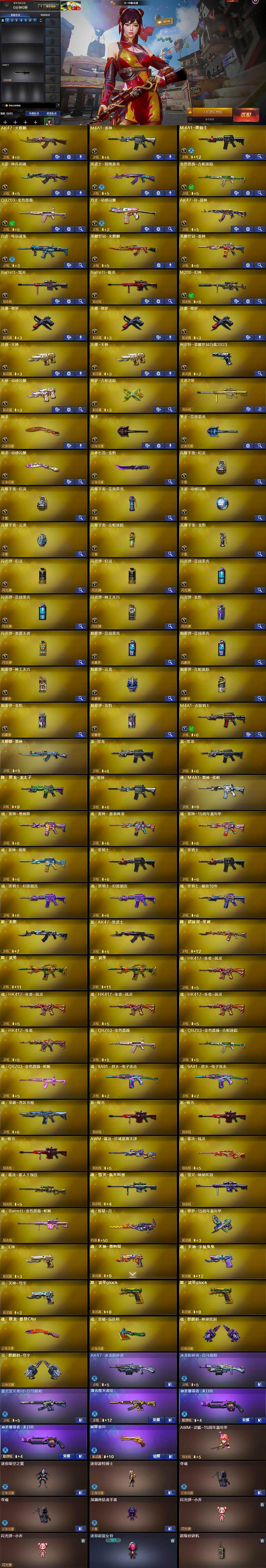 【英雄级武器】:AK47-火麒麟,M4A1-雷神,M4A1-黑骑士,无影-神兵利器,黑武士-锦绣游龙,金色蔷薇-古蛇迷踪,QBZ03-金色蔷薇,烈火-动感闪耀,AK47-B-战神,白虎-电玩蓝兔,荣耀世冠-火麒麟,荣耀世冠-雷神,Barrett-毁灭,Barrett-极光,M200-幻神,沙鹰-修罗*3,沙鹰-天神*2,柯尔特-荣耀世冠白鲨2023,天神-动感闪耀,修罗-古蛇迷踪,屠龙,擎天,擎天-竞技荣光,屠龙-动感闪耀,丛林匕首-玄豹,高爆手雷-幻灵*2,高爆手雷-竞技荣光,手雷-动感闪耀,高爆手雷-云龙,高爆手雷-古蛇迷踪,高爆手雷-玄豹,闪光弹-幻灵*2,闪光弹-竞技荣光*2,闪光弹-神工天巧,闪光弹-玄豹,闪光弹-雷霆王者-觉醒版,烟雾弹-竞技荣光*2,烟雾弹-神工天巧,烟雾弹-云龙,烟雾弹-古蛇迷踪,烟雾弹-玄豹*2,M4A1-赤狱骑士