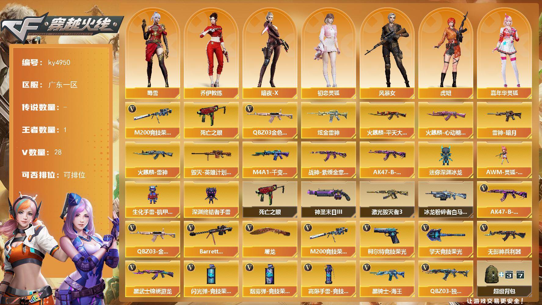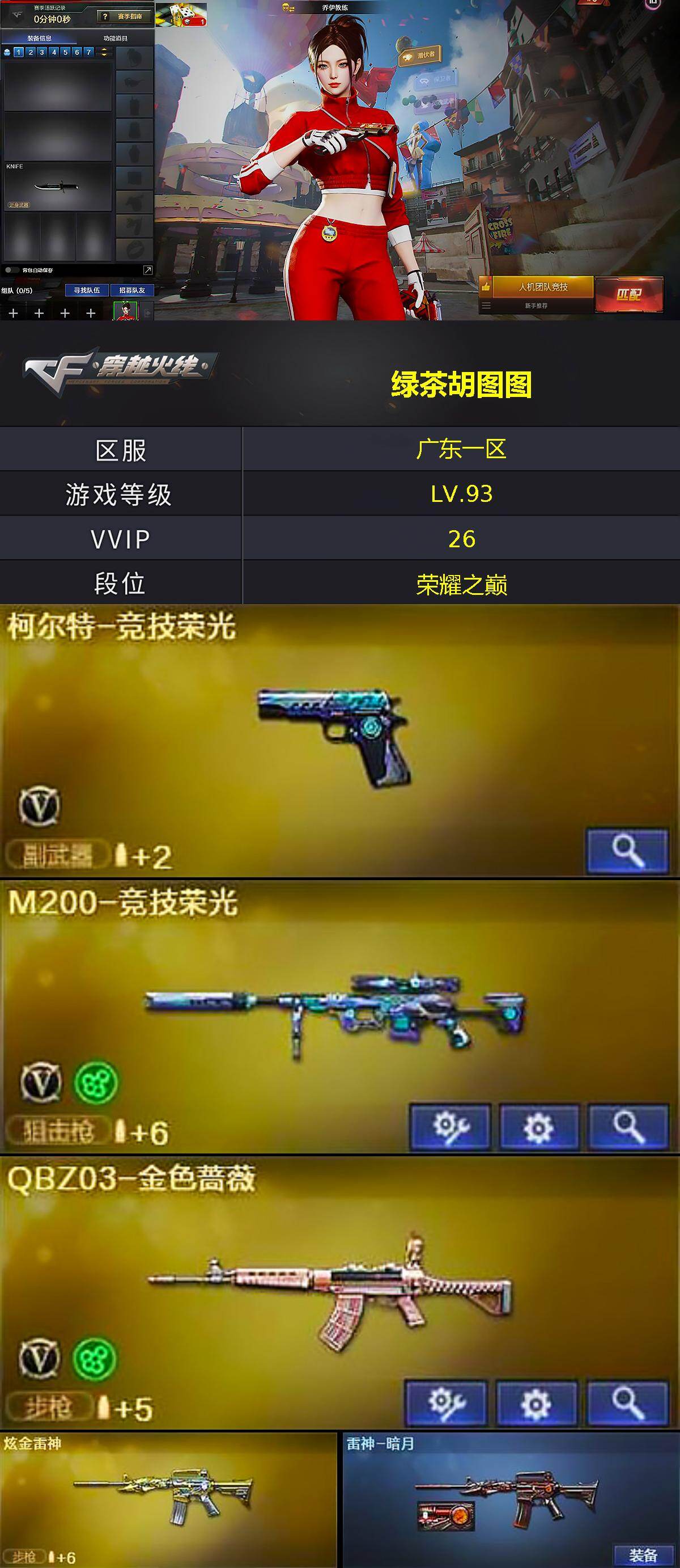 - [15245325]广东一区-59V-16王者-0炫金 【传说武器】:传说圣谕 【热门武器】:传说圣谕,QBZ03-金色蔷薇*2,HK417-朱雀,M200-幻神,金色蔷薇-古蛇迷踪,修罗-古蛇迷踪,荣耀世冠-火麒麟,白虎-电玩蓝兔,Kar98K-星神,M4A1-黑骑士,加特林-炼狱,沙鹰-修罗*2,Knife-冠军之刃*2,荣耀世冠-龙啸 【王者炫金武器】:王者雷怒 【音效卡】:M4A1-黑骑士音效卡,Barrett-毁灭音效卡,QBZ03-金色蔷薇音效卡,AWM-裁决音效卡,Barrett-碧霄极光音效卡*4,炼狱-百战金芒-庆典舞曲音效卡,死神-雪域霜狐-怀旧音效卡 【皮肤】:幻神-冠军之幻,幻神-丹凤,幻神-宠儿-2021MVP,M200-幻神-N9-2022MVP,幻神-电流骇客 皮肤,幻神-荣耀世冠EP 皮肤,QBZ03-荣耀世冠白鲨,裁决-流光秘银,雷神-暗月,雷神-荣耀之魄,雷神-传奇N9,雷神-宠儿-2019MVP,雷神-R.LGD-CFPLS18冠军,雷神-化蛇 皮肤,M4A1-再燃火线,火麒麟-巅峰荣耀,火麒麟-心动糖果,毁灭-冠军之怒,毁灭-QQ会员,毁灭-英雄计划 皮肤,M4A1-千变-孔明皮肤,M4A1-黑龙-361,黑龙-墨子皮肤,黑龙-冠军之武,黑骑士-AG-S4冠军典藏,黑骑士-破界 皮肤,死神-机甲核心皮肤,战神-紫绶金章皮肤,AK47-B-常胜将军-刘备,AK47-B-常胜将军-孙权,AWM-天龙-传奇70KG,AWM-天龙-传奇白鲨,修罗-冠军之魂,修罗-15周年嘉年华 皮肤,屠龙-QQ会员,屠龙-巅峰荣耀 皮肤,轻型军用手斧-再燃火线,擎天-冠军之击,麒麟刺-萌杀皮肤 【角色】:战地猎狐,王者零-华冠丽服,王者-迷迭香,雪域霜狐,蛇隐宗,奇洋探员,乔伊教练,修道士,云海玲珑,炽天使,暗夜-X,初恋灵狐,芳心审判者,虎妞,嘉年华灵狐,猎狐者-追月,零-水下丽影,灵狐-花神,灵狐者-X,流浪蔷薇,龙儿-小淘气,麻雀,曼陀罗-X,曼陀罗-礼服,萌儿,女主播,潘多拉-X,潘多拉-甜心教官,蛇姬,斯沃特-X,雪莉杨-摸金校尉,游珑儿 【人偶武器】:火麒麟-灵狐,海滩汪汪-巴雷特,迷你深渊冰龙,迷你裂空之翼,迷你超能女侍 【暴走生化】:超级对讲机 【挑战大师】:冰龙粉碎者-白马银枪,激光毁灭者III-白马银枪*2,机甲撕裂者III,神圣爆裂者-末日III