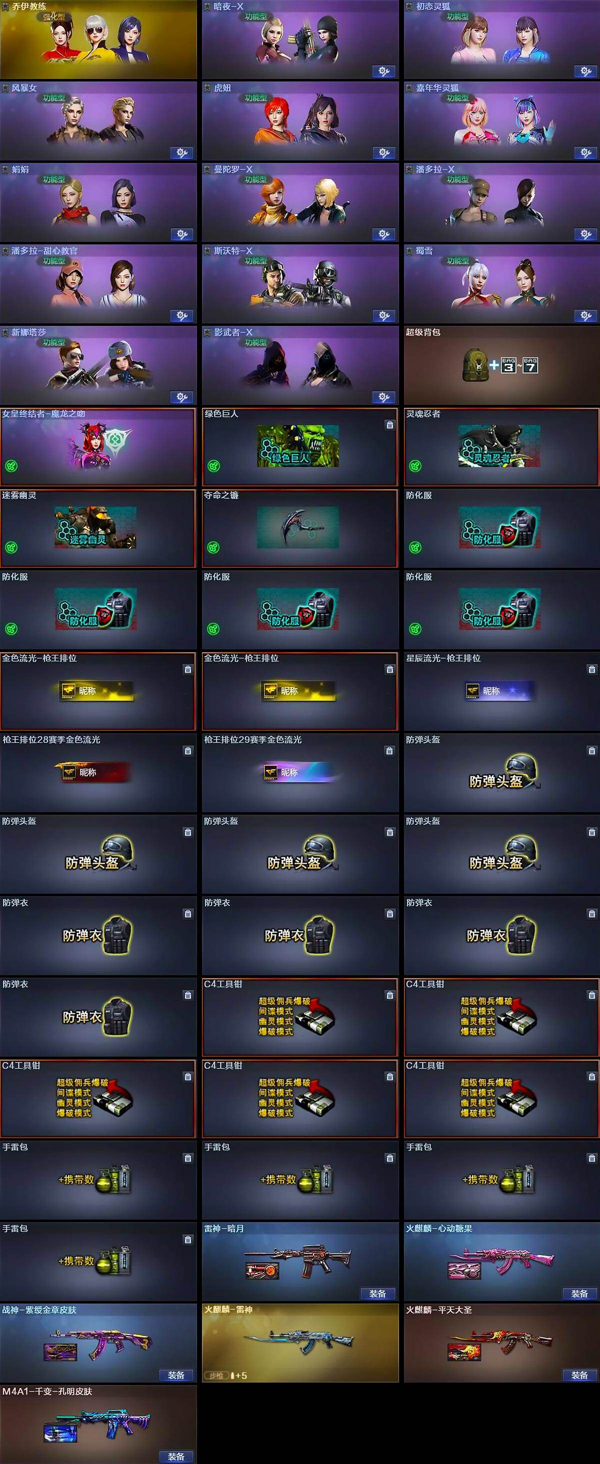 【道具】:超级背包,女皇终结者-魔龙之吻,绿色巨人,灵魂忍者,迷雾幽灵,夺命之镰,防化服*4,金色流光-枪王排位*2,星辰流光-枪王排位,枪王排位28赛季金色流光,枪王排位29赛季金色流光,防弹头盔*4,防弹衣*4,C4工具钳*5,手雷包*4