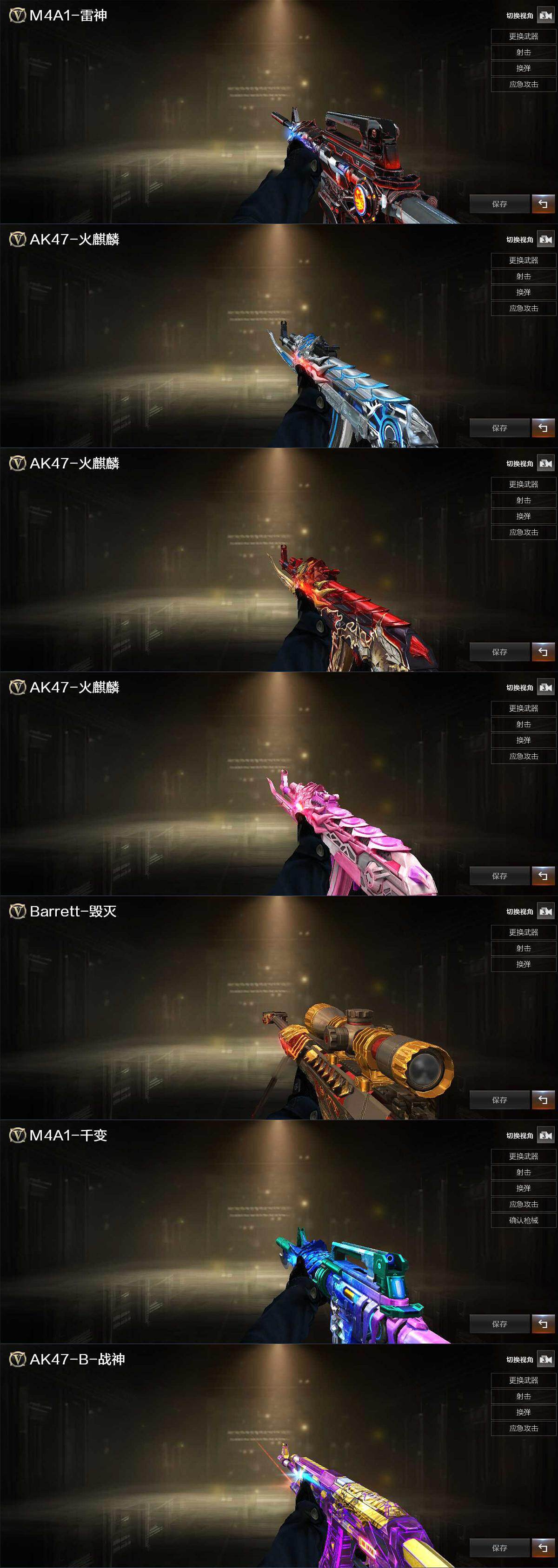 【皮肤】:雷神-暗月,火麒麟-雷神,火麒麟-平天大圣,火麒麟-心动糖果,毁灭-英雄计划 皮肤,M4A1-千变-孔明皮肤,战神-紫绶金章皮肤,AK47-B-常胜将军-曹操*2