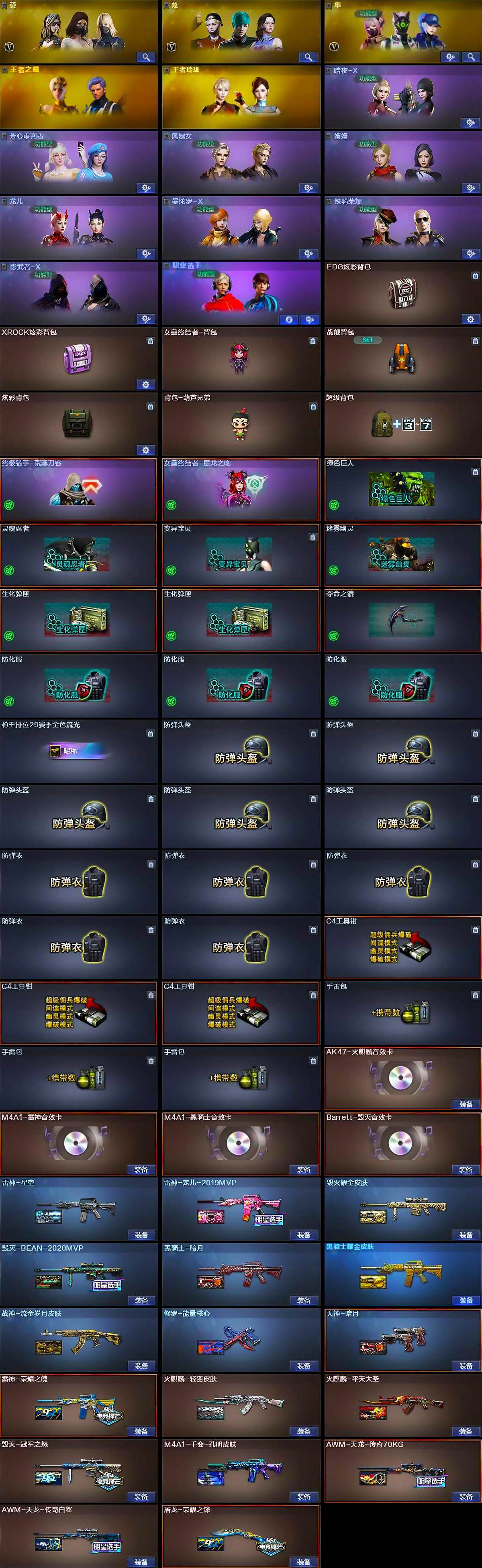 【皮肤】:雷神-荣耀之魄,雷神-星空,雷神-宠儿-2019MVP,火麒麟-轻羽皮肤,火麒麟-平天大圣,毁灭耀金皮肤,毁灭-冠军之怒,毁灭-BEAN-2020MVP,M4A1-千变-孔明皮肤,黑骑士-暗月,黑骑士耀金皮肤,战神-流金岁月皮肤,AK47-B-常胜将军-曹操*2,AK47-B-常胜将军-刘备,AK47-B-常胜将军-孙权,AWM-天龙-传奇70KG,AWM-天龙-传奇白鲨,修罗-能量核心,天神-暗月,屠龙-荣耀之锋