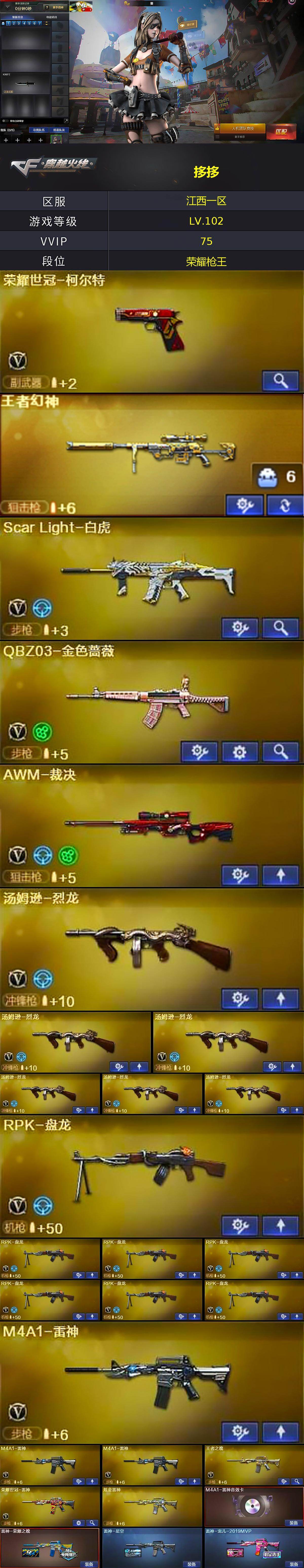 【热门武器】:王者幻神,QBZ03-金色蔷薇,Scar Light-白虎,死亡之眼*2,荣耀世冠-雷神,荣耀世冠-柯尔特,M4A1-黑骑士*2,汤姆逊-烈龙*6,RPK-盘龙*7,加特林-炼狱,COP 357-雷霆王者,沙鹰-修罗*5,荣耀世冠-龙啸,金刚伞