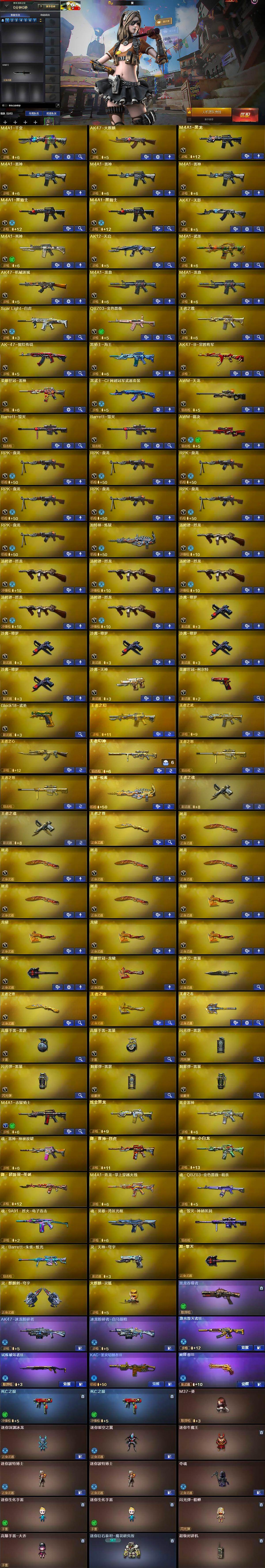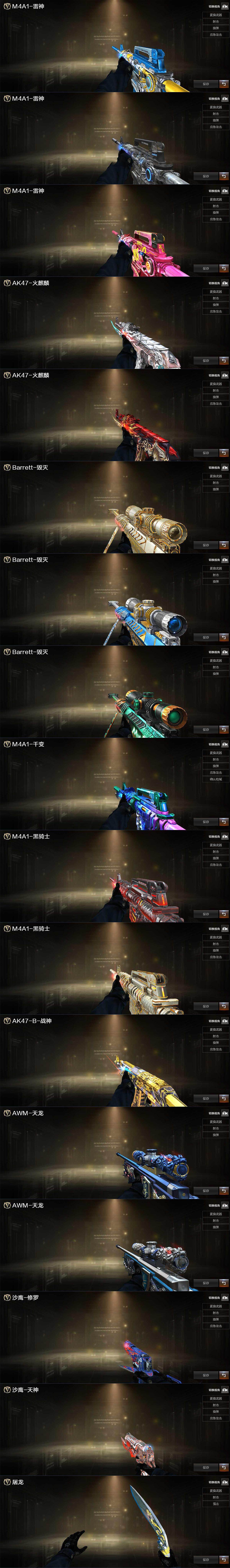 【英雄级武器】:M4A1-千变,AK47-火麒麟,M4A1-黑龙,M4A1-雷神*3,M4A1-黑骑士*2,AK47-无影,M4A1-死神,AK12-天启,M4A1-武圣,AK47-机械迷城,M4A1-龙血*2,Scar Light-白虎,QBZ03-金色蔷薇,王者之魄-觉醒版,AK-47-猩红传说,黑骑士-海王,AK47-B-常胜将军,荣耀世冠-雷神,黑武士-CF网剧冠军,AWM-天龙,Barrett-毁灭*2,AWM-裁决,RPK-盘龙*7,加特林-炼狱,汤姆逊-烈龙*6,沙鹰-修罗*5,沙鹰-天神,荣耀世