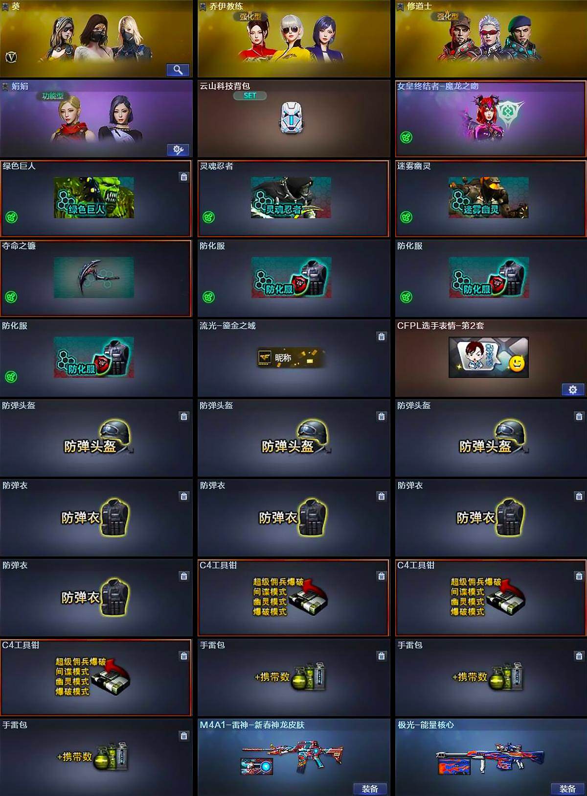 【道具】:云山科技背包,女皇终结者-魔龙之吻,绿色巨人,灵魂忍者,迷雾幽灵,夺命之镰,防化服*3,流光-鎏金之域,CFPL选手表情-第2套,防弹头盔*3,防弹衣*4,C4工具钳*3,手雷包*3