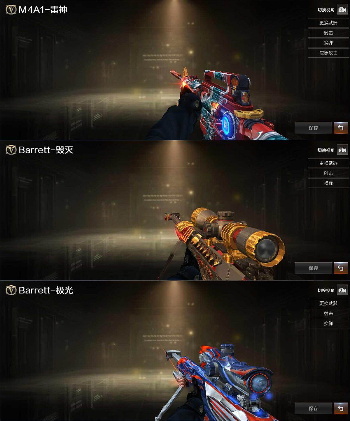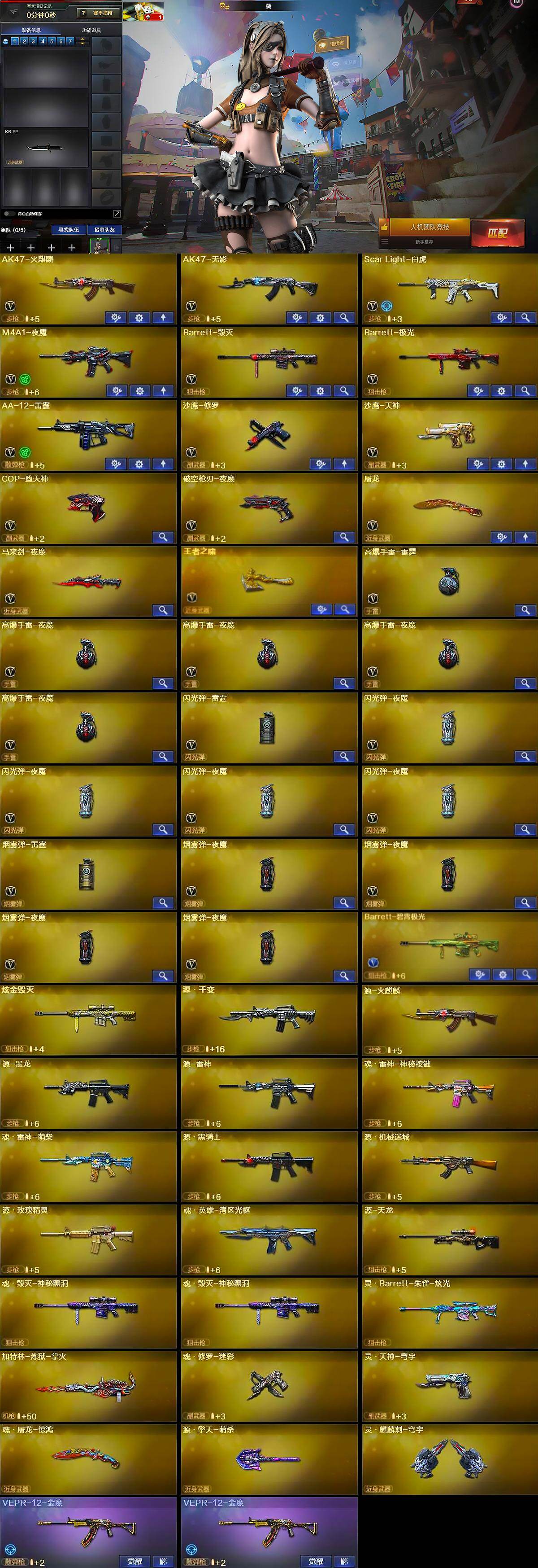 【英雄级武器】:AK47-火麒麟,AK47-无影,Scar Light-白虎,M4A1-夜魔,Barrett-毁灭,Barrett-极光,AA-12-雷霆,沙鹰-修罗,沙鹰-天神,COP-堕天神,破空枪刃-夜魔,屠龙,马来剑-夜魔,王者之啸-觉醒版,高爆手雷-雷霆,高爆手雷-夜魔*4,闪光弹-雷霆,闪光弹-夜魔*4,烟雾弹-雷霆,烟雾弹-夜魔*4,Barrett-碧霄极光
