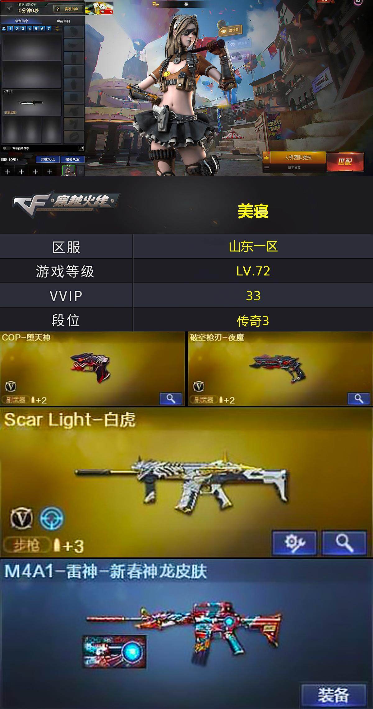 [15671597]山东一区-33V-1王者-1炫金 【热门武器】:Scar Light-白虎,COP-堕天神,沙鹰-修罗 【王者炫金武器】:炫金毁灭 【皮肤】:M4A1-雷神-新春神龙皮肤,毁灭-英雄计划 皮肤,极光-能量核心 【角色】:葵,乔伊教练,修道士,娟娟 【挑战大师】:VEPR-12-金魔*2 【英雄级武器】:AK47-火麒麟,AK47-无影,Scar Light-白虎,M4A1-夜魔,Barrett-毁灭,Barrett-极光,AA-12-雷霆,沙鹰-修罗,沙鹰-天神,COP-堕天神,破空枪刃-夜魔,屠龙,马来剑-夜魔,王者之啸-觉醒版,高爆手雷-雷霆,高爆手雷-夜魔*4,闪光弹-雷霆,闪光弹-夜魔*4,烟雾弹-雷霆,烟雾弹-夜魔*4,Barrett-碧霄极光 【道具】:云山科技背包,女皇终结者-魔龙之吻,绿色巨人,灵魂忍者,迷雾幽灵,夺命之镰,防化服*3,流光-鎏金之域,CFPL选手表情-第2套,防弹头盔*3,防弹衣*4,C4工具钳*3,手雷包*3 【特殊枪械】:1白虎
