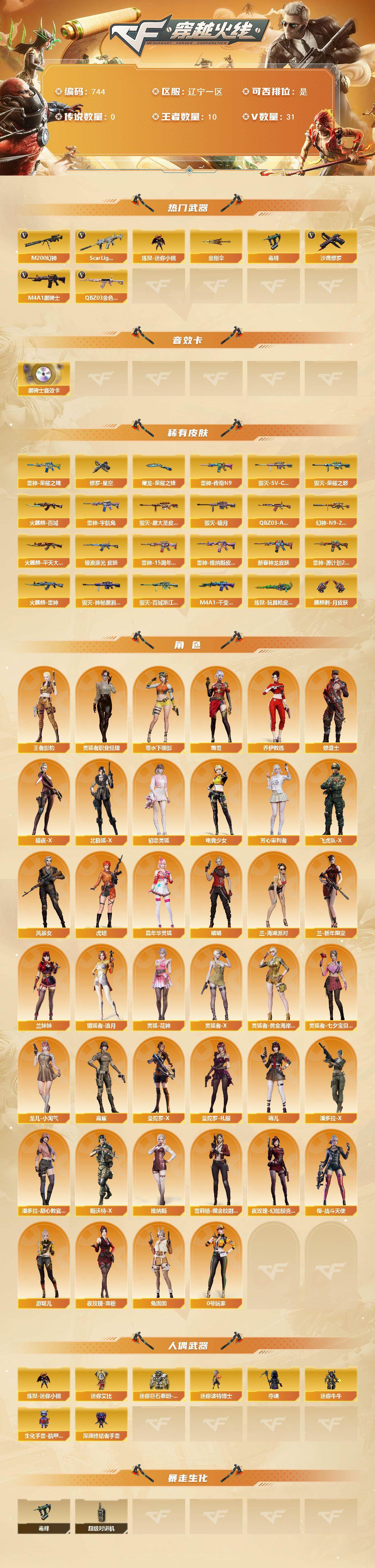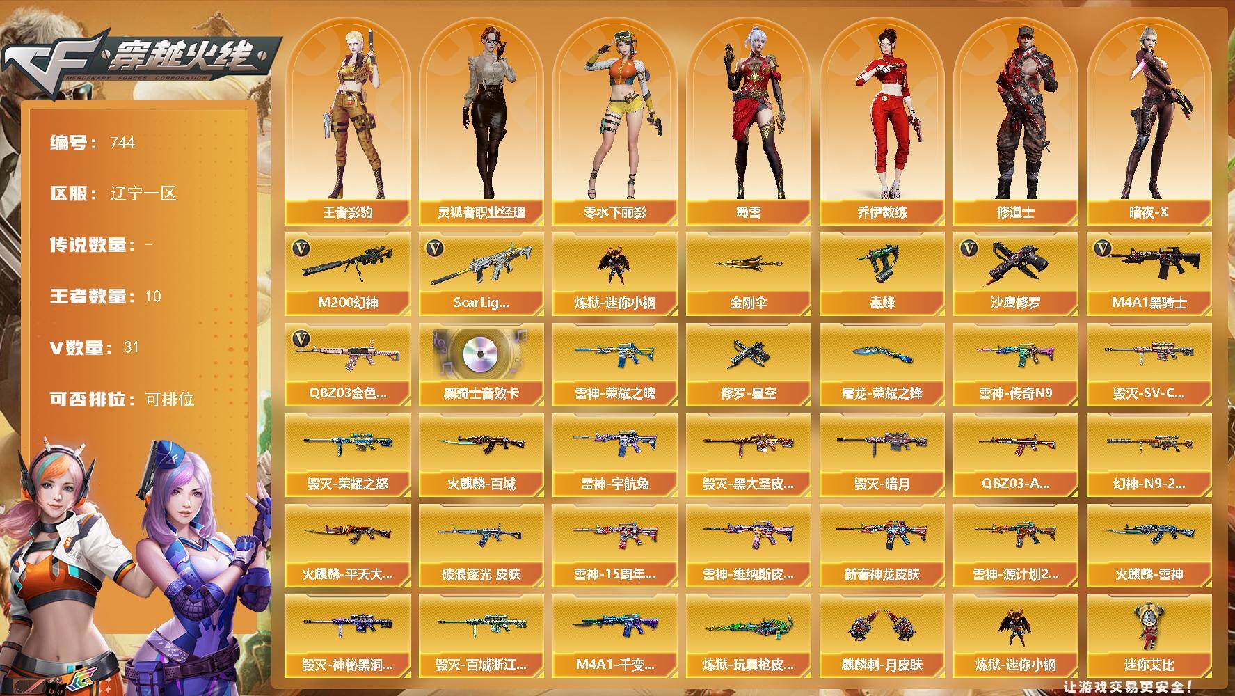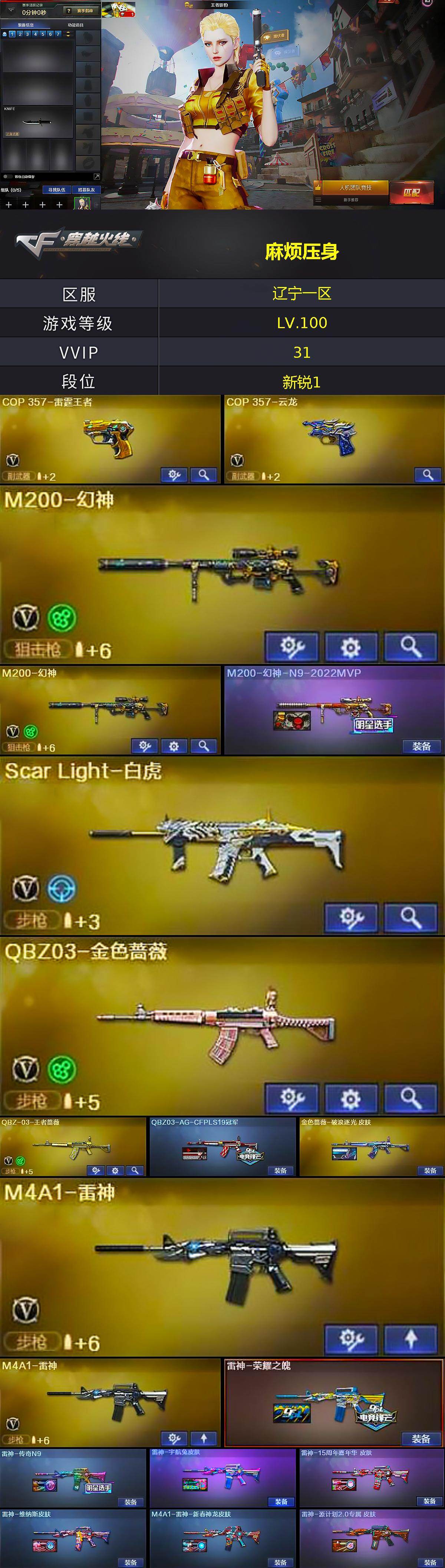 [15672159]辽宁一区-31V-10王者-0炫金 【热门武器】:QBZ03-金色蔷薇,Scar Light-白虎,M200-幻神*2,炼狱-迷你小钢,毒蜂,M4A1-黑骑士,沙鹰-修罗,金刚伞 【音效卡】:M4A1-黑骑士音效卡 【皮肤】:M200-幻神-N9-2022MVP,QBZ03-AG-CFPLS19冠军,金色蔷薇-破浪逐光 皮肤,雷神-荣耀之魄,雷神-传奇N9,雷神-宇航兔皮肤,雷神-15周年嘉年华 皮肤,雷神-维纳斯皮肤,M4A1-雷神-新春神龙皮肤,雷神-源计划2.0专属 皮肤,火麒麟-雷神,火麒麟-平天大圣*2,火麒麟-百城,毁灭-暗月,毁灭-荣耀之怒,毁灭-SV-CFPLS16冠军,毁灭-黑大圣皮肤,毁灭-神秘黑洞皮肤,毁灭-百城浙江 皮肤,M4A1-千变-孔明皮肤,炼狱-玩具枪皮肤,修罗-星空,屠龙-荣耀之锋,麒麟刺-月皮肤 【角色】:王者影豹,乔伊教练,修道士,暗夜-X,北极狐-X,初恋灵狐,电竞少女,芳心审判者,飞虎队-X,风暴女,虎妞,嘉年华灵狐,娟娟,兰-海滩派对,兰-新年限定,兰妹妹,猎狐者-追月,0号玩家,零-水下丽影,灵狐-花神,灵狐者-X,灵狐者-黄金海岸,灵狐者-七夕宝贝,灵狐者-职业经理,龙儿-小淘气,麻雀,曼陀罗-X,曼陀罗-礼服,萌儿,潘多拉-X,潘多拉-甜心教官,斯沃特-X,蜀雪,兔囡囡,维纳斯,雪莉杨-摸金校尉,夜玫瑰-幻能朋克,夜玫瑰-宠粉,樱-战斗天使,游珑儿 【人偶武器】:炼狱-迷你小钢,迷你波特博士,夺魂*2,迷你牛牛,生化手雷-机甲核心*2,深渊终结者手雷*2,迷你艾比,迷你巨石泰坦-魔花研究所 【暴走生化】:毒蜂,超级对讲机 【挑战大师】:冰龙粉碎者-白马银枪,激光毁灭者III-白马银枪*3,激光毁灭者III,神圣爆裂者-末日III*2 【英雄级武器】:AK47-火麒麟,M4A1-雷神*2,M4A1-黑骑士,Scar Light-白虎,无影-神兵利器,黑武士-锦绣游龙,QBZ03-金色蔷薇,QBZ-03-王者蔷薇-觉醒版,Barrett-毁灭,M200-幻神*2,王者之霆-觉醒版,沙鹰-修罗,COP 357-雷霆王者-觉醒版,COP 357-云龙,屠龙,麒麟刺*2,高爆手雷-竞技荣光,高爆手雷-神工天巧,高爆手雷-云龙*5,闪光弹-幻灵*2,闪光弹-神工天巧*3,闪光弹-云龙*2,闪光弹-雷霆王者-觉醒版*5,烟雾弹-
