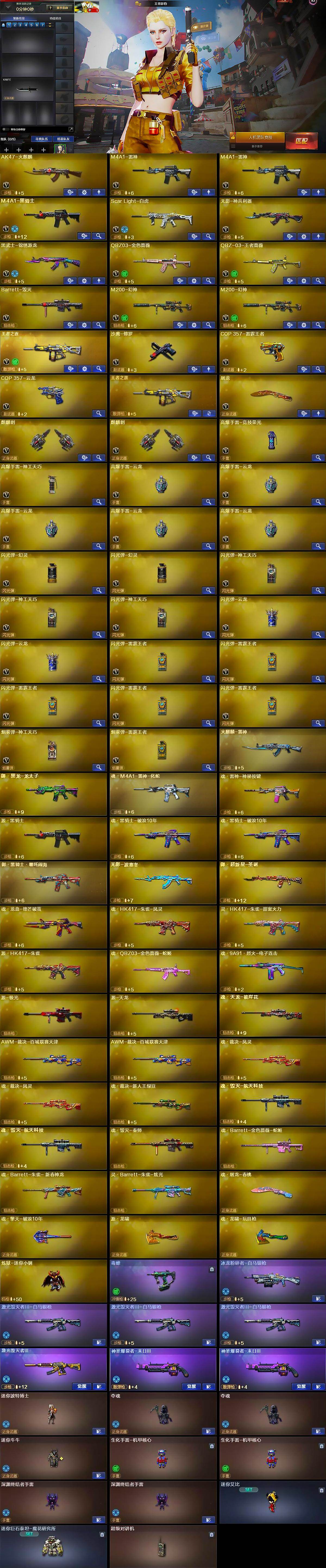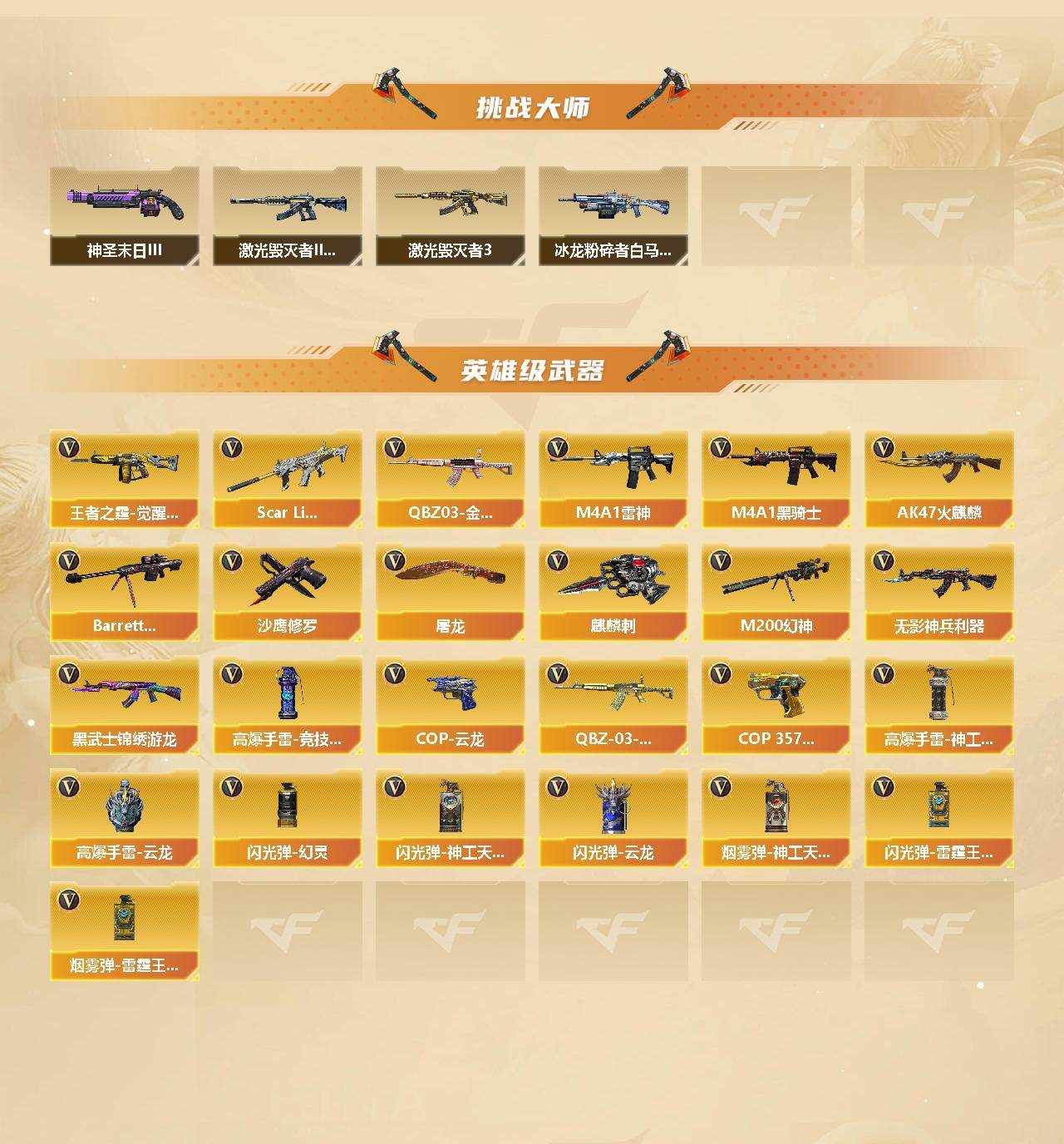 【英雄级武器】:AK47-火麒麟,M4A1-雷神*2,M4A1-黑骑士,Scar Light-白虎,无影-神兵利器,黑武士-锦绣游龙,QBZ03-金色蔷薇,QBZ-03-王者蔷薇-觉醒版,Barrett-毁灭,M200-幻神*2,王者之霆-觉醒版,沙鹰-修罗,COP 357-雷霆王者-觉醒版,COP 357-云龙,屠龙,麒麟刺*2,高爆手雷-竞技荣光,高爆手雷-神工天巧,高爆手雷-云龙*5,闪光弹-幻灵*2,闪光弹-神工天巧*3,闪光弹-云龙*2,闪光弹-雷霆王者-觉醒版*5,烟雾弹-