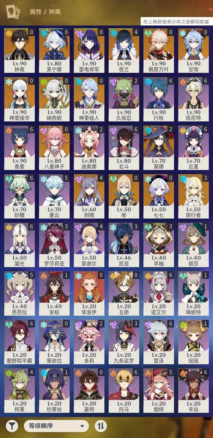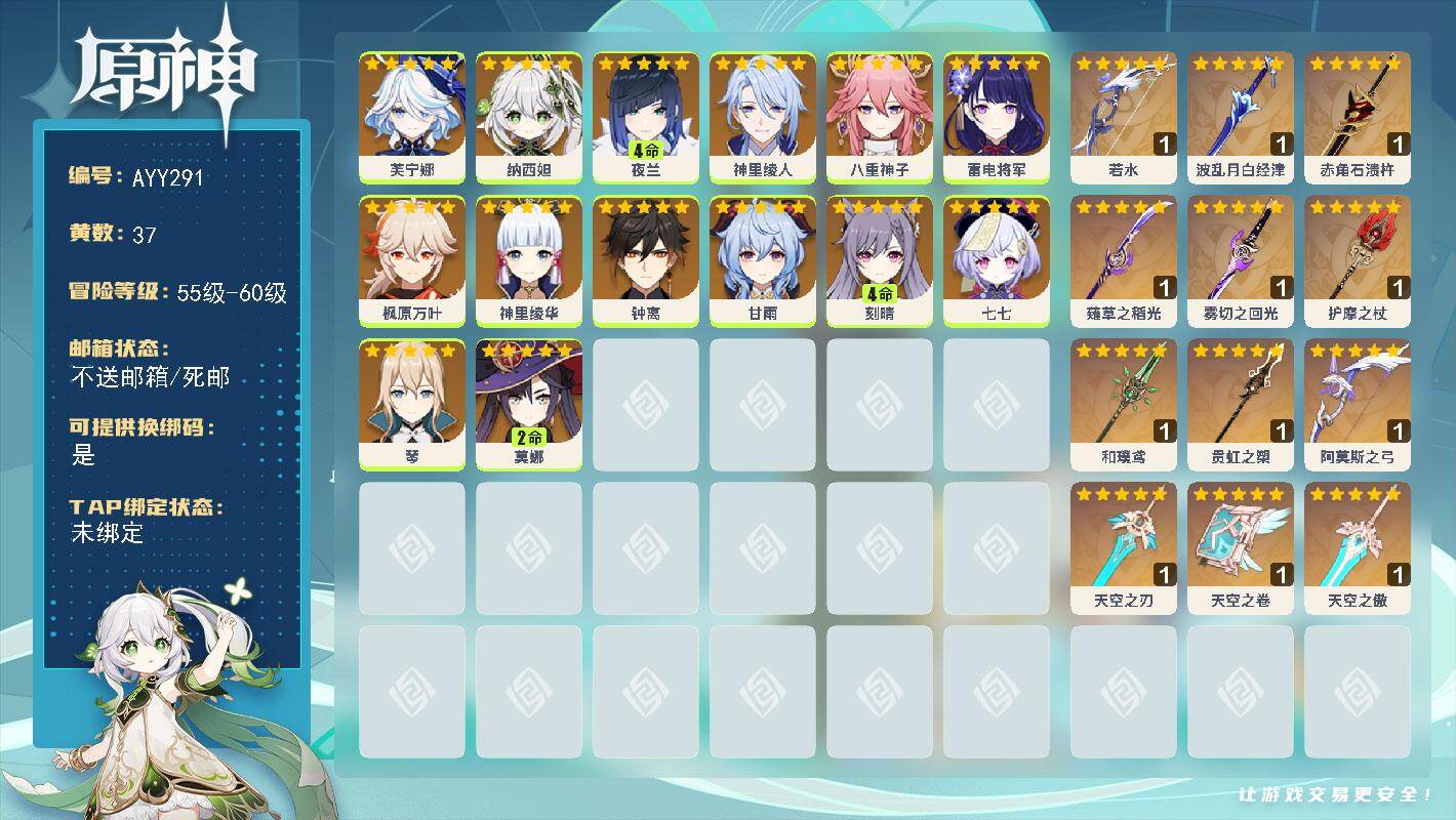 [15672193]57级/37黄/女主/14个五星角色/13个五星武器 0命芙宁娜,0命纳西妲,4命夜兰,0命神里绫人,0命八重神子,0命雷电将军,0命枫原万叶,0命神里绫华,0命钟离,0命甘雨,4命刻晴,0命七七,0命琴,2命莫娜,精1若水,精1波乱月白经津,精1赤角石溃杵,精1薙草之稻光,精1雾切之回光,精1护摩之杖,精1和璞鸢,精1贯虹之槊,精1阿莫斯之弓,精1天空之刃,精1天空之卷,精1天空之傲