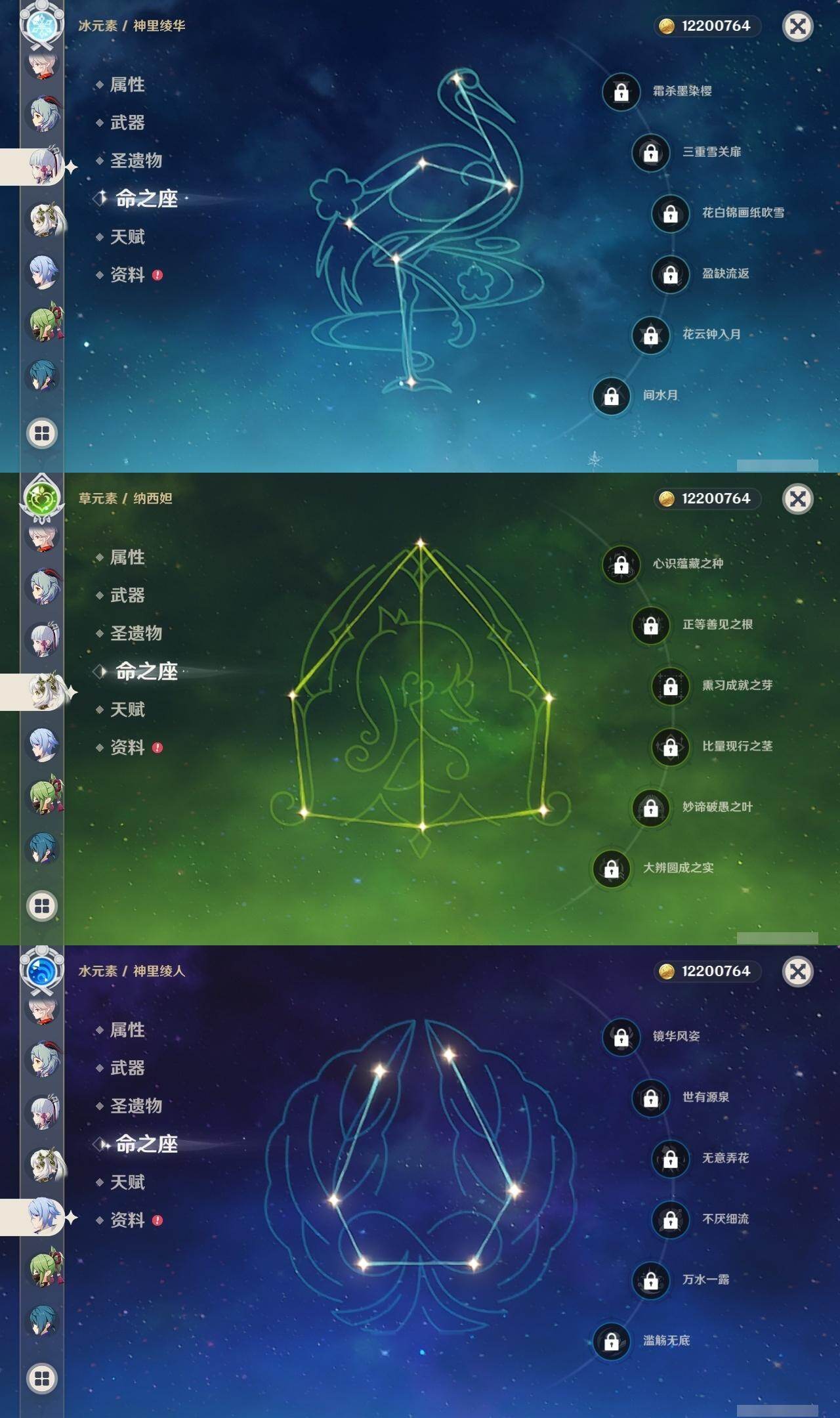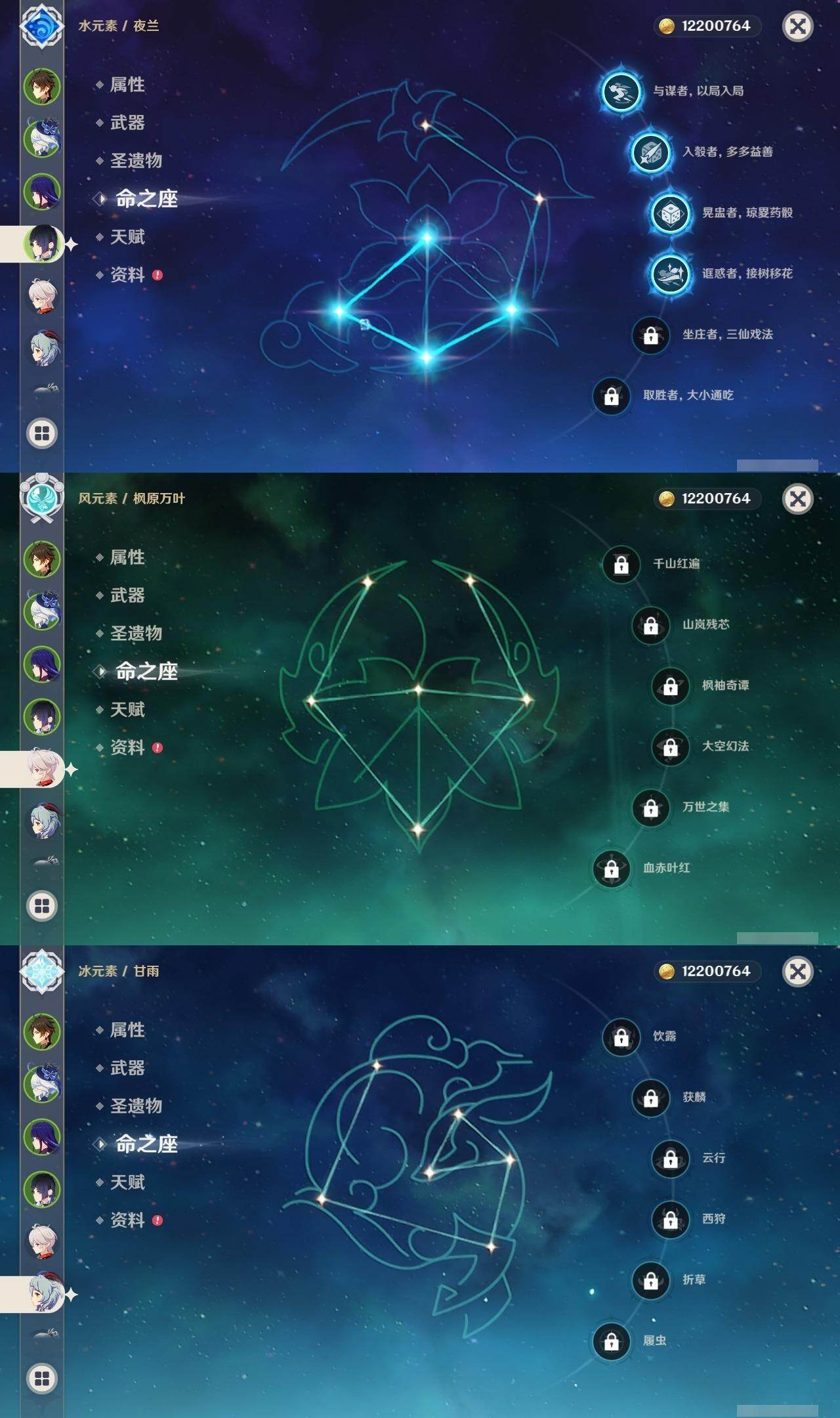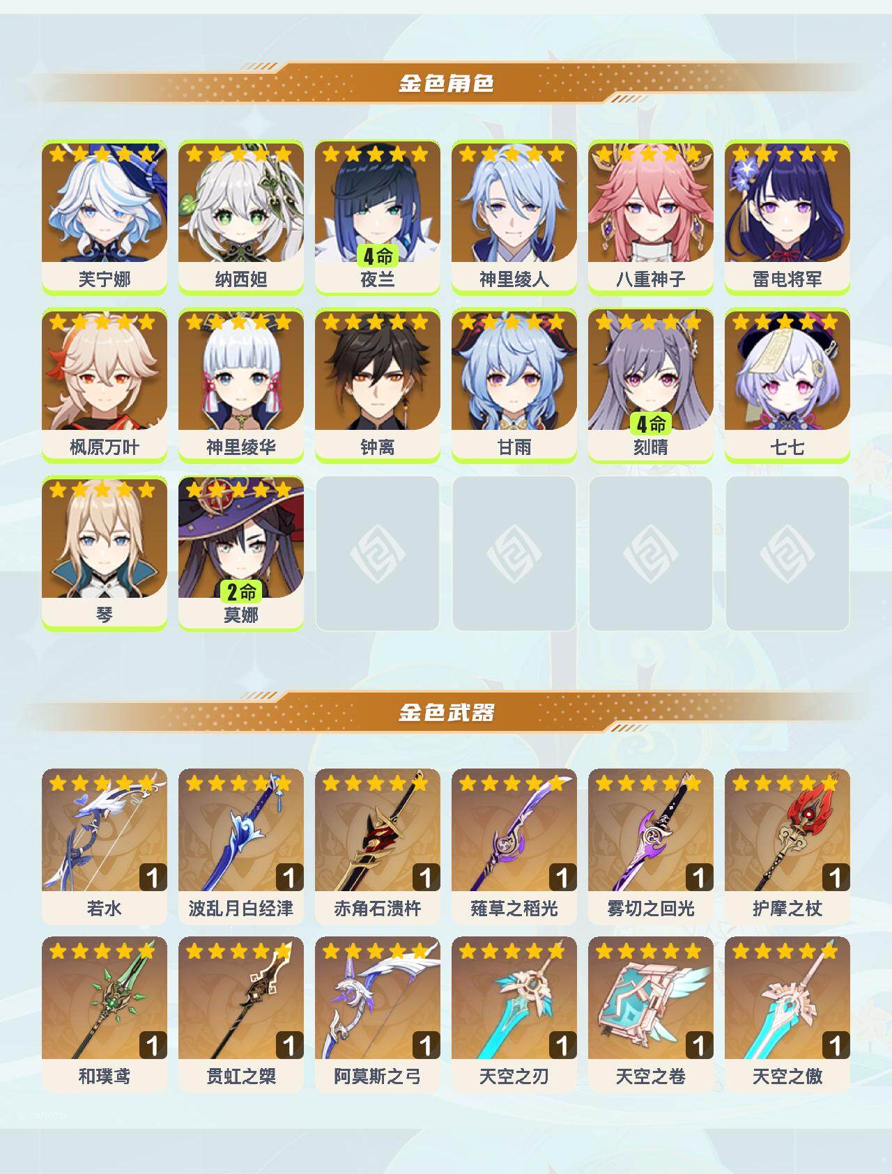 0命芙宁娜,0命纳西妲,4命夜兰,0命神里绫人,0命八重神子,0命雷电将军,0命枫原万叶,0命神里绫华,0命钟离,0命甘雨,4命刻晴,0命七七,0命琴,2命莫娜,精1若水,精1波乱月白经津,精1赤角石溃杵,精1薙草之稻光,精1雾切之回光,精1护摩之杖,精1和璞鸢,精1贯虹之槊,精1阿莫斯之弓,精1天空之刃,精1天空之卷,精1天空之傲