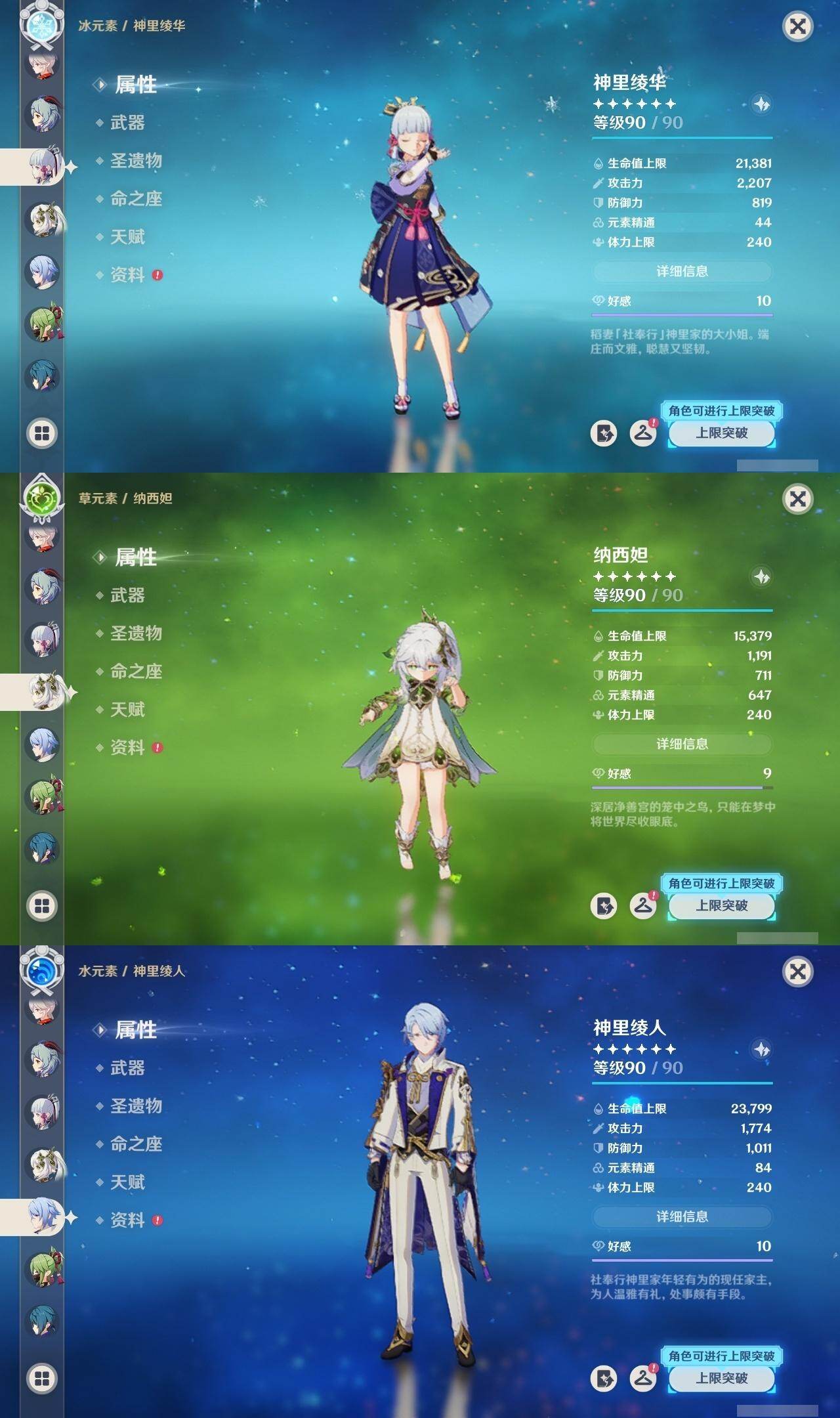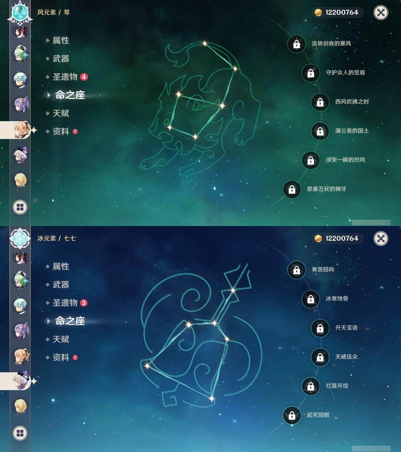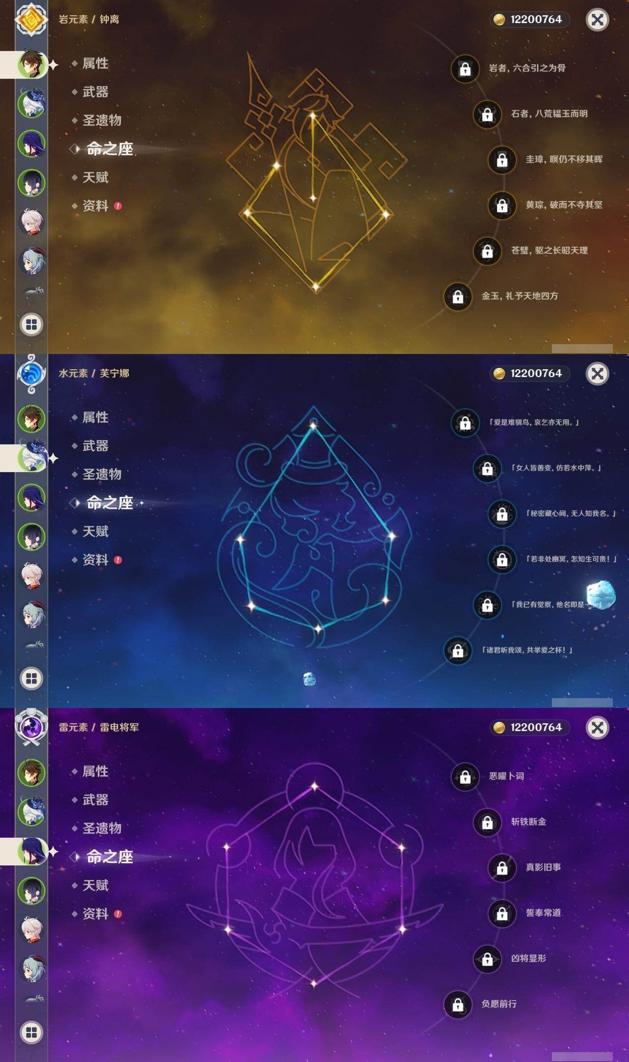 0命芙宁娜,0命纳西妲,4命夜兰,0命神里绫人,0命八重神子,0命雷电将军,0命枫原万叶,0命神里绫华,0命钟离,0命甘雨,4命刻晴,0命七七,0命琴,2命莫娜,精1若水,精1波乱月白经津,精1赤角石溃杵,精1薙草之稻光,精1雾切之回光,精1护摩之杖,精1和璞鸢,精1贯虹之槊,精1阿莫斯之弓,精1天空之刃,精1天空之卷,精1天空之傲