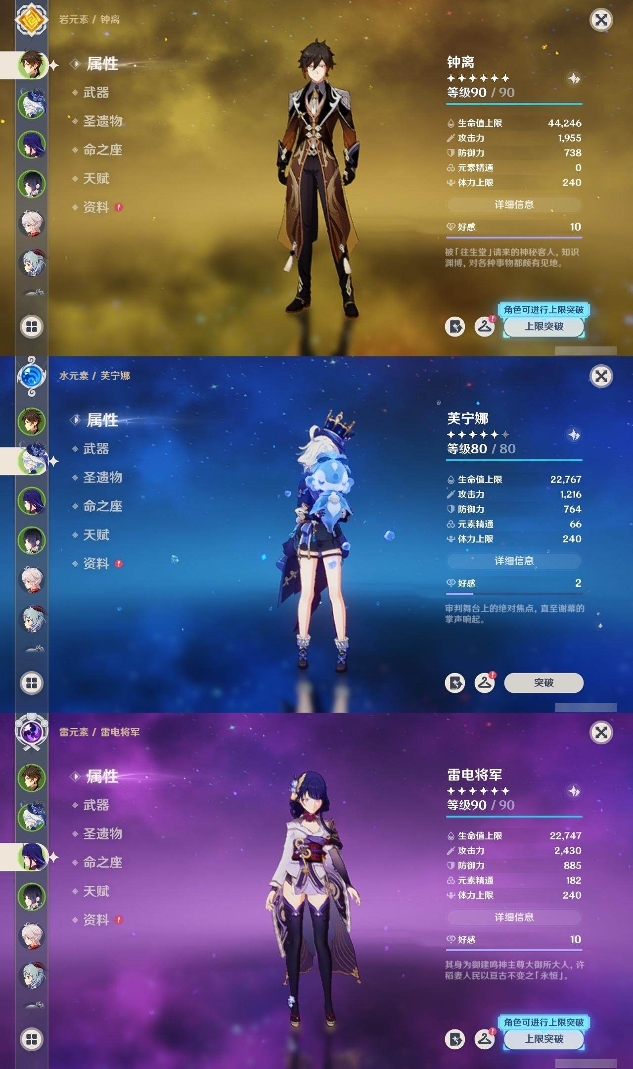 钟离,雷电将军,枫原万叶,甘雨,神里凌华,八重神子,莫娜,刻晴,琴,七七