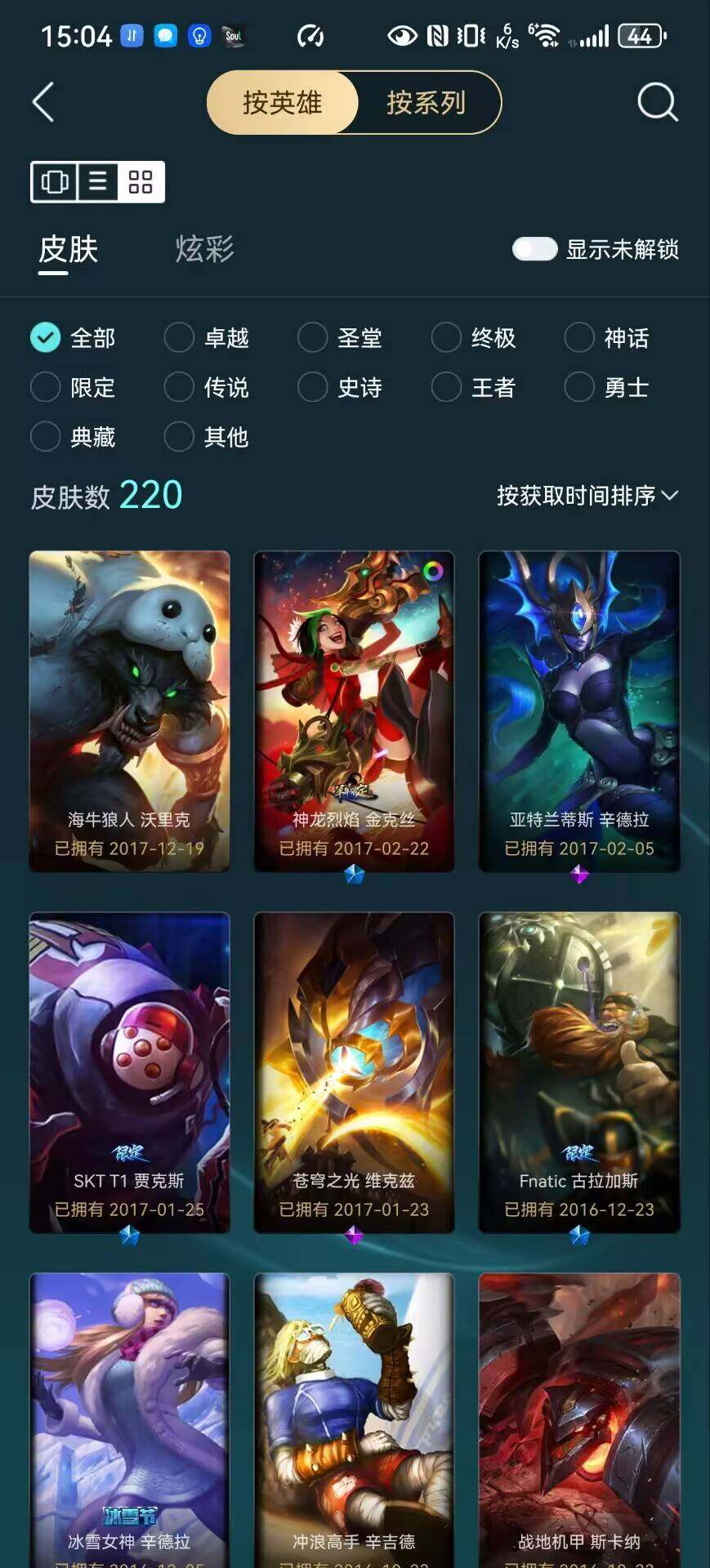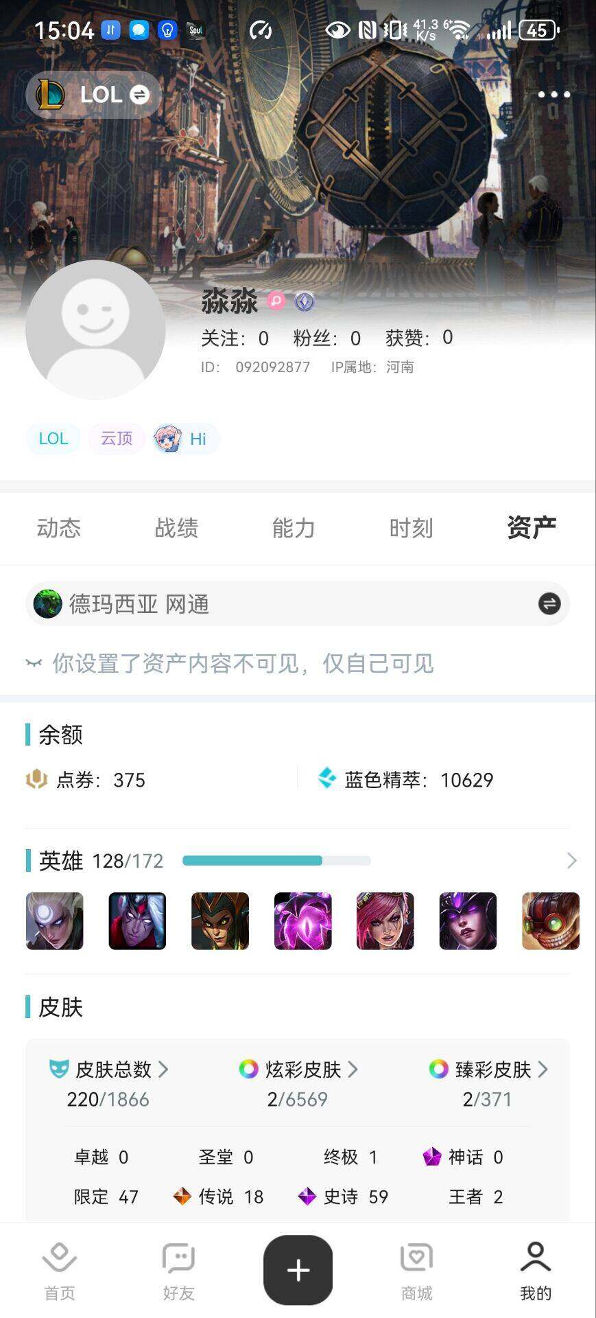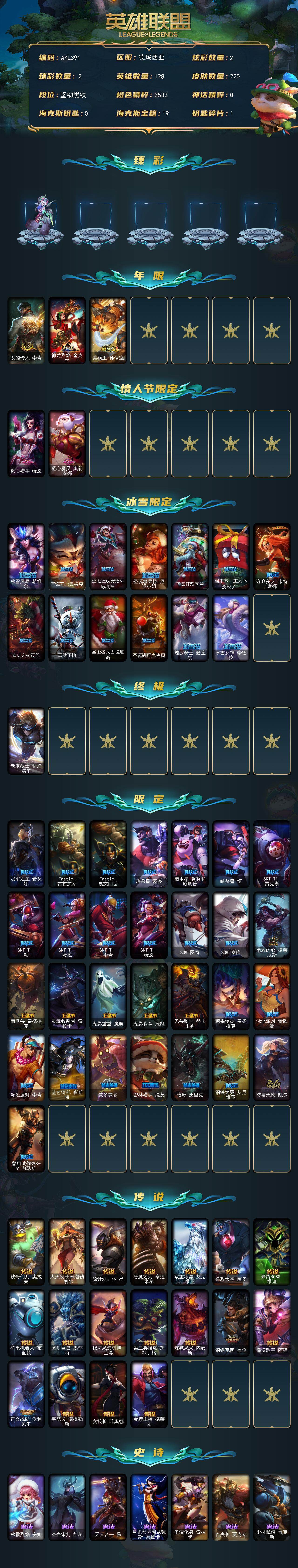 [15672346]未定级段位-128英雄-220皮肤-2炫彩-1终极-0神话-47限定-18传说-59史诗