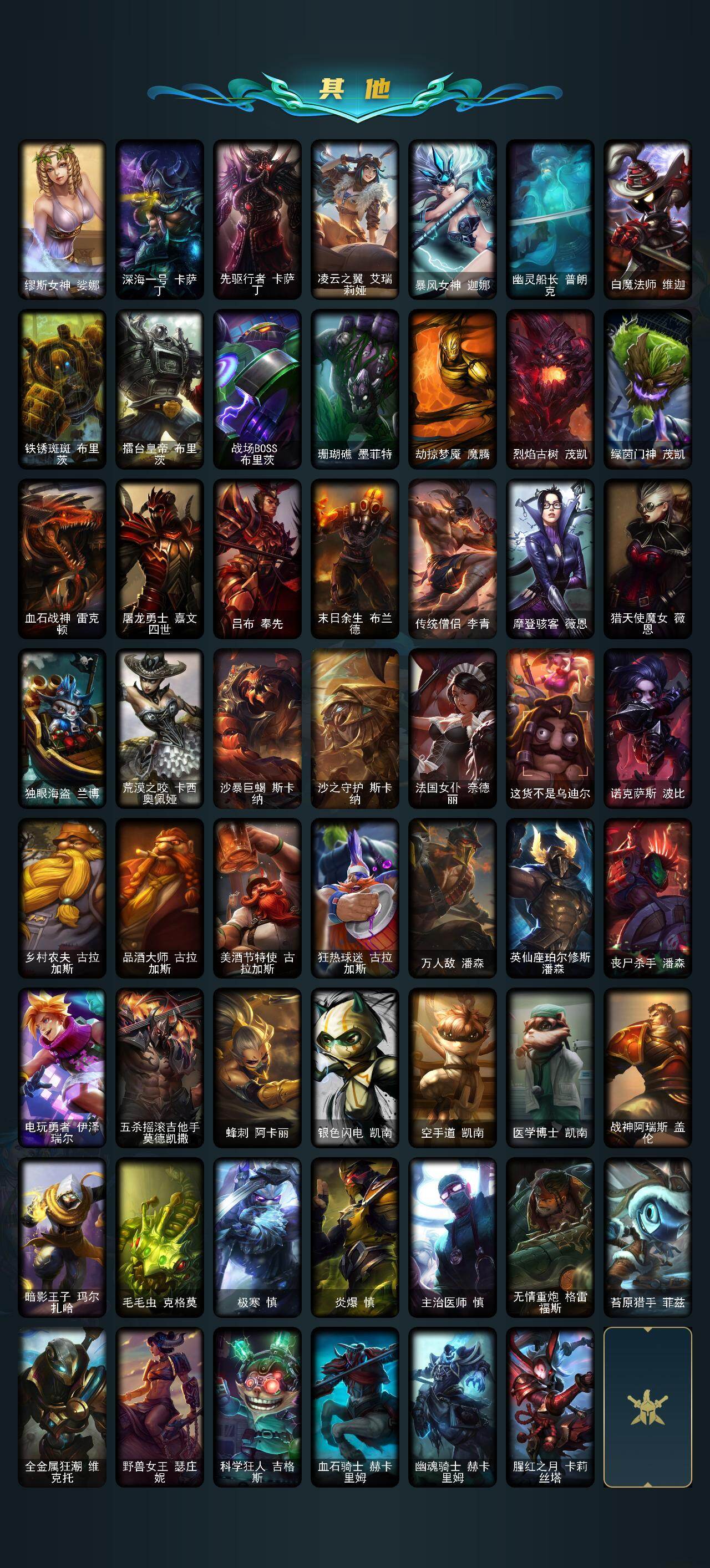 【史诗皮肤】:冰霜烈焰安妮,圣光审判凯尔,天人合一易,月光女神阿忒弥斯索拉卡,圣洁化身索拉卡,百夫长贾克斯,少林武僧贾克斯,炼金狂士辛吉德,熔火之心拉莫斯,飞越疯人院萨科,武动巅峰萨科,战争血统蒙多,掠星魔刃卡萨丁,夜刃艾瑞莉娅,穿着正装的恶魔维迦,北领前线斯维因,抵抗军天使凯特琳,霸天巨兽墨菲特,前线指挥官卡特琳娜,蓝焰梦魔魔腾,凯旋英雄嘉文四世,灵骨工匠奥莉安娜,三昧真火孙悟空,V字仇杀者布兰德,至高之拳李青,深海妖姬卡西奥佩娅,战地机甲斯卡纳,法老王朝内瑟斯,血色之锤波比,飞车暴走族古拉加斯,死亡领主莫德凯撒,实习护士阿卡丽,钢铁烈阳蕾欧娜,兔女郎锐雯,帝王斑蝶克格莫,深海怪鱼克格莫,钢之逆鳞希瓦娜,虚空海灵菲兹,铁血猎人雷恩加尔,暗黑武士雷恩加尔,铁血帝皇德莱厄斯,刀锋女王丽桑卓,血羽凤