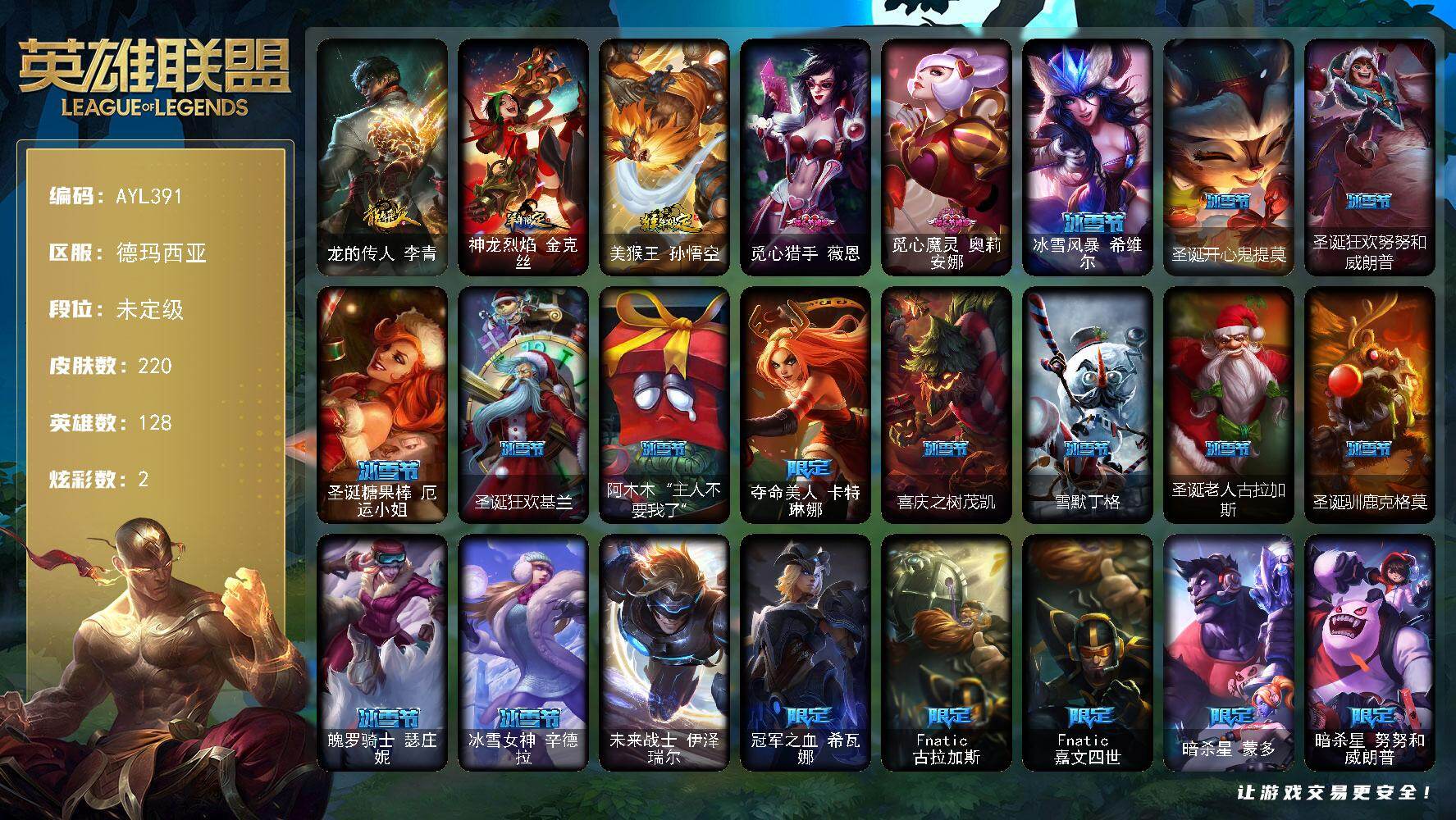 [15672346]未定级段位-128英雄-220皮肤-2炫彩-1终极-0神话-47限定-18传说-59史诗 【臻彩皮肤】:魔女阿卡丽虚荣,净雪之月莫甘娜冬虹 【年限皮肤】:龙的传人李青,神龙烈焰金克丝,美猴王孙悟空 【情人节限定】:觅心猎手薇恩,觅心魔灵奥莉安娜 【冰雪限定】:冰雪风暴希维尔,圣诞开心鬼提莫,圣诞狂欢努努和威朗普,圣诞糖果棒厄运小姐,圣诞狂欢基兰,阿木木“主人不要我了”,夺命美人卡特琳娜,喜庆之树茂凯,雪默丁格,圣诞老人古拉加斯,圣诞驯鹿克格莫,魄罗骑士瑟庄妮,冰雪女神辛德拉 【终极皮肤】:未来战士伊泽瑞尔 【限定皮肤】:冠军之血希瓦娜,Fnatic古拉加斯,Fnatic嘉文四世,暗杀星蒙多,暗杀星努努和威朗普,暗杀星慎,SKTT1贾克斯,SKTT1劫,SKTT1婕拉,SKTT1李青,SKTT1薇恩,SSW图奇,SSW泰隆,勇敢的心德莱厄斯,南瓜头费德提克,灵魂收割者索拉卡,鬼影重重魔腾,鬼影森森茂凯,无头骑士赫卡里姆,糖果使徒费德提克,泳池派对蕾欧娜,泳池派对李青,蓝色忧郁崔斯特,蒙多蒙多,密林猎手提莫,暗影沃里克,钢铁之翼艾尼维亚,防暴天使凯尔,警用试作体K9内瑟斯 【传说皮肤】:铁哥们儿奥拉夫,大天使长米迦勒凯尔,源计划林易,恶魔之刃泰达米尔,双重冰晶艾尼维亚,律政大亨蒙多,最终BOSS维迦,苹果机器人布里茨,冰川巨兽墨菲特,银河魔装机神兰博,第三类接触黑默丁格,炼狱魔犬内瑟斯,钢铁军团盖伦,偶像歌手阿狸,符文战熊沃利贝尔,宇航员诺提勒斯,女校长菲奥娜,金牌主播德莱文 【史诗皮肤】:冰霜烈焰安妮,圣光审判凯尔,天人合一易,月光女神阿忒弥斯索拉卡,圣洁化身索拉卡,百夫长贾克斯,少林武僧贾克斯,炼金狂士辛吉德,熔火之心拉莫斯,飞越疯人院萨科,武动巅峰萨科,战争血统蒙多,掠星魔刃卡萨丁,夜刃艾瑞莉娅,穿着正装的恶魔维迦,北领前线斯维因,抵抗军天使凯特琳,霸天巨兽墨菲特,前线指挥官卡特琳娜,蓝焰梦魔魔腾,凯旋英雄嘉文四世,灵骨工匠奥莉安娜,三昧真火孙悟空,V字仇杀者布兰德,至高之拳李青,深海妖姬卡西奥佩娅,战地机甲斯卡纳,法老王朝内瑟斯,血色之锤波比,飞车暴走族古拉加斯,死亡领主莫德凯撒,实习护士阿卡丽,钢铁烈阳蕾欧娜,兔女郎锐雯,帝王斑蝶克格莫,深海怪鱼克格莫,钢之逆鳞希瓦娜,虚空海灵菲兹,铁血猎人雷恩加尔,暗黑武士雷恩加尔,铁血帝皇德莱厄斯,刀锋女王丽桑卓,血羽凤