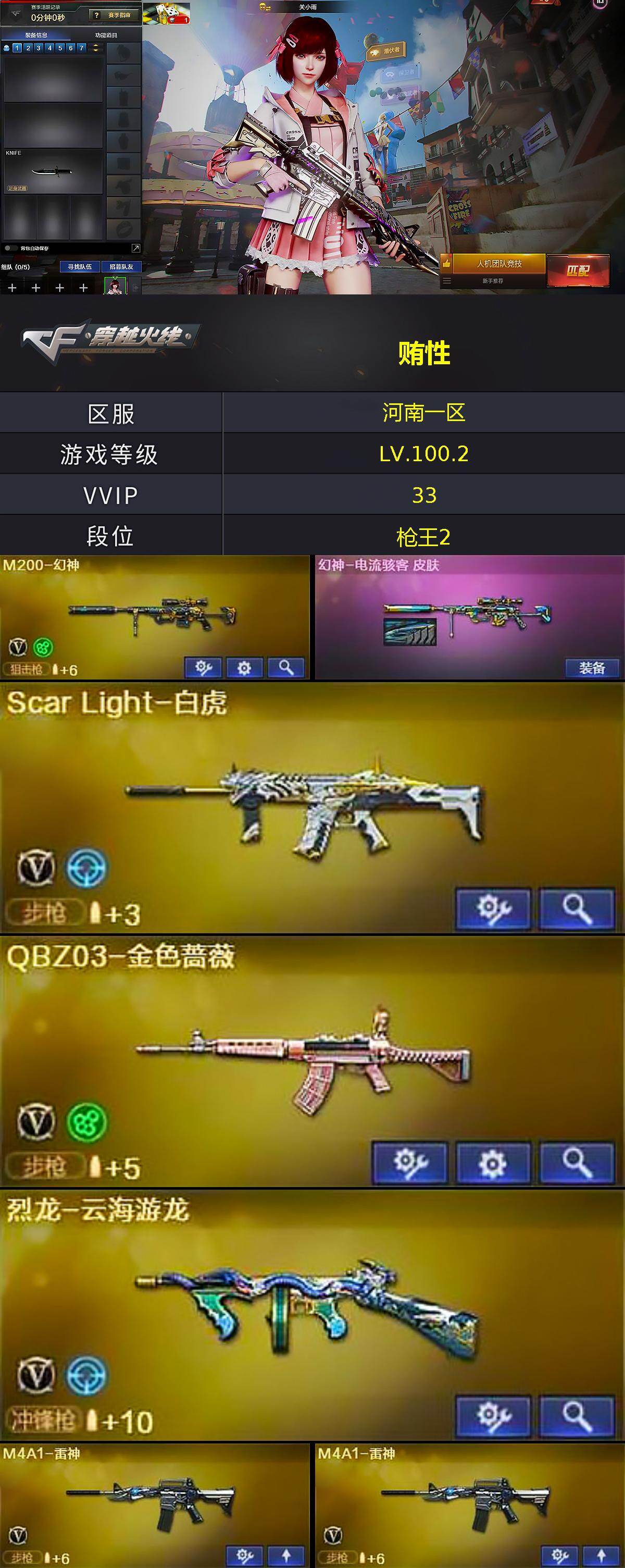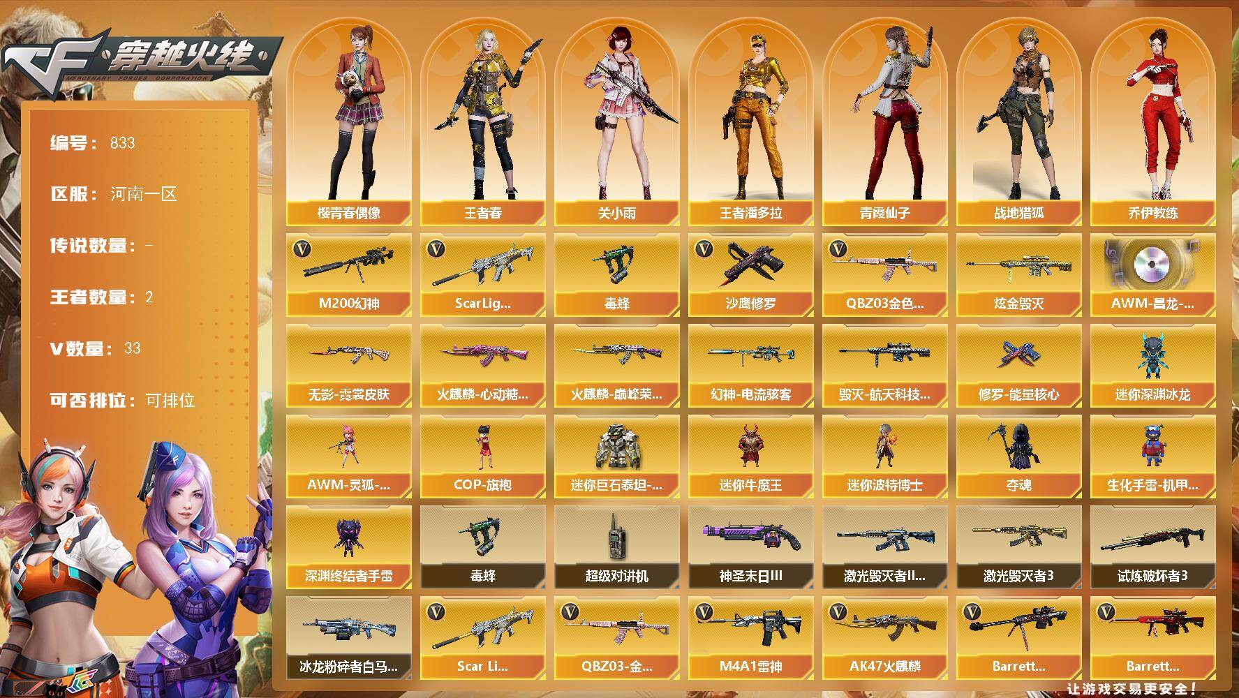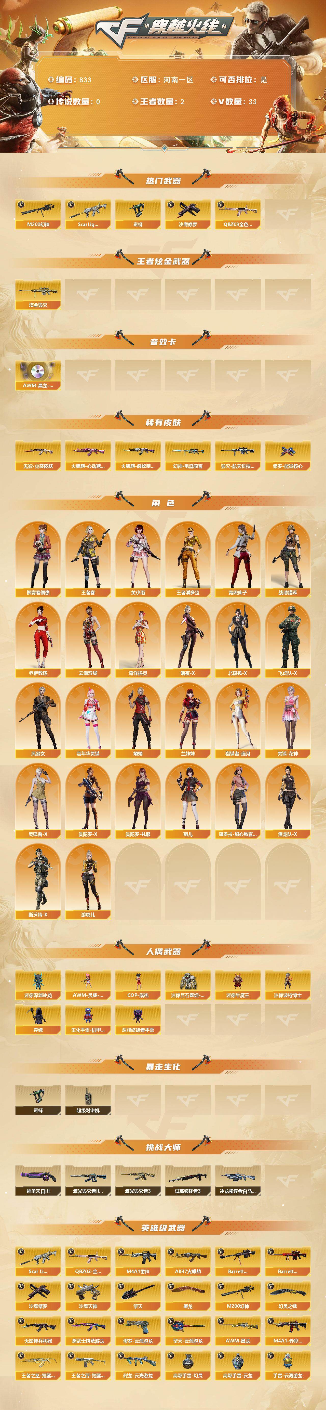 [15672654]河南一区-33V-2王者-1炫金 【热门武器】:QBZ03-金色蔷薇,Scar Light-白虎,M200-幻神,毒蜂,沙鹰-修罗 【王者炫金武器】:炫金毁灭 【音效卡】:AWM-昌龙-怀旧音效卡*2 【皮肤】:幻神-电流骇客 皮肤,火麒麟-巅峰荣耀,火麒麟-心动糖果,毁灭-航天科技皮肤,无影-霓裳皮肤,修罗-能量核心 【角色】:关小雨,战地猎狐,王者春,王者潘多拉,奇洋探员,乔伊教练,云海玲珑,暗夜-X,北极狐-X,飞虎队-X,风暴女,嘉年华灵狐,娟娟,兰妹妹,猎狐者-追月,灵狐-花神,灵狐者-X,曼陀罗-X,曼陀罗-礼服,萌儿,潘多拉-甜心教官,潜龙队-X,青霞仙子,斯沃特-X,樱-青春偶像,游珑儿 【人偶武器】:AWM-灵狐-15周年嘉年华,COP-旗袍,迷你深渊冰龙,迷你牛魔王,迷你波特博士*2,夺魂,生化手雷-机甲核心,深渊终结者手雷,迷你巨石泰坦-魔花研究所 【暴走生化】:毒蜂,超级对讲机 【挑战大师】:冰龙粉碎者-白马银枪,激光毁灭者III-白马银枪,激光毁灭者III,试炼破坏者III,神圣爆裂者-末日III 【英雄级武器】:AK47-火麒麟,M4A1-雷神*2,Scar Light-白虎,无影-神兵利器,黑武士-锦绣游龙,QBZ03-金色蔷薇,王者之鲨-觉醒版,王者之烈-觉醒版,Barrett-毁灭,Barrett-极光,M200-幻神,烈龙-云海游龙,沙鹰-修罗,沙鹰-天神,修罗-云海游龙,屠龙,擎天,幻灵之锋,擎天-云海游龙,高爆手雷-幻灵*2,高爆手雷-云龙*2,手雷-云海游龙,闪光弹-幻灵,闪光弹-云龙,烟雾弹-幻灵*2,烟雾弹-云龙,M4A1-赤狱骑士,AWM-昌龙 【道具】:BS战队炫彩背包,CFS限定背包,云山科技背包,云海游龙炫彩背包,全能枪王背包,奇洋探员-海龟背包,炫彩背包,背包-洛丽塔,裂空之翼背包-金色,超级背包,女皇终结者-魔龙之吻,救世主-黑桃战神,黄金生化钩,绿色巨人,灵魂忍者*3,变异宝贝,迷雾幽灵*3,生化弹匣,夺命之镰,防化服*3,金色流光-枪王排位*2,星辰流光-枪王排位,流光-鎏金之域,流光-再燃火线,枪王排位28赛季金色流光,枪王排位29赛季金色流光,电玩兔兔表情,动感闪耀表情,云海游龙表情*2,CFPL选手表情-第1套,CFPL选手表情-第2套,EP战队名片,C4-再燃火线,防弹头盔*6,防弹衣*6,C4
