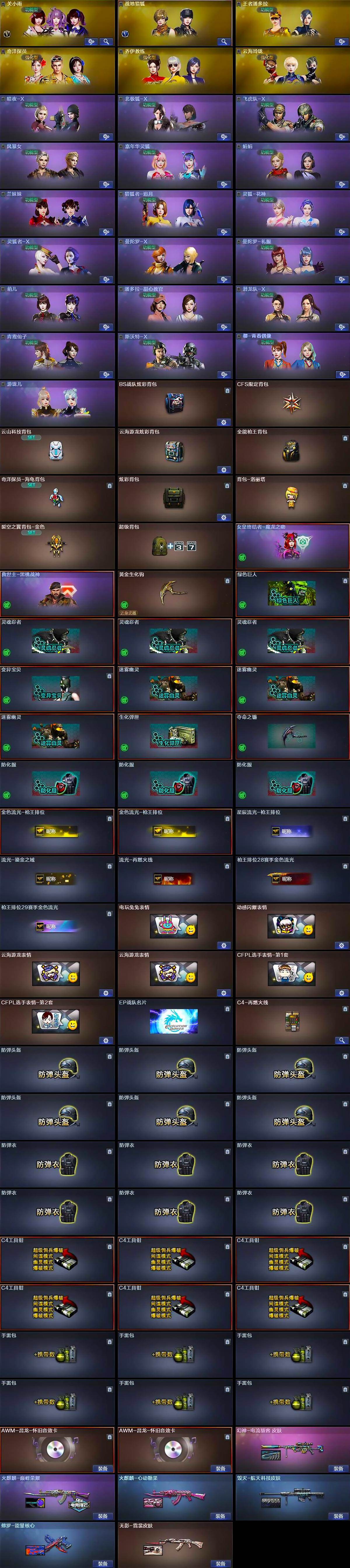 【道具】:BS战队炫彩背包,CFS限定背包,云山科技背包,云海游龙炫彩背包,全能枪王背包,奇洋探员-海龟背包,炫彩背包,背包-洛丽塔,裂空之翼背包-金色,超级背包,女皇终结者-魔龙之吻,救世主-黑桃战神,黄金生化钩,绿色巨人,灵魂忍者*3,变异宝贝,迷雾幽灵*3,生化弹匣,夺命之镰,防化服*3,金色流光-枪王排位*2,星辰流光-枪王排位,流光-鎏金之域,流光-再燃火线,枪王排位28赛季金色流光,枪王排位29赛季金色流光,电玩兔兔表情,动感闪耀表情,云海游龙表情*2,CFPL选手表情-第1套,CFPL选手表情-第2套,EP战队名片,C4-再燃火线,防弹头盔*6,防弹衣*6,C4
