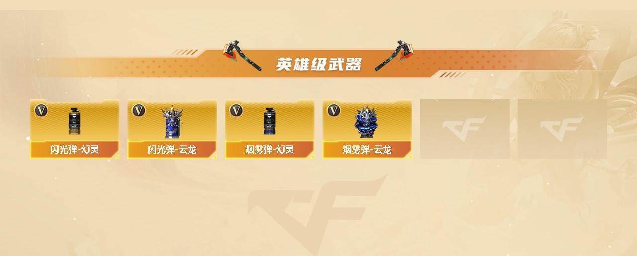 【英雄级武器】:AK47-火麒麟,M4A1-雷神*2,Scar Light-白虎,无影-神兵利器,黑武士-锦绣游龙,QBZ03-金色蔷薇,王者之鲨-觉醒版,王者之烈-觉醒版,Barrett-毁灭,Barrett-极光,M200-幻神,烈龙-云海游龙,沙鹰-修罗,沙鹰-天神,修罗-云海游龙,屠龙,擎天,幻灵之锋,擎天-云海游龙,高爆手雷-幻灵*2,高爆手雷-云龙*2,手雷-云海游龙,闪光弹-幻灵,闪光弹-云龙,烟雾弹-幻灵*2,烟雾弹-云龙,M4A1-赤狱骑士,AWM-昌龙