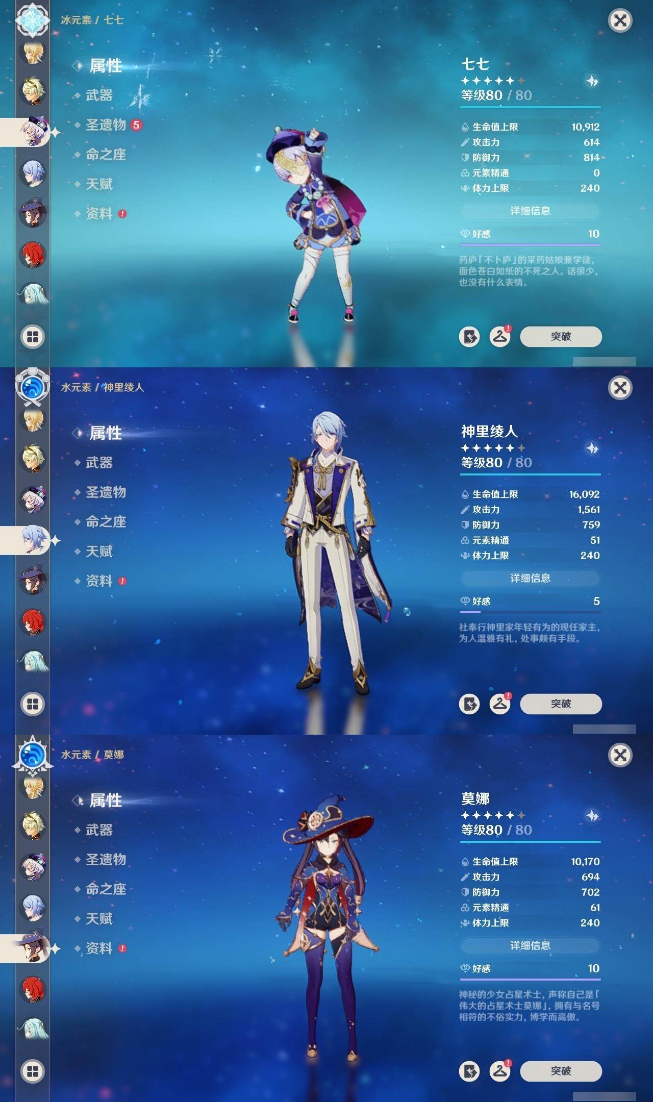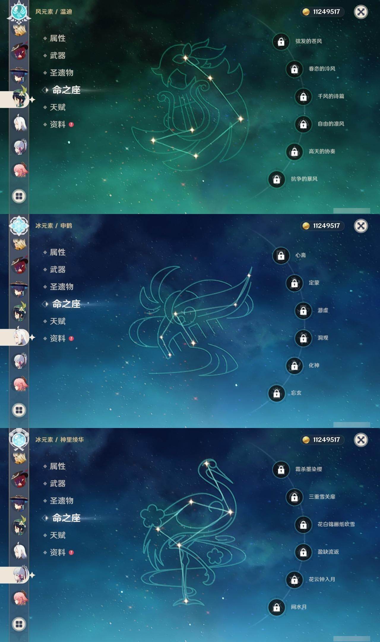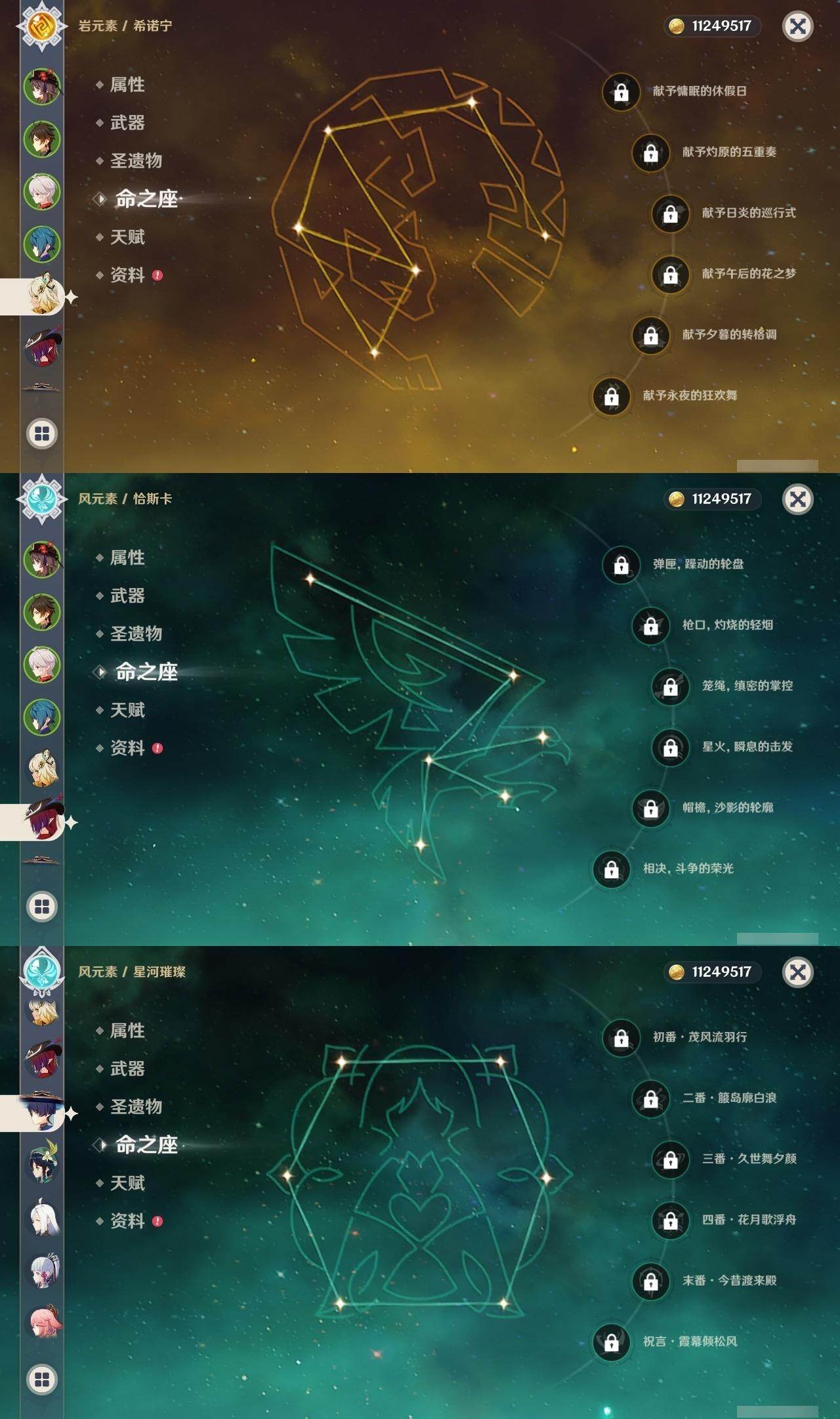 0命莱欧斯利,0命林尼,0命迪希雅,0命流浪者,2命提纳里,0命神里绫人,0命八重神子,0命申鹤,0命雷电将军,1命枫原万叶,0命神里绫华,0命钟离,1命胡桃,0命温迪,0命珊瑚宫心海,2命刻晴,0命七七,1命琴,2命莫娜,0命迪卢克,0命希诺宁,0命恰斯卡,0命梦见月瑞希,精1波乱月白经津,精1终末嗟叹之诗,精1无工之剑,精1天空之脊,精1阿莫斯之弓,精1天空之刃,精1狼的末路
