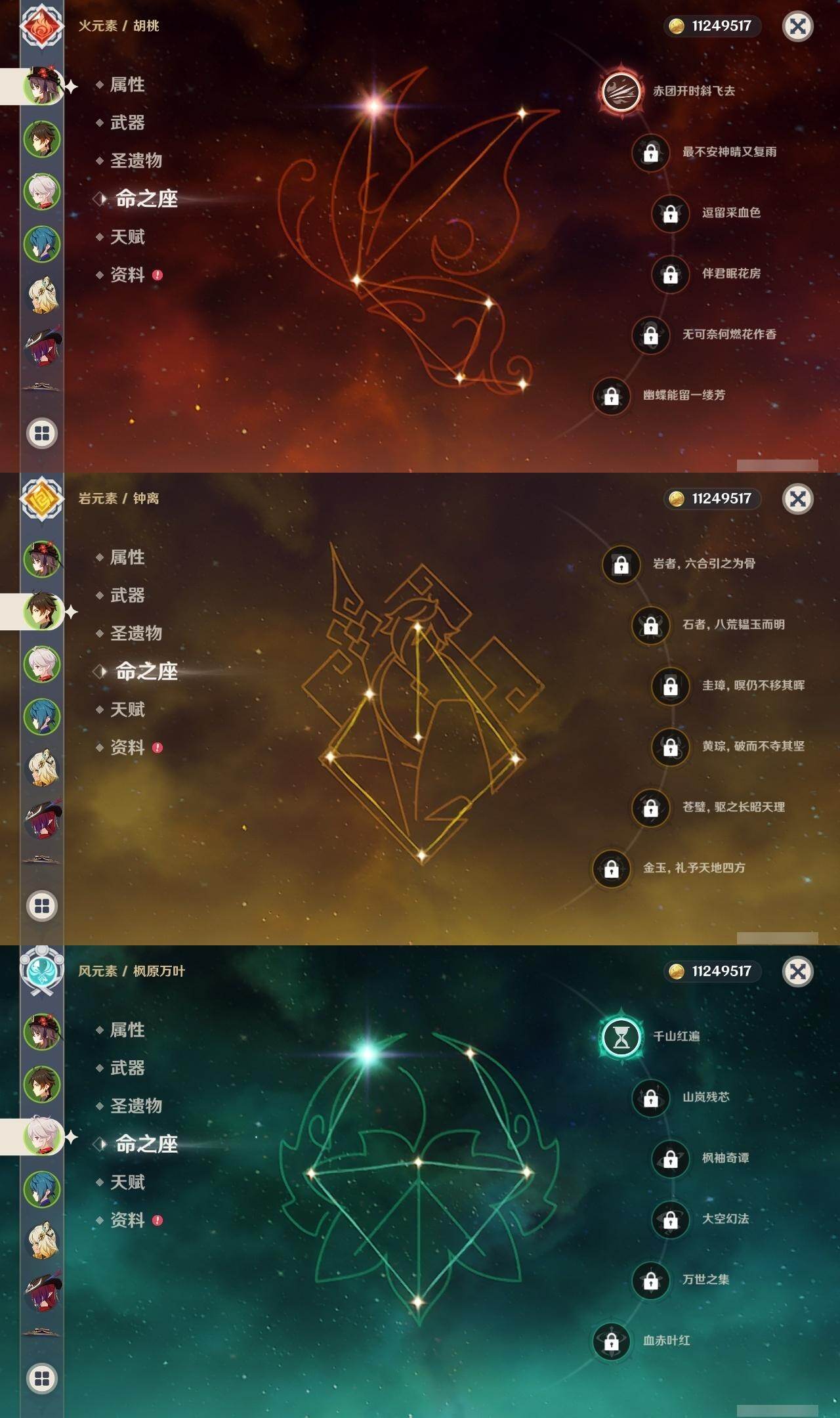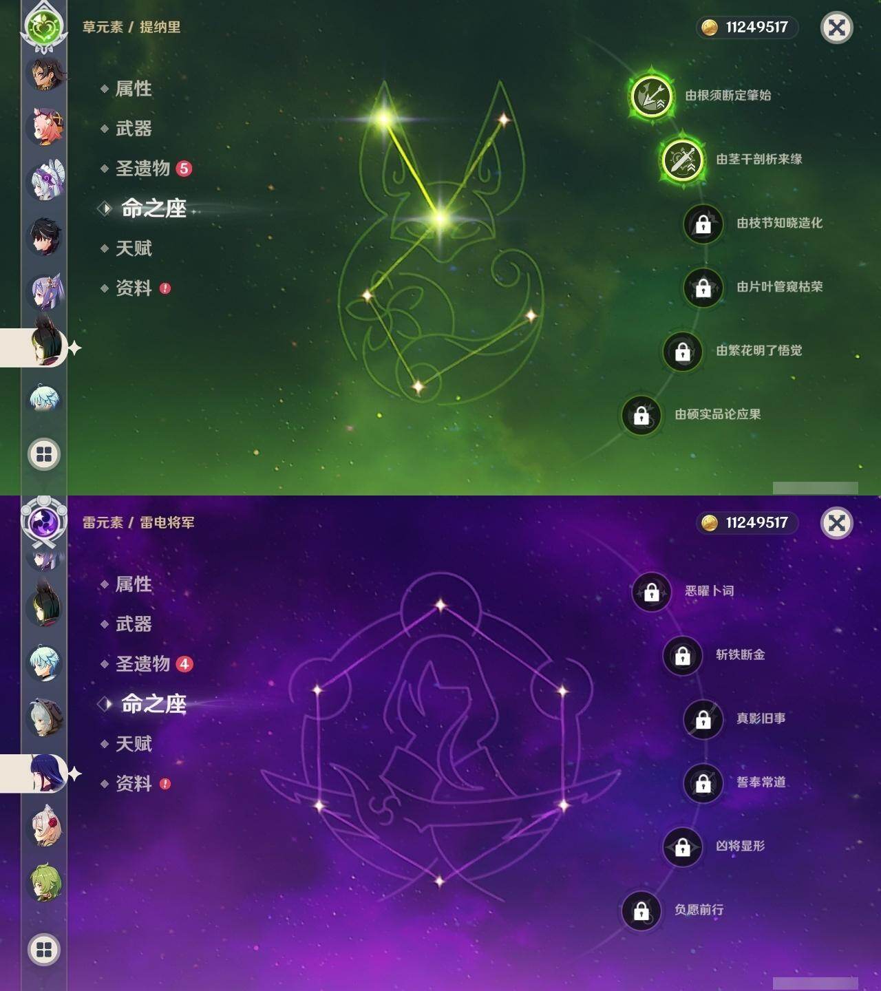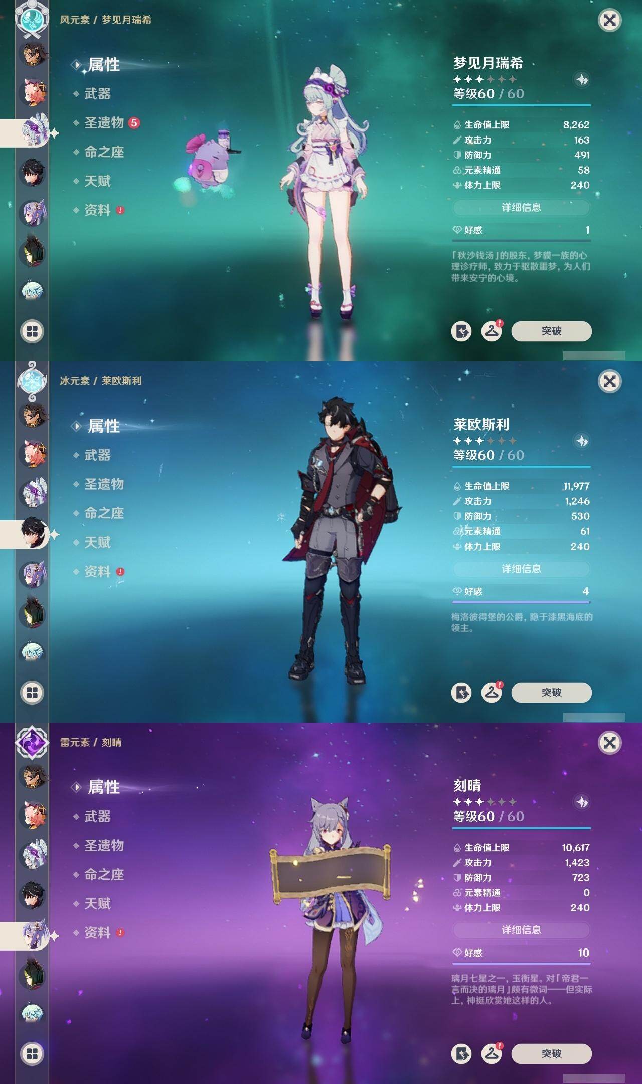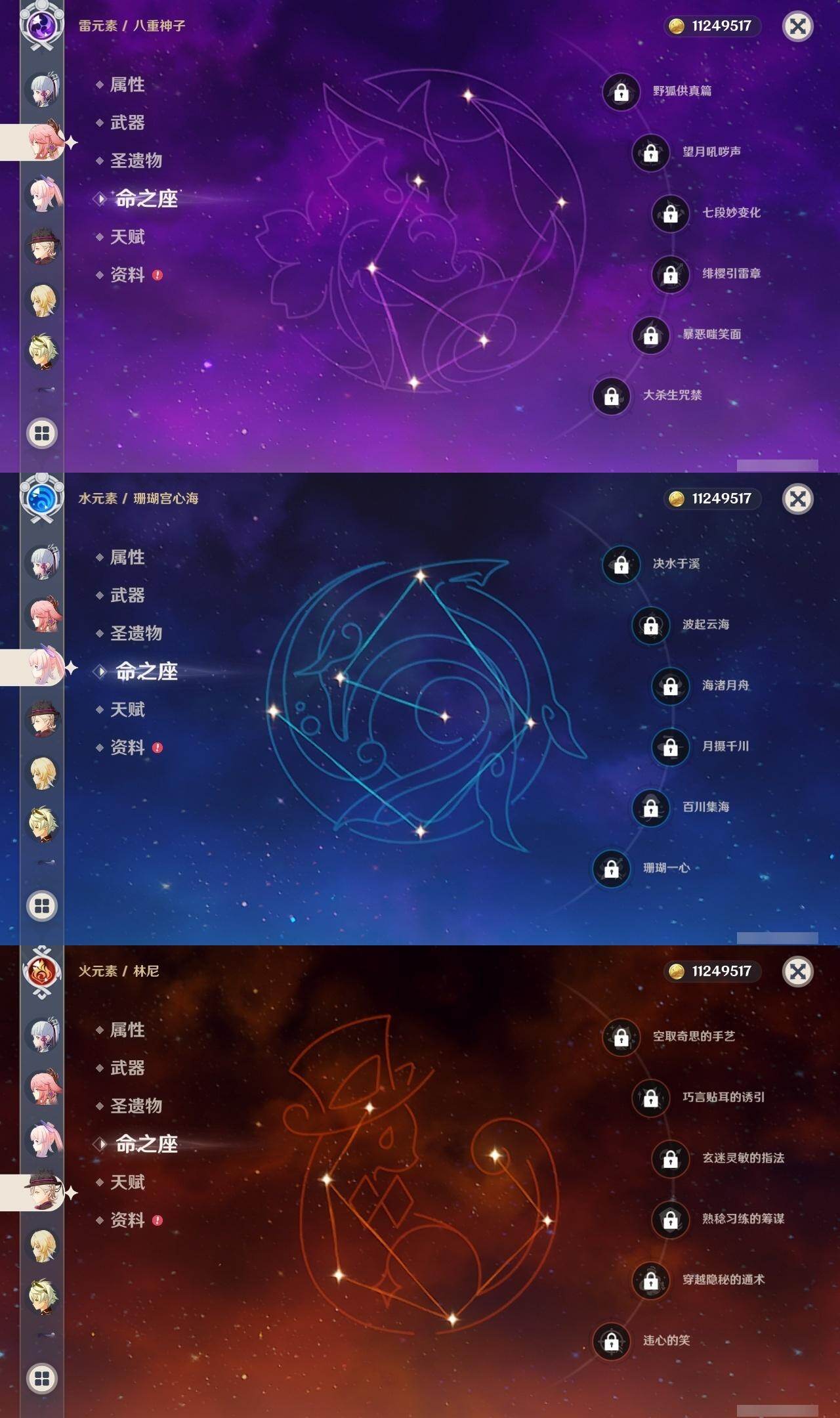 0命莱欧斯利,0命林尼,0命迪希雅,0命流浪者,2命提纳里,0命神里绫人,0命八重神子,0命申鹤,0命雷电将军,1命枫原万叶,0命神里绫华,0命钟离,1命胡桃,0命温迪,0命珊瑚宫心海,2命刻晴,0命七七,1命琴,2命莫娜,0命迪卢克,0命希诺宁,0命恰斯卡,0命梦见月瑞希,精1波乱月白经津,精1终末嗟叹之诗,精1无工之剑,精1天空之脊,精1阿莫斯之弓,精1天空之刃,精1狼的末路