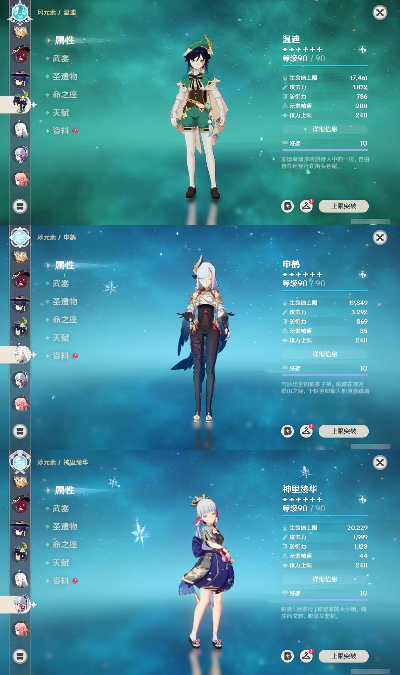胡桃,钟离,枫原万叶,温迪,申鹤,神里凌华,八重神子,珊瑚宫心海,七七,莫娜,迪卢克,琴,刻晴,雷电将军
