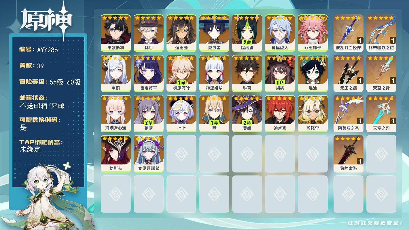 [15672888]58级/39黄/女主/23个五星角色/7个五星武器 0命莱欧斯利,0命林尼,0命迪希雅,0命流浪者,2命提纳里,0命神里绫人,0命八重神子,0命申鹤,0命雷电将军,1命枫原万叶,0命神里绫华,0命钟离,1命胡桃,0命温迪,0命珊瑚宫心海,2命刻晴,0命七七,1命琴,2命莫娜,0命迪卢克,0命希诺宁,0命恰斯卡,0命梦见月瑞希,精1波乱月白经津,精1终末嗟叹之诗,精1无工之剑,精1天空之脊,精1阿莫斯之弓,精1天空之刃,精1狼的末路