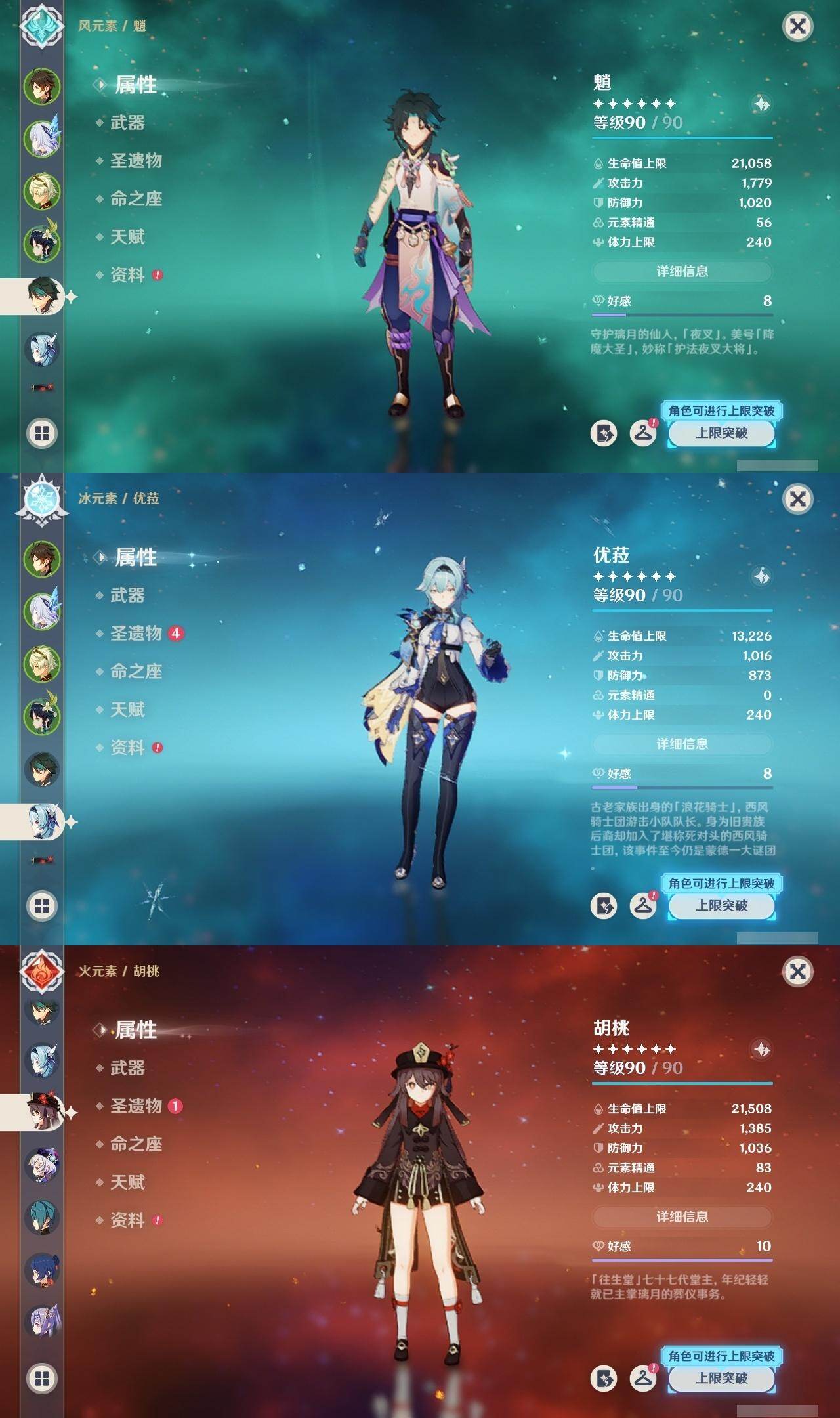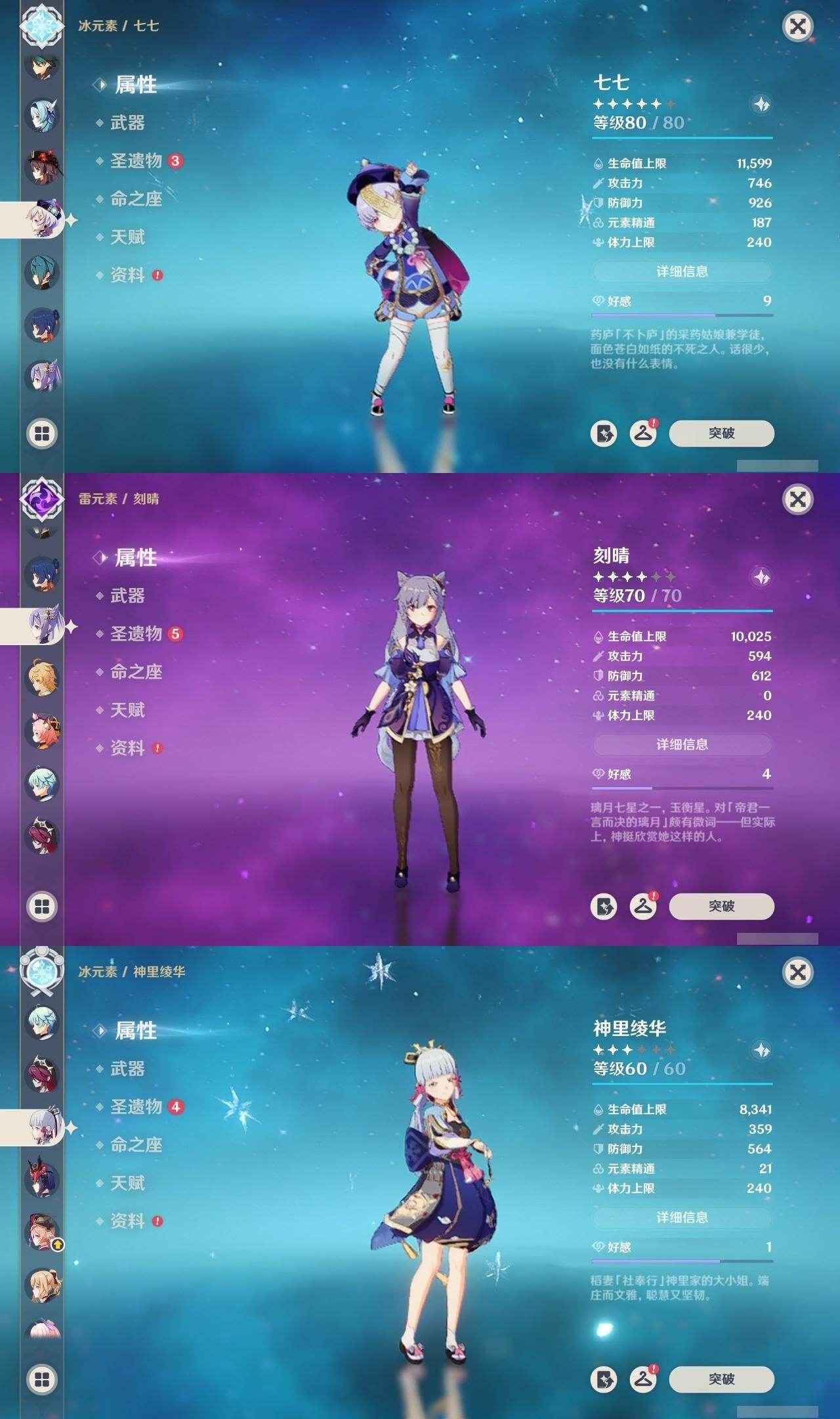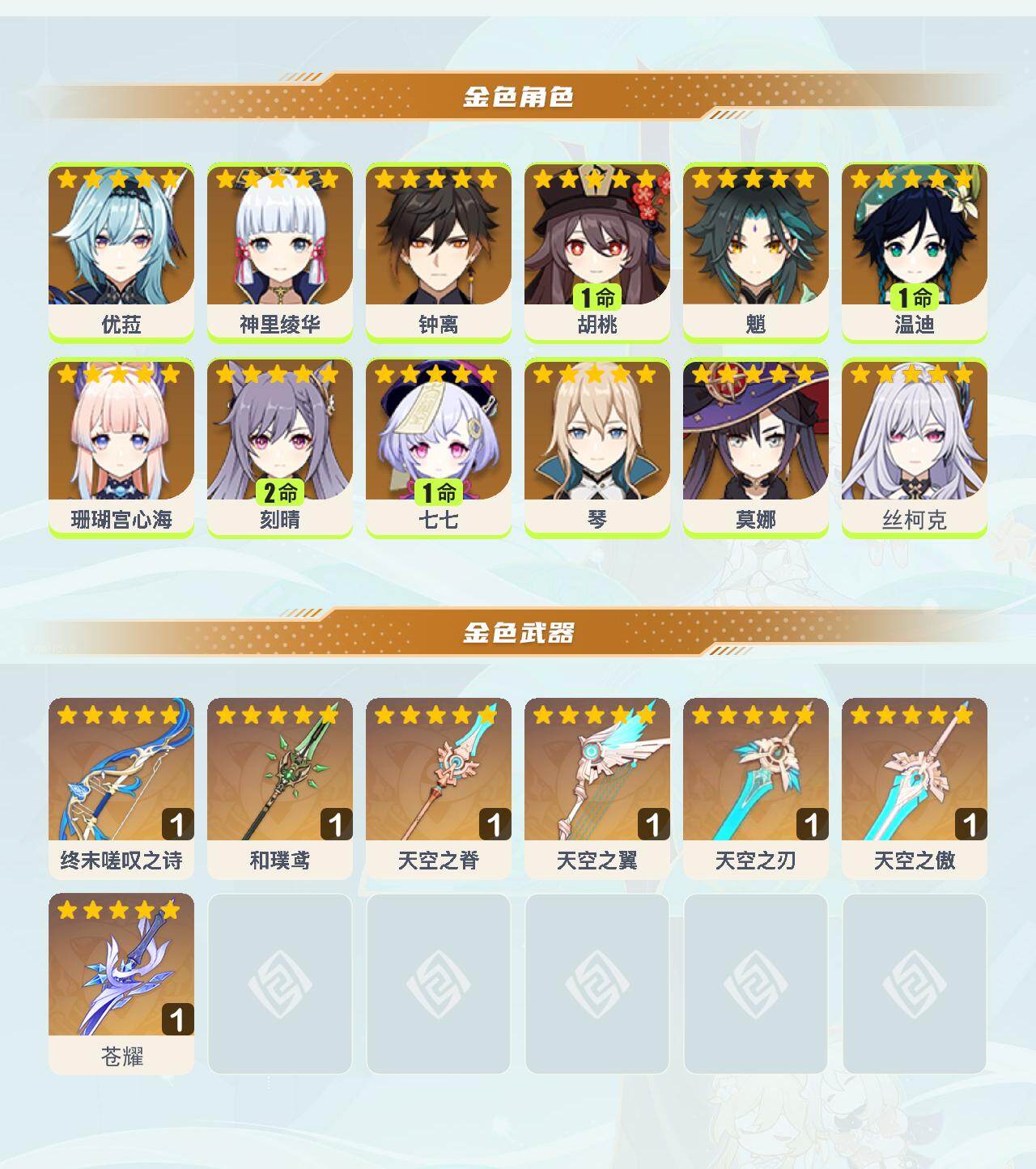 0命优菈,0命神里绫华,0命钟离,1命胡桃,0命魈,1命温迪,0命珊瑚宫心海,2命刻晴,1命七七,0命琴,0命莫娜,0命丝柯克,精1终末嗟叹之诗,精1和璞鸢,精1天空之脊,精1天空之翼,精1天空之刃,精1天空之傲,精1苍耀