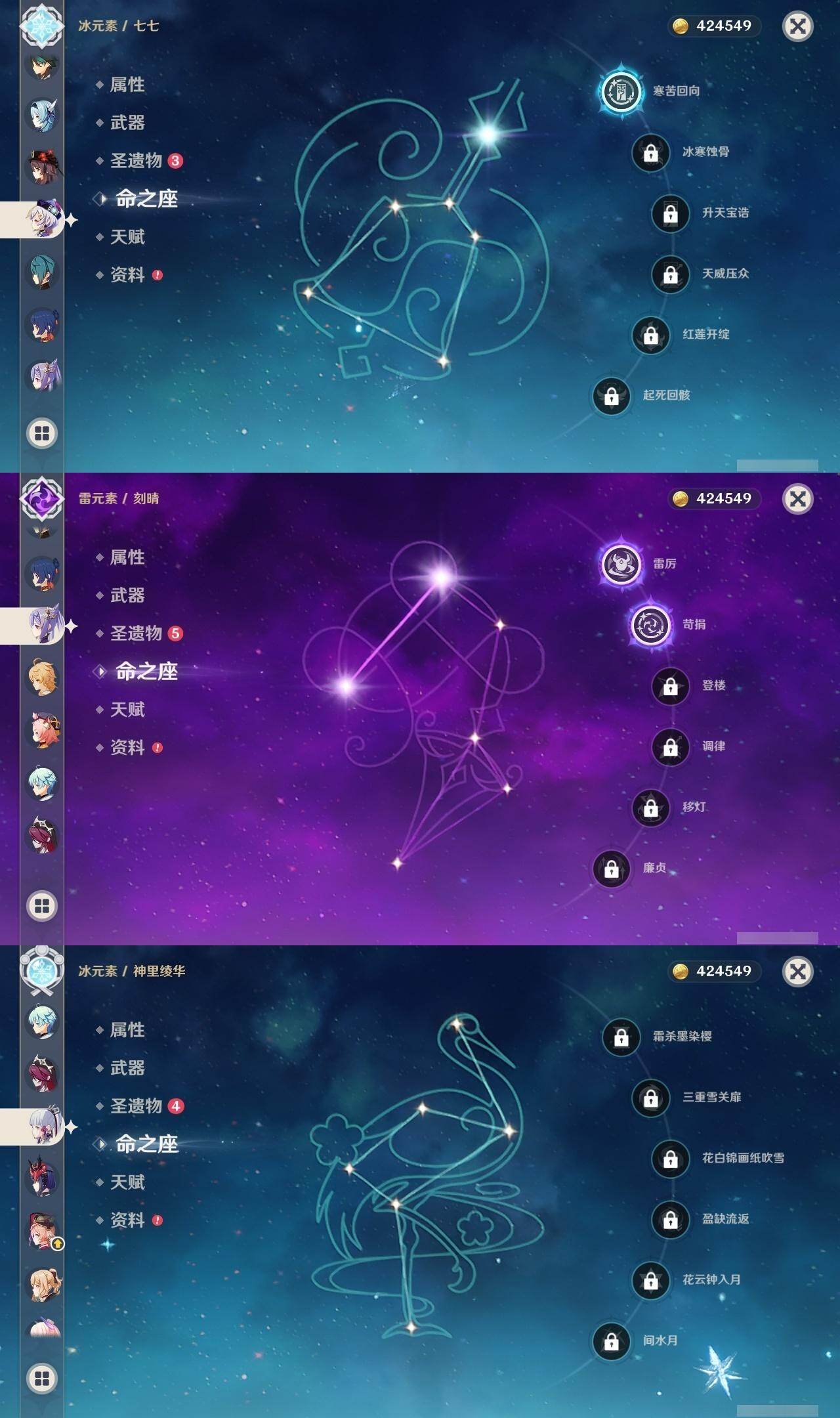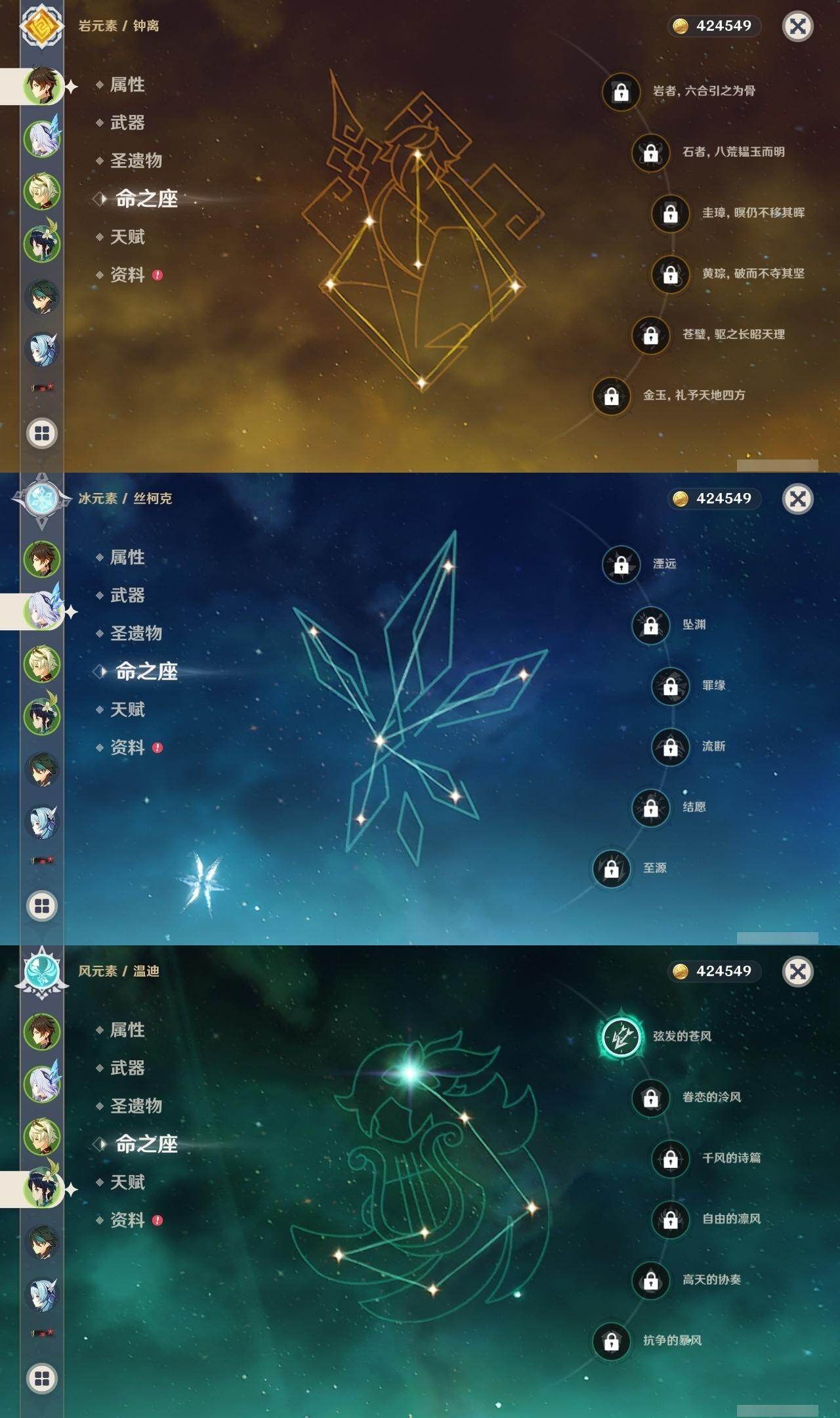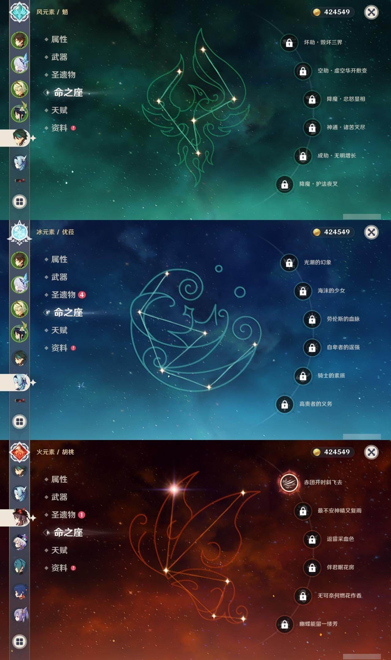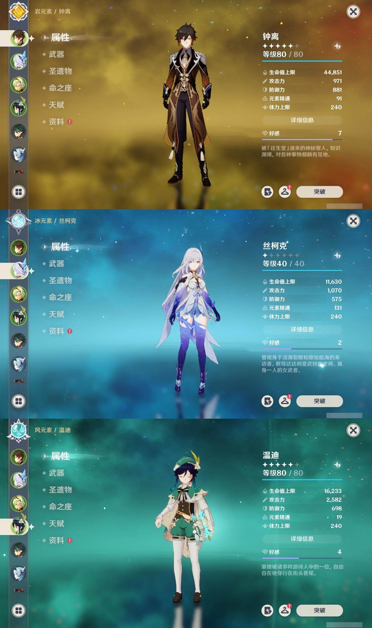 0命优菈,0命神里绫华,0命钟离,1命胡桃,0命魈,1命温迪,0命珊瑚宫心海,2命刻晴,1命七七,0命琴,0命莫娜,0命丝柯克,精1终末嗟叹之诗,精1和璞鸢,精1天空之脊,精1天空之翼,精1天空之刃,精1天空之傲,精1苍耀