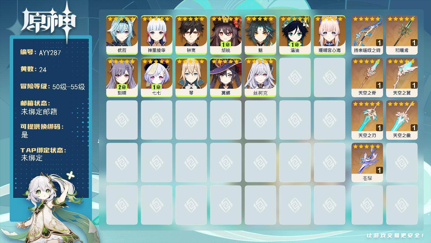 [15673399]55级/24黄/男主/12个五星角色/7个五星武器 0命优菈,0命神里绫华,0命钟离,1命胡桃,0命魈,1命温迪,0命珊瑚宫心海,2命刻晴,1命七七,0命琴,0命莫娜,0命丝柯克,精1终末嗟叹之诗,精1和璞鸢,精1天空之脊,精1天空之翼,精1天空之刃,精1天空之傲,精1苍耀