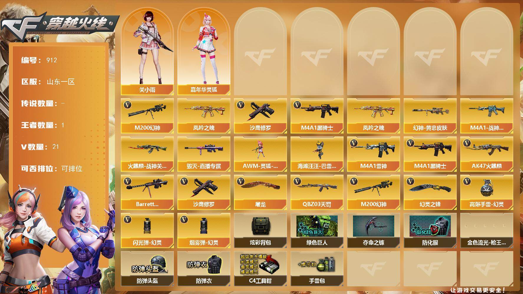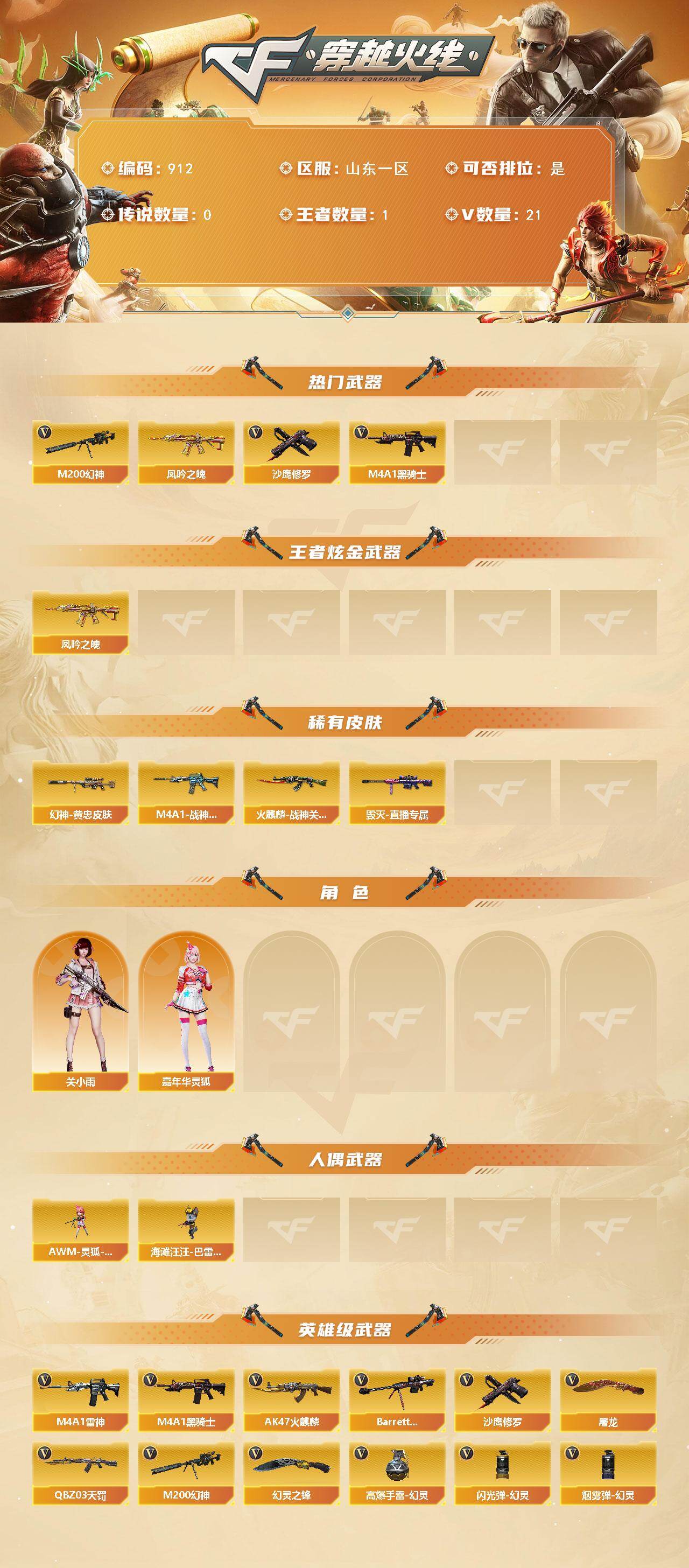 [15674574]山东一区-21V-1王者-0炫金 【热门武器】:M200-幻神,凤吟之魄,M4A1-黑骑士*3,沙鹰-修罗*3 【王者炫金武器】:凤吟之魄 【皮肤】:M200-幻神-黄忠皮肤,M4A1-战神赵云,火麒麟-战神关羽,毁灭-直播专属 【角色】:关小雨,嘉年华灵狐 【人偶武器】:AWM-灵狐-15周年嘉年华,海滩汪汪-巴雷特 【英雄级武器】:AK47-火麒麟,M4A1-雷神*2,M4A1-黑骑士*3,QBZ03-天罚,Barrett-毁灭,M200-幻神,沙鹰-修罗*3,屠龙,幻灵之锋*2,高爆手雷-幻灵,闪光弹-幻灵*2,烟雾弹-幻灵*2 【道具】:炫彩背包,绿色巨人,夺命之镰,防化服*2,金色流光-枪王排位*2,星辰流光-枪王排位,防弹头盔*2,防弹衣*2,C4工具钳*2,手雷包*2 【特殊枪械】:3黑骑士