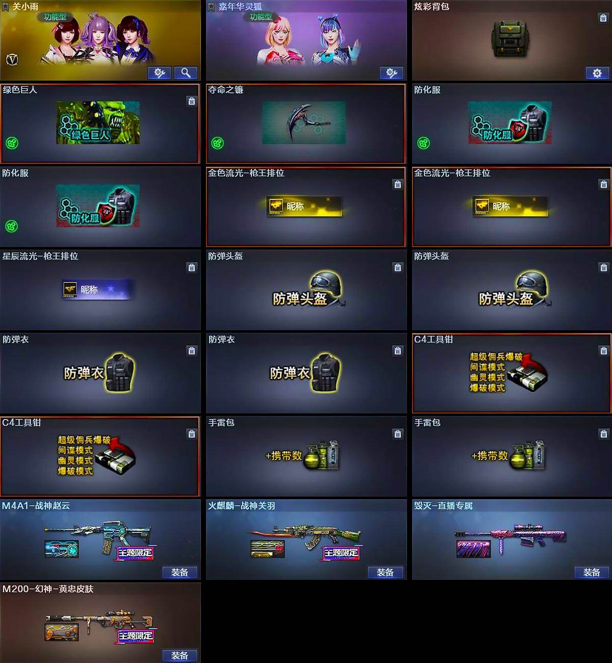 【道具】:炫彩背包,绿色巨人,夺命之镰,防化服*2,金色流光-枪王排位*2,星辰流光-枪王排位,防弹头盔*2,防弹衣*2,C4工具钳*2,手雷包*2