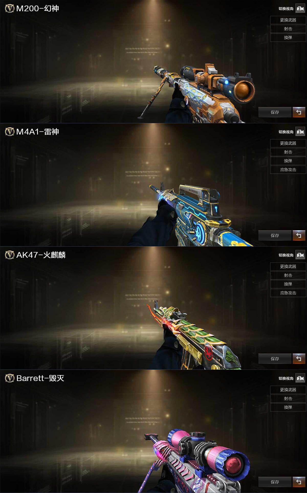 【皮肤】:M200-幻神-黄忠皮肤,M4A1-战神赵云,火麒麟-战神关羽,毁灭-直播专属
