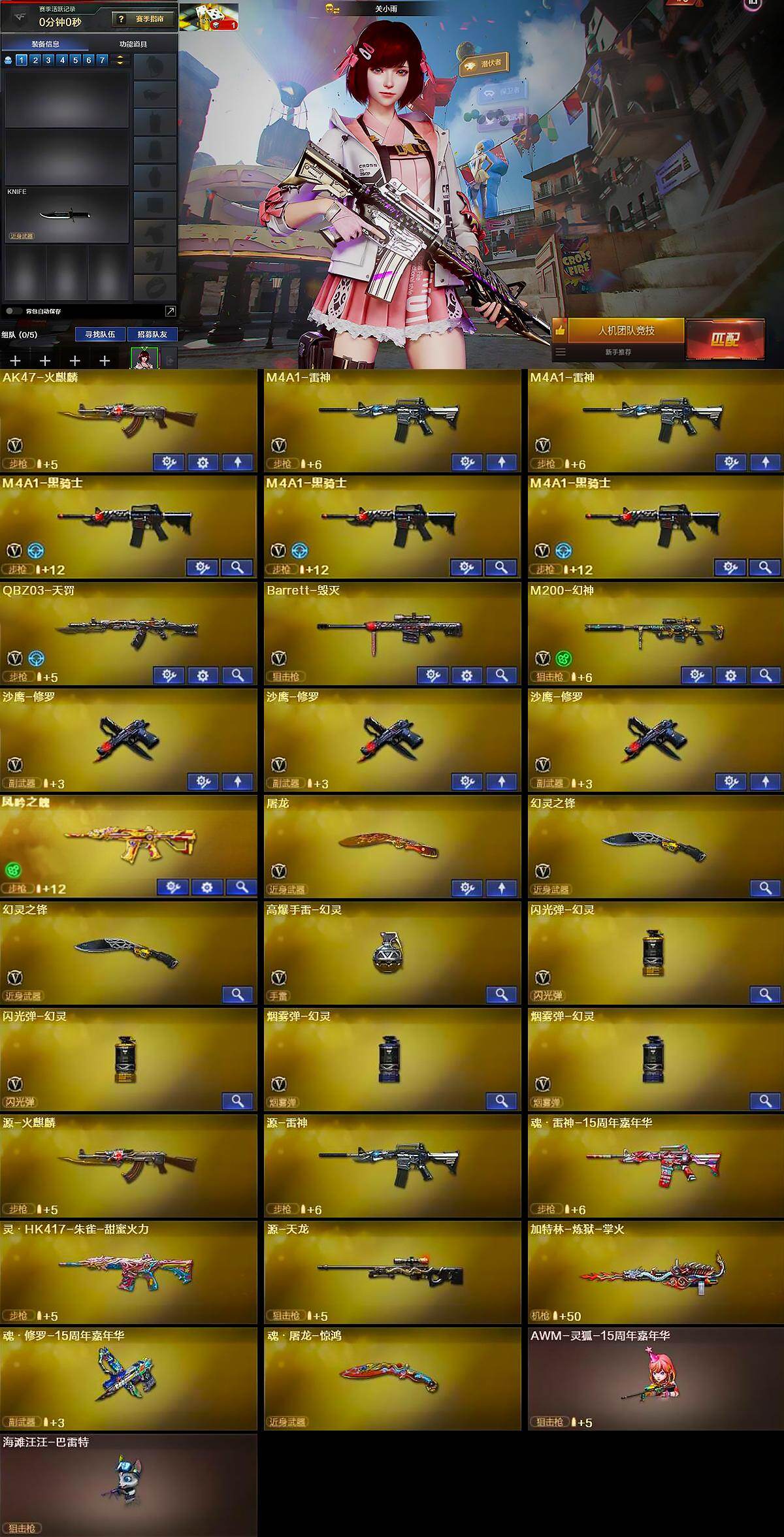 【英雄级武器】:AK47-火麒麟,M4A1-雷神*2,M4A1-黑骑士*3,QBZ03-天罚,Barrett-毁灭,M200-幻神,沙鹰-修罗*3,屠龙,幻灵之锋*2,高爆手雷-幻灵,闪光弹-幻灵*2,烟雾弹-幻灵*2