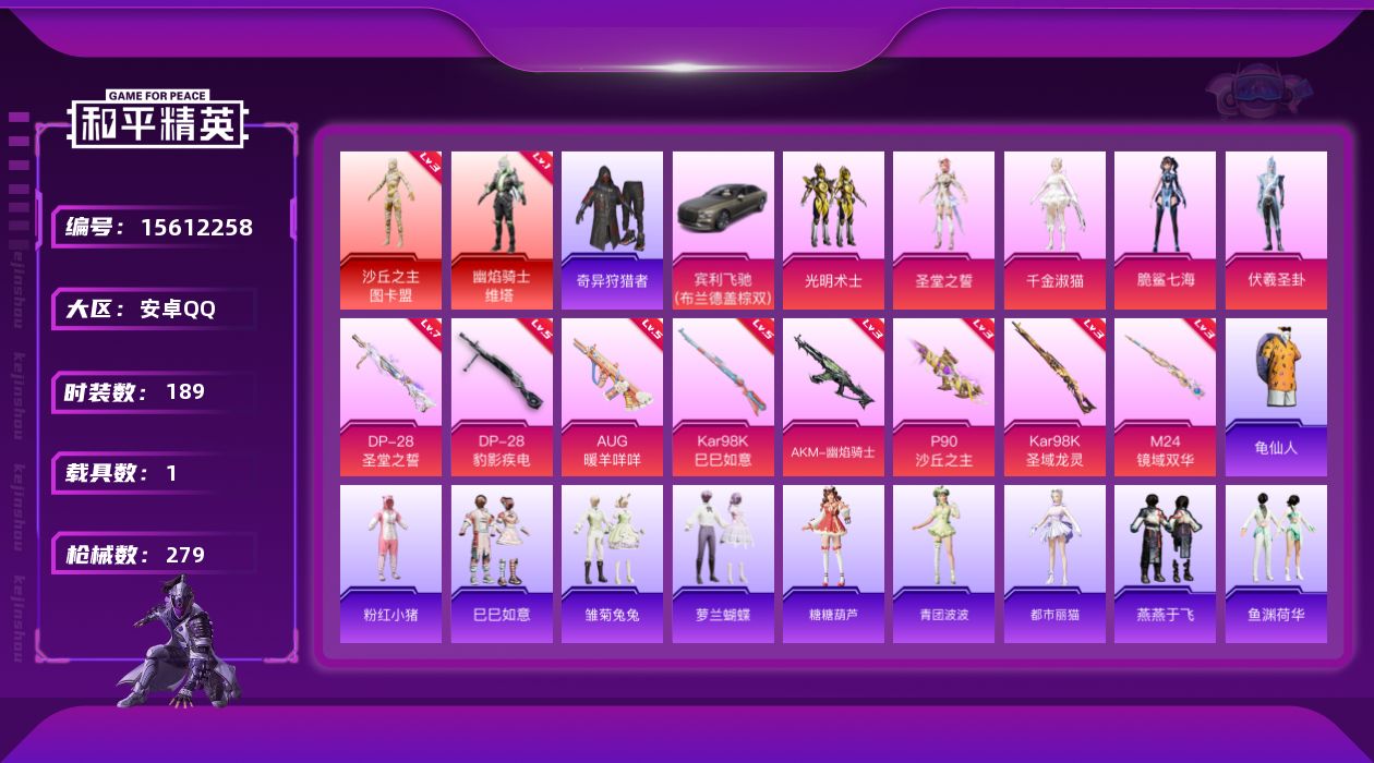 [15612258]1级维塔!2级图卡盟!安卓 手Q-2神装-5粉装-8特效枪-1载具-10粉色飞行器-97454热力值-23王牌印记-189套装-279枪皮
