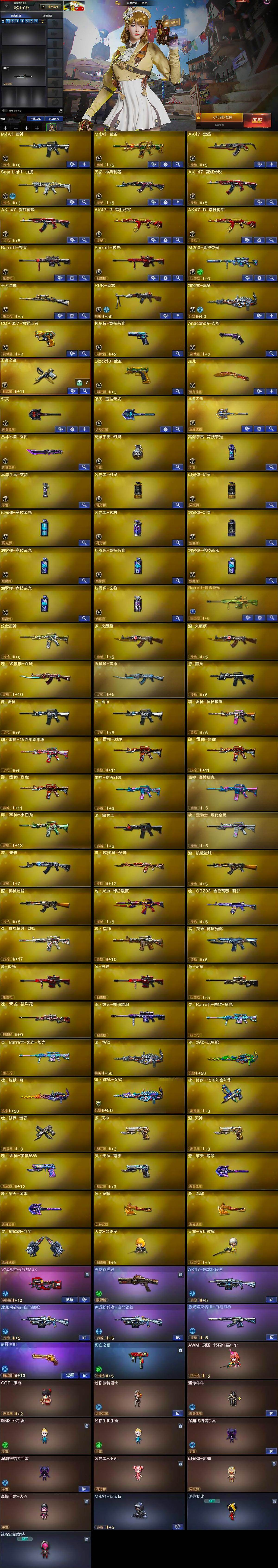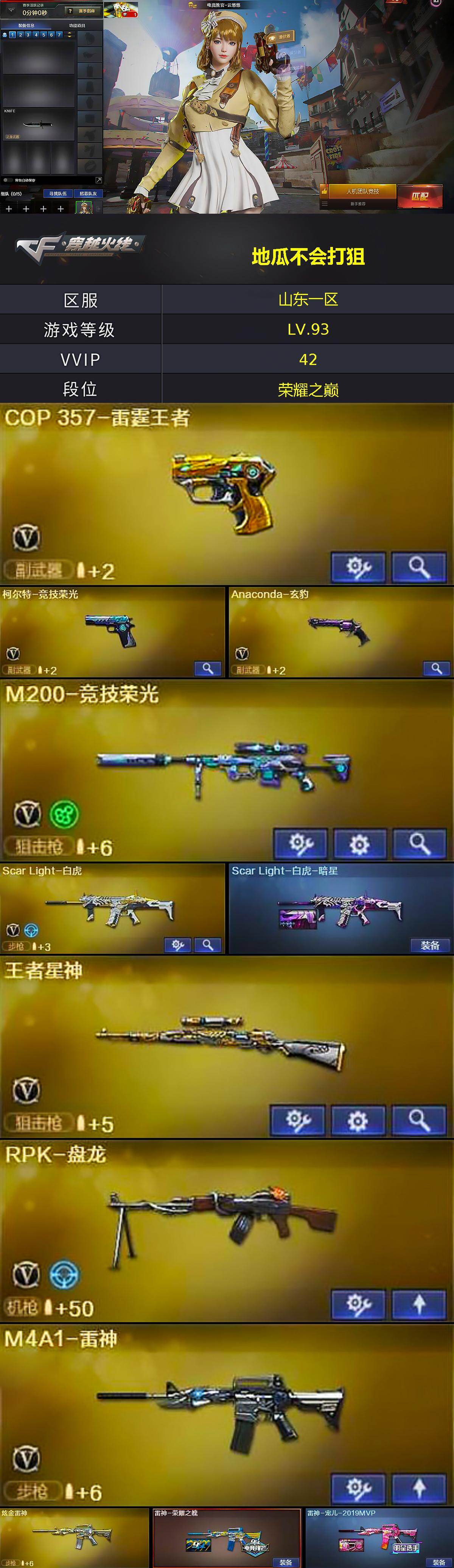 - [15593837]安徽一区-193V-37王者-6炫金 【传说角色】:传说女帝 【热门武器】:QBZ03-金色蔷薇*3,Scar Light-白虎,HK417-朱雀,M200-幻神,M200-竞技荣光,死亡之眼,荣耀世冠-火麒麟,荣耀世冠-雷神,白虎-电玩蓝兔,柯尔特-冠军之特*2,荣耀世冠-柯尔特,Kar98K-星神,M4A1-黑骑士*5,汤姆逊-烈龙*6,RPK-盘龙,加特林-炼狱*8,斯泰尔-蝴蝶,降世魔童,火麒麟-绝迹,USP-雷暴,COP-堕天神*2,沙鹰-修罗*7,Knife-冠军之刃*2,荣耀世冠-龙啸,金刚伞 【王者炫金武器】:王者之武*2,王者之魄*3,王者之心*3,王者之光*2,炼狱-悦蓝,王者云击,炫金火麒麟,炫金雷神,炫金武士,炫金毁灭,炫金天神*2 【音效卡】:M200-幻神音效卡,AK47-火麒麟音效卡,M4A1-雷神音效卡*2,M4A1-黑骑士音效卡,Barrett-毁灭音效卡*2,AWM-裁决音效卡,Barrett-碧霄极光音效卡 【皮肤】:幻神-冠军之幻,幻神-AG-CFPLS17冠军,幻神-青鹤,幻神-荣耀世冠EP 皮肤,Scar Light-白虎-暗星*2,白虎-AG-CFPLS20冠军,QBZ03-冠军之薇,QBZ03-荣耀世冠白鲨,QBZ03-荣耀世冠EP 皮肤,裁决-巅峰荣耀 皮肤,雷神-能量核心,雷神-荣耀之魄*2,雷神-星空,雷神-耀金皮肤,雷神-冠军之魄,雷神-R.LGD-CFPLS18冠军,火麒麟-冠军之心,火麒麟-华夏之心,AK47-火麒麟-传奇EVEN,火麒麟-轻羽皮肤,传奇石头-横秒之巅,火麒麟-巅峰荣耀,火麒麟-大唐荣光,火麒麟-心动糖果,毁灭-荣耀之怒*2,毁灭-冠军之怒,毁灭-CFS2020,黑龙-能量核心,黑龙-冠军之武,黑骑士-暗月,黑骑士耀金皮肤,黑骑士-冠军之势,黑骑士-CFS2021,无影-能量核心,无影耀金皮肤*2,战神-紫绶金章皮肤*2,AK47-B-常胜将军-曹操,AK47-B-常胜将军-刘备*3,AK47-B-常胜将军-孙权*2,天龙-能量核心,AWM-天龙-传奇70KG*3,AWM-天龙-传奇白鲨*2,极光-能量核心,炼狱-星空,修罗-能量核心*2,修罗-冠军之魂,屠龙-荣耀之锋*5,屠龙-荣耀世冠AG,龙啸-冠军之啸,擎天-冠军之击 【角色】:零,炫,迷迭香,沙漠玫瑰,雨棠,电竞教官-云悠悠,鹰,