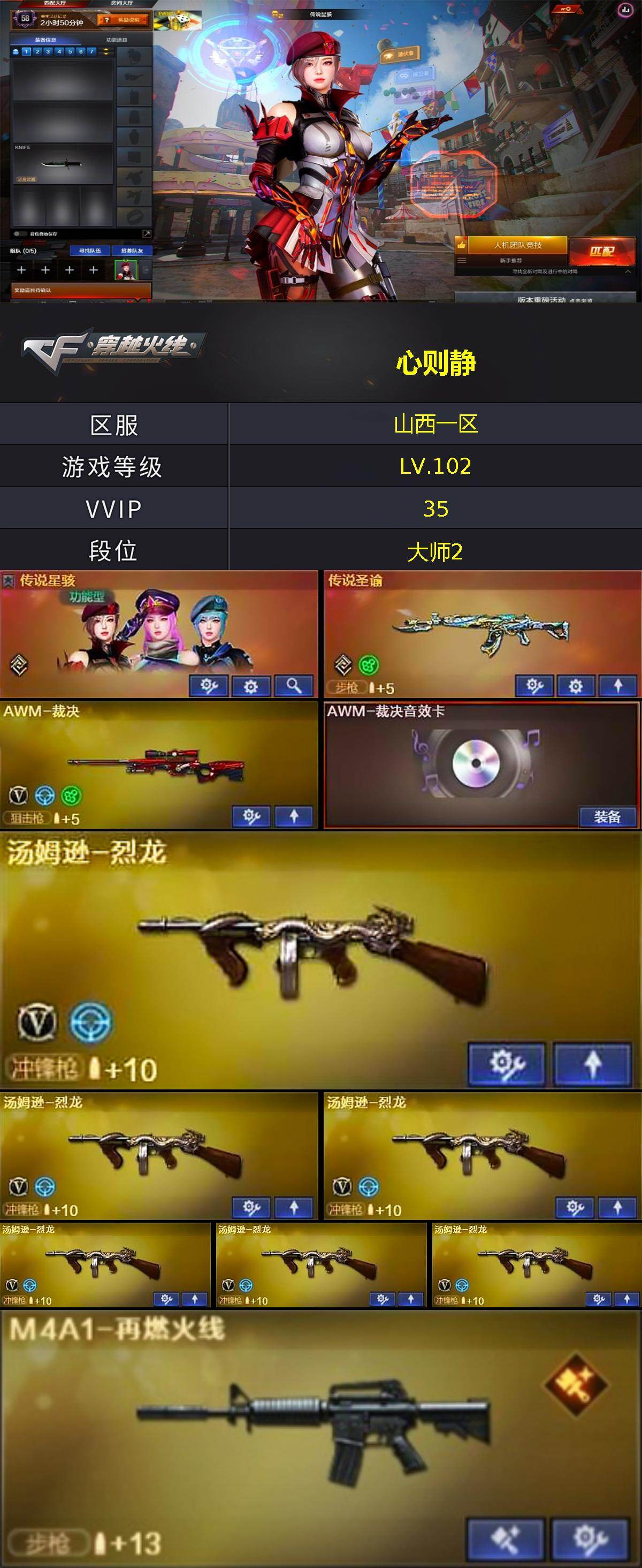 [15675819]山西一区-38V-3王者-0炫金 【传说武器】:传说圣谕 【传说角色】:传说星骇 【热门武器】:传说圣谕,死亡之眼*2,汤姆逊-烈龙*6,沙鹰-修罗*3,荣耀世冠-龙啸 【王者炫金武器】:王者玄武,王者冰锋 【音效卡】:AWM-裁决音效卡,Barrett-碧霄极光音效卡,炼狱-百战金芒-庆典舞曲音效卡 【皮肤】:裁决-胜者为王 皮肤,M4A1-再燃火线,龙啸-巅峰荣耀 皮肤,龙啸-黯钢战甲 皮肤,轻型军用手斧-再燃火线,龙啸-青青莓果 皮肤,擎天-冠军之击,麒麟刺-荣耀世冠白鲨 【角色】:魅影,荆棘,王者影豹,初恋灵狐,娟娟,兰妹妹,潘多拉-甜心教官,蜀雪,铁骑荣耀,五号兵器-赛博朋克,新娜塔莎 【人偶武器】:迷你深渊冰龙,迷你牛牛,深渊终结者手雷 【暴走生化】:死亡之眼*2 【挑战大师】:激光毁灭者III-白马银枪,神圣爆裂者-末日III 【英雄级武器】:M4A1-黑龙,AN94-超新星,AK47-黑鲨,AWM-裁决,炼狱-百战金芒,汤姆逊-烈龙*6,AA-12-雷霆,沙鹰-修罗*3,龙啸,擎天,麒麟刺,荣耀世冠-龙啸,斩神刀-雷暴,麒麟刺-百战金芒,王者之啸-觉醒版,丛林匕首-玄豹,高爆手雷-玄豹,M4A1-赤狱骑士,Barrett-碧霄极光 【道具】:BS战队炫彩背包,CFS限定背包,云山科技背包,冰冰企鹅背包,女皇终结者-背包,战舰背包,沙漠龙背包-猛男专属,炫彩背包-诺拉,炫彩背包,百战金芒炫彩背包,雪域霜狐炫彩背包,女皇终结者-魔龙之吻,绿色巨人,灵魂忍者,迷雾幽灵,夺命之镰*2,防化服*3,流光-鎏金之域,语音特效-盛典烟火,雪域霜狐表情,萌萌小葵表情,电玩兔兔表情,炽雪表情,防弹头盔*4,防弹衣*4,C4工具钳*4,手雷包*4 【特殊枪械】:6烈龙