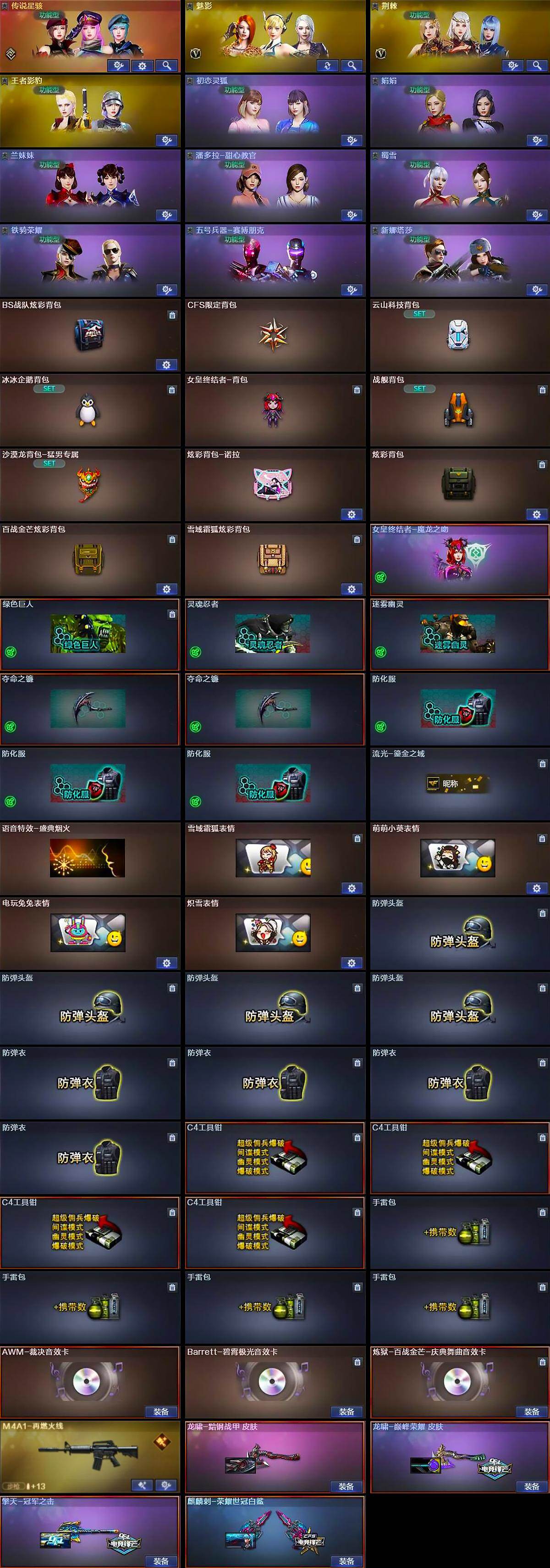 【道具】:BS战队炫彩背包,CFS限定背包,云山科技背包,冰冰企鹅背包,女皇终结者-背包,战舰背包,沙漠龙背包-猛男专属,炫彩背包-诺拉,炫彩背包,百战金芒炫彩背包,雪域霜狐炫彩背包,女皇终结者-魔龙之吻,绿色巨人,灵魂忍者,迷雾幽灵,夺命之镰*2,防化服*3,流光-鎏金之域,语音特效-盛典烟火,雪域霜狐表情,萌萌小葵表情,电玩兔兔表情,炽雪表情,防弹头盔*4,防弹衣*4,C4工具钳*4,手雷包*4