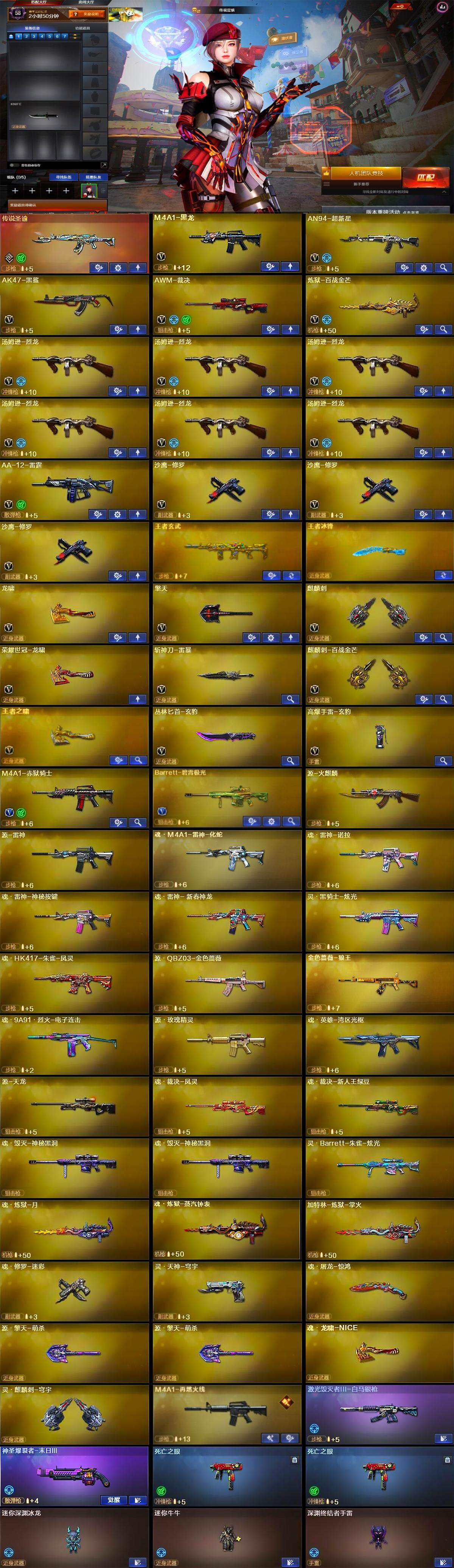 【英雄级武器】:M4A1-黑龙,AN94-超新星,AK47-黑鲨,AWM-裁决,炼狱-百战金芒,汤姆逊-烈龙*6,AA-12-雷霆,沙鹰-修罗*3,龙啸,擎天,麒麟刺,荣耀世冠-龙啸,斩神刀-雷暴,麒麟刺-百战金芒,王者之啸-觉醒版,丛林匕首-玄豹,高爆手雷-玄豹,M4A1-赤狱骑士,Barrett-碧霄极光