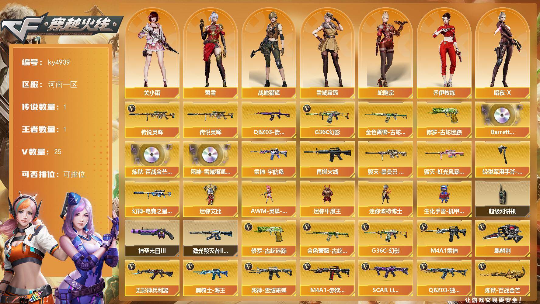 [15676046]河南一区-25V-1王者-0炫金 【传说武器】:传说灵眸 【热门武器】:传说灵眸,G36C-幻影,金色蔷薇-古蛇迷踪,修罗-古蛇迷踪,QBZ03-街机 【音效卡】:Barrett-碧霄极光音效卡,炼狱-百战金芒-庆典舞曲音效卡,死神-雪域霜狐-怀旧音效卡 【皮肤】:幻神-电竞之星 皮肤,雷神-宇航兔皮肤,M4A1-再燃火线,毁灭-黑曼巴 皮肤,毁灭-虹光风暴 皮肤,轻型军用手斧-再燃火线 【角色】:关小雨,战地猎狐,雪域霜狐,蛇隐宗,乔伊教练,暗夜-X,初恋灵狐,虎妞,嘉年华灵狐,灵狐者-X,龙儿,麻雀,曼陀罗-X,潘多拉-X,潘多拉-甜心教官,潜龙队-X,蛇姬,蜀雪,新娜塔莎 【人偶武器】:AWM-灵狐-15周年嘉年华*2,迷你牛魔王,迷你波特博士,生化手雷-机甲核心,迷你艾比 【暴走生化】:超级对讲机 【挑战大师】:激光毁灭者III-白马银枪,神圣爆裂者-末日III 【英雄级武器】:M4A1-雷神,无影-神兵利器,G36C-幻影,金色蔷薇-古蛇迷踪,死神-雪域霜狐,SCAR Light-玄豹,QBZ03-独角-III,黑骑士-海王,炼狱-百战金芒,修罗-古蛇迷踪,麒麟刺,麒麟刺-百战金芒,高爆手雷-古蛇迷踪,烟雾弹-幻灵,烟雾弹-古蛇迷踪,M4A1-赤狱骑士,M4A1-苍鸣雷神,Barrett-碧霄极光 【道具】:BS战队炫彩背包,CFS限定背包,云山科技背包,亚洲杯纪念炫彩背包,全能枪王背包,古蛇迷踪炫彩背包,百战金芒炫彩背包,超级背包,雪域霜狐炫彩背包,女皇终结者-魔龙之吻,救世主-黑桃战神,绿色巨人,灵魂忍者*2,妖姬,迷雾幽灵,夺命之镰,防化服*3,金色流光-枪王排位*2,星辰流光-枪王排位,流光-再燃火线,语音特效-盛典烟火,语音特效-怀旧,古蛇迷踪打击特效,雪域霜狐表情,蛇隐宗表情,萌萌小葵表情,炽雪表情,防弹头盔*3,防弹衣*3,C4工具钳*3,手雷包*3 【特殊枪械】: