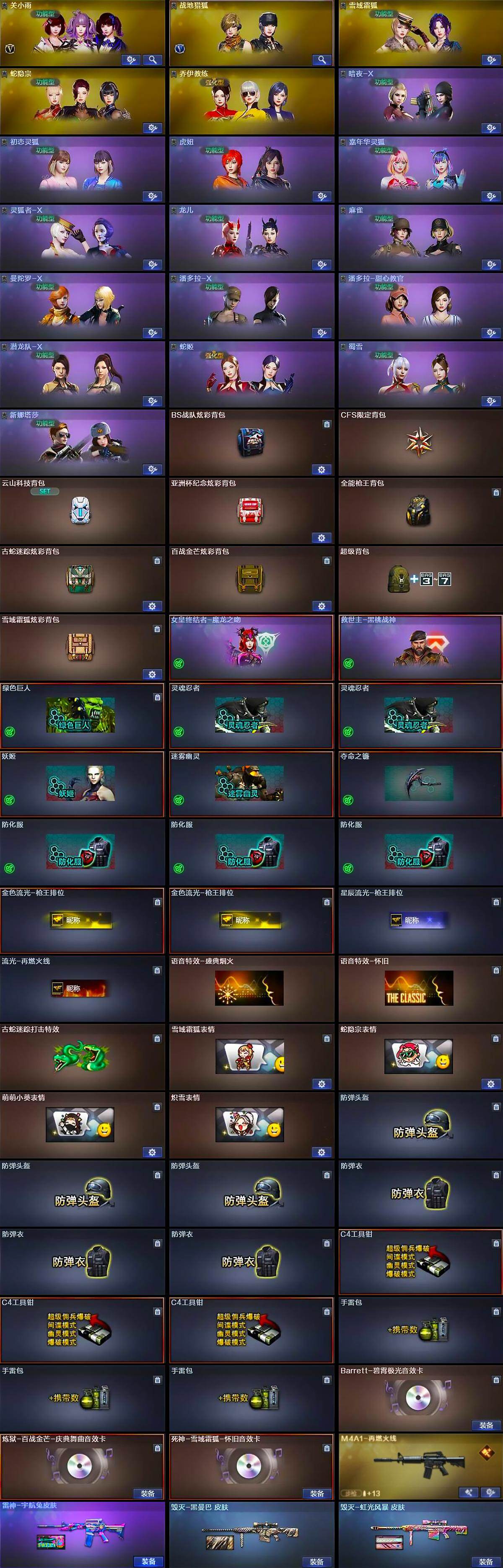【道具】:BS战队炫彩背包,CFS限定背包,云山科技背包,亚洲杯纪念炫彩背包,全能枪王背包,古蛇迷踪炫彩背包,百战金芒炫彩背包,超级背包,雪域霜狐炫彩背包,女皇终结者-魔龙之吻,救世主-黑桃战神,绿色巨人,灵魂忍者*2,妖姬,迷雾幽灵,夺命之镰,防化服*3,金色流光-枪王排位*2,星辰流光-枪王排位,流光-再燃火线,语音特效-盛典烟火,语音特效-怀旧,古蛇迷踪打击特效,雪域霜狐表情,蛇隐宗表情,萌萌小葵表情,炽雪表情,防弹头盔*3,防弹衣*3,C4工具钳*3,手雷包*3