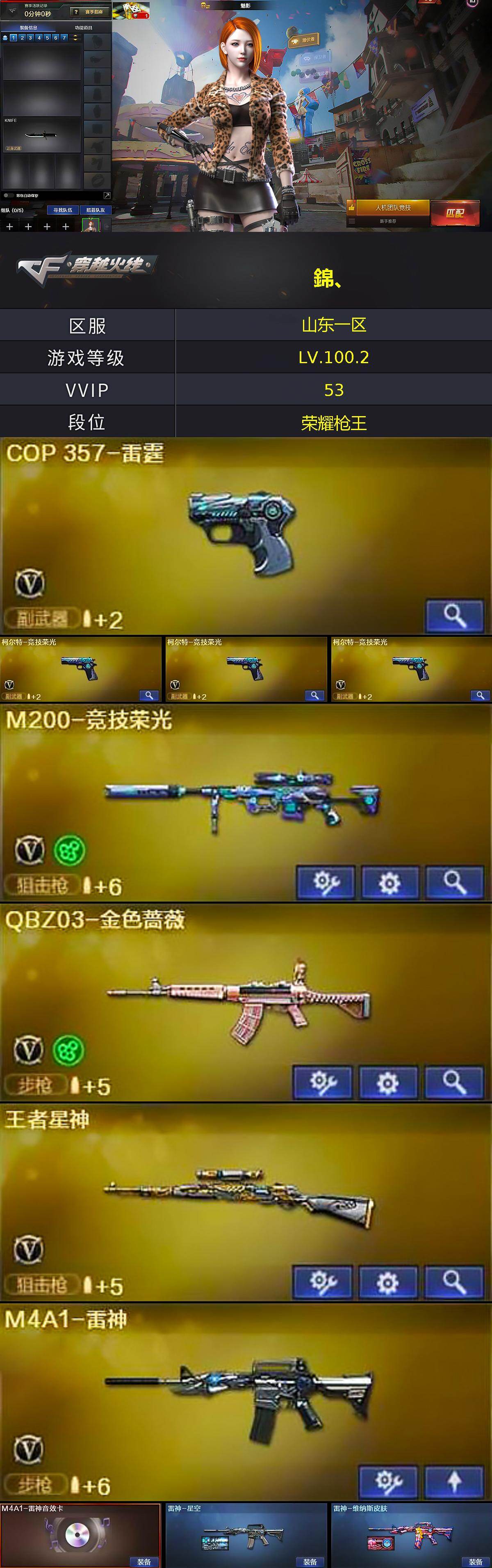 - [11525878]4传说角色 1王者武器 2炫金武器 55V武器 可二次 可修改实名 优质装备:竞技荣光套装,M200-竞技荣光,QBZ03-金色蔷薇,AWM-裁决,AN94-超新星,AK12-天启,沙鹰-修罗,沙鹰-天神,龙啸,擎天,柯尔特-竞技荣光,擎天-竞技荣光,炽芒蝶刃,龙啸-烈火龙威,AK47-黑武士-锦绣游龙 排位资格:有 V武器:AK47-B-身先士卒 王者武器:王者幻神-觉醒版 炫金武器:炫金毁灭,炫金天龙