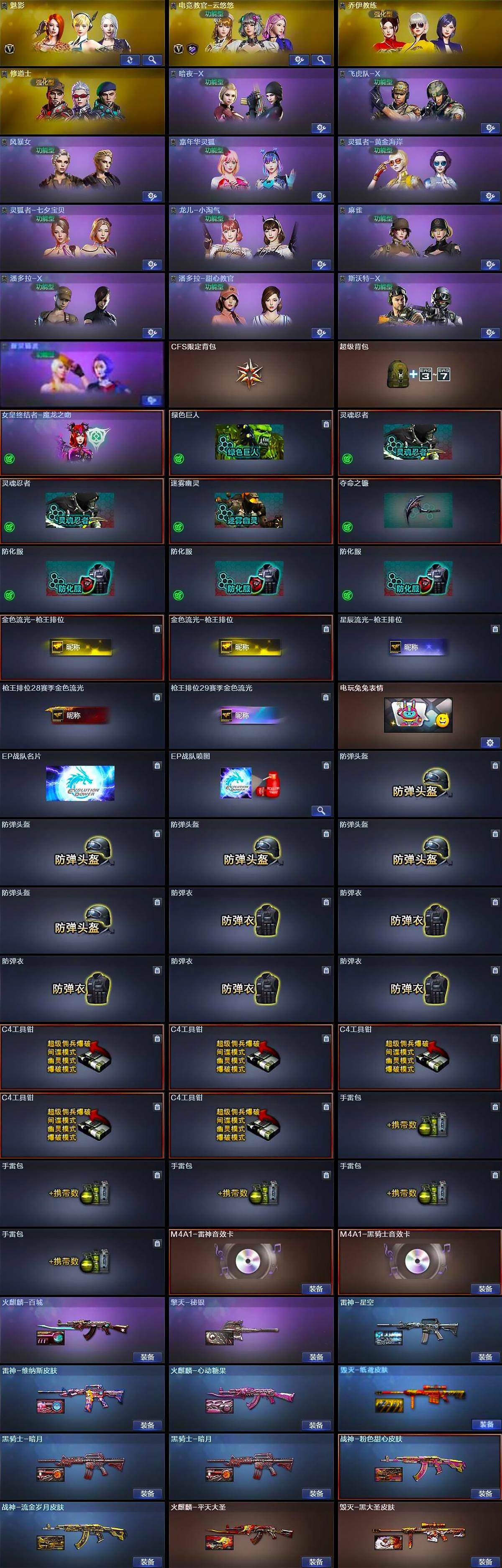【道具】:CFS限定背包,超级背包,女皇终结者-魔龙之吻,绿色巨人,灵魂忍者*2,迷雾幽灵,夺命之镰,防化服*3,金色流光-枪王排位*2,星辰流光-枪王排位,枪王排位28赛季金色流光,枪王排位29赛季金色流光,电玩兔兔表情,EP战队名片,EP战队喷图,防弹头盔*5,防弹衣*5,C4工具钳*5,手雷包*5