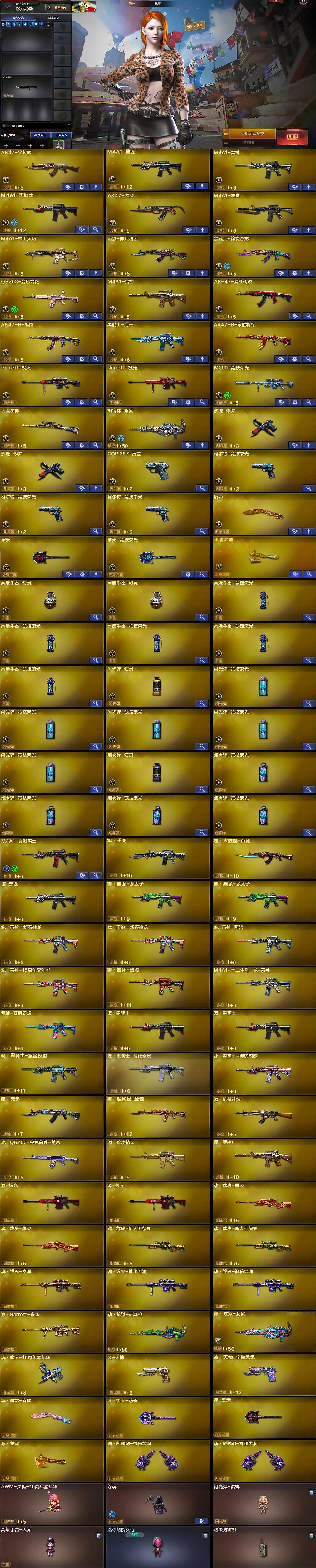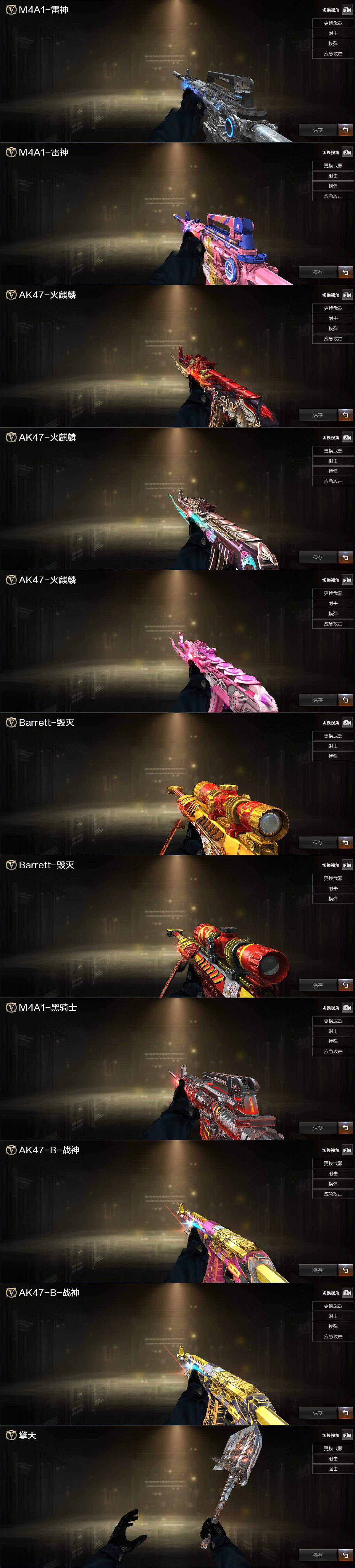 【英雄级武器】:AK47-火麒麟,M4A1-黑龙,M4A1-雷神,M4A1-黑骑士,AK47-黑鲨,M4A1-龙血,M4A1-神工天巧,无影-神兵利器,黑武士-锦绣游龙,QBZ03-金色蔷薇,M4A1-猎神,AK-47-猩红传说,AK47-B-战神,黑骑士-海王,AK47-B-常胜将军,Barrett-毁灭,Barrett-极光,M200-竞技荣光,王者星神-觉醒版,加特林-炼狱,沙鹰-修罗*2,COP-雷霆,柯尔特-竞技荣光*3,屠龙,擎天,擎天-竞技荣光,王者之啸-觉醒版,高爆手雷-幻灵*2,高爆手雷-竞技荣光*5,闪光弹-幻灵,闪光弹-竞技荣光*5,烟雾弹-幻灵,烟雾弹-竞技荣光*4,M4A1-赤狱骑士