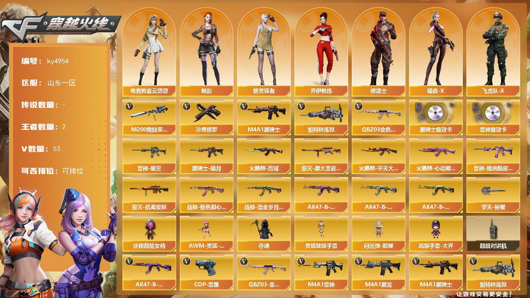 [15676255]山东一区-53V-2王者-0炫金 【热门武器】:QBZ03-金色蔷薇,M200-竞技荣光,M4A1-黑骑士,加特林-炼狱,沙鹰-修罗*2 【音效卡】:M4A1-雷神音效卡,M4A1-黑骑士音效卡 【皮肤】:雷神-星空,雷神-维纳斯皮肤,火麒麟-平天大圣,火麒麟-百城,火麒麟-心动糖果,毁灭-黑大圣皮肤,毁灭-纸鸢皮肤,黑骑士-暗月*2,战神-粉色甜心皮肤,战神-流金岁月皮肤,AK47-B-常胜将军-曹操,AK47-B-常胜将军-刘备*2,AK47-B-常胜将军-孙权,擎天-秘银 【角色】:魅影,电竞教官-云悠悠,乔伊教练,修道士,暗夜-X,飞虎队-X,风暴女,嘉年华灵狐,灵狐者-黄金海岸,灵狐者-七夕宝贝,龙儿-小淘气,麻雀,潘多拉-X,潘多拉-甜心教官,斯沃特-X,新灵狐者 【人偶武器】:AWM-灵狐-15周年嘉年华,夺魂,闪光弹-貂蝉,高爆手雷-大乔,迷你超能女侍,灵狐娃娃手雷 【暴走生化】:超级对讲机 【英雄级武器】:AK47-火麒麟,M4A1-黑龙,M4A1-雷神,M4A1-黑骑士,AK47-黑鲨,M4A1-龙血,M4A1-神工天巧,无影-神兵利器,黑武士-锦绣游龙,QBZ03-金色蔷薇,M4A1-猎神,AK-47-猩红传说,AK47-B-战神,黑骑士-海王,AK47-B-常胜将军,Barrett-毁灭,Barrett-极光,M200-竞技荣光,王者星神-觉醒版,加特林-炼狱,沙鹰-修罗*2,COP-雷霆,柯尔特-竞技荣光*3,屠龙,擎天,擎天-竞技荣光,王者之啸-觉醒版,高爆手雷-幻灵*2,高爆手雷-竞技荣光*5,闪光弹-幻灵,闪光弹-竞技荣光*5,烟雾弹-幻灵,烟雾弹-竞技荣光*4,M4A1-赤狱骑士 【道具】:CFS限定背包,超级背包,女皇终结者-魔龙之吻,绿色巨人,灵魂忍者*2,迷雾幽灵,夺命之镰,防化服*3,金色流光-枪王排位*2,星辰流光-枪王排位,枪王排位28赛季金色流光,枪王排位29赛季金色流光,电玩兔兔表情,EP战队名片,EP战队喷图,防弹头盔*5,防弹衣*5,C4工具钳*5,手雷包*5 【特殊枪械】:1黑骑士,1炼狱