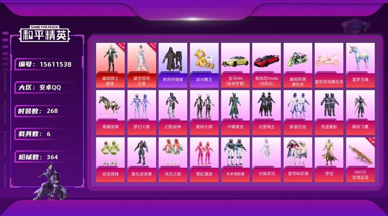 [15611538]MQ788 安卓盛世惊鸿-云鸾(三级),幽焰骑士-维塔(一级)M416-至情至圣(九级)!手Q-2神装-16粉装-15特效枪-6载具-11粉色飞行器-134286热力值-8王牌印记-268套装-364枪皮