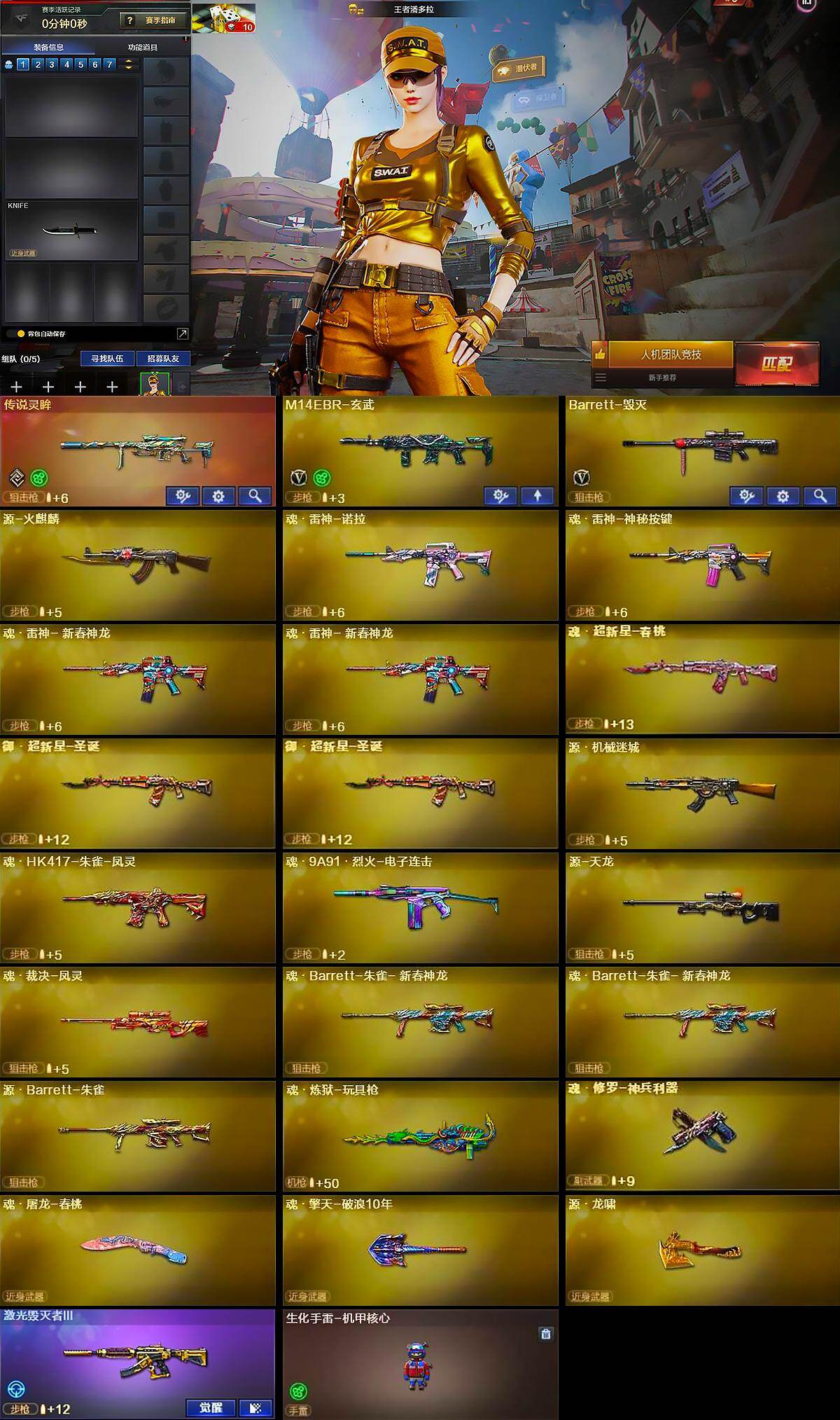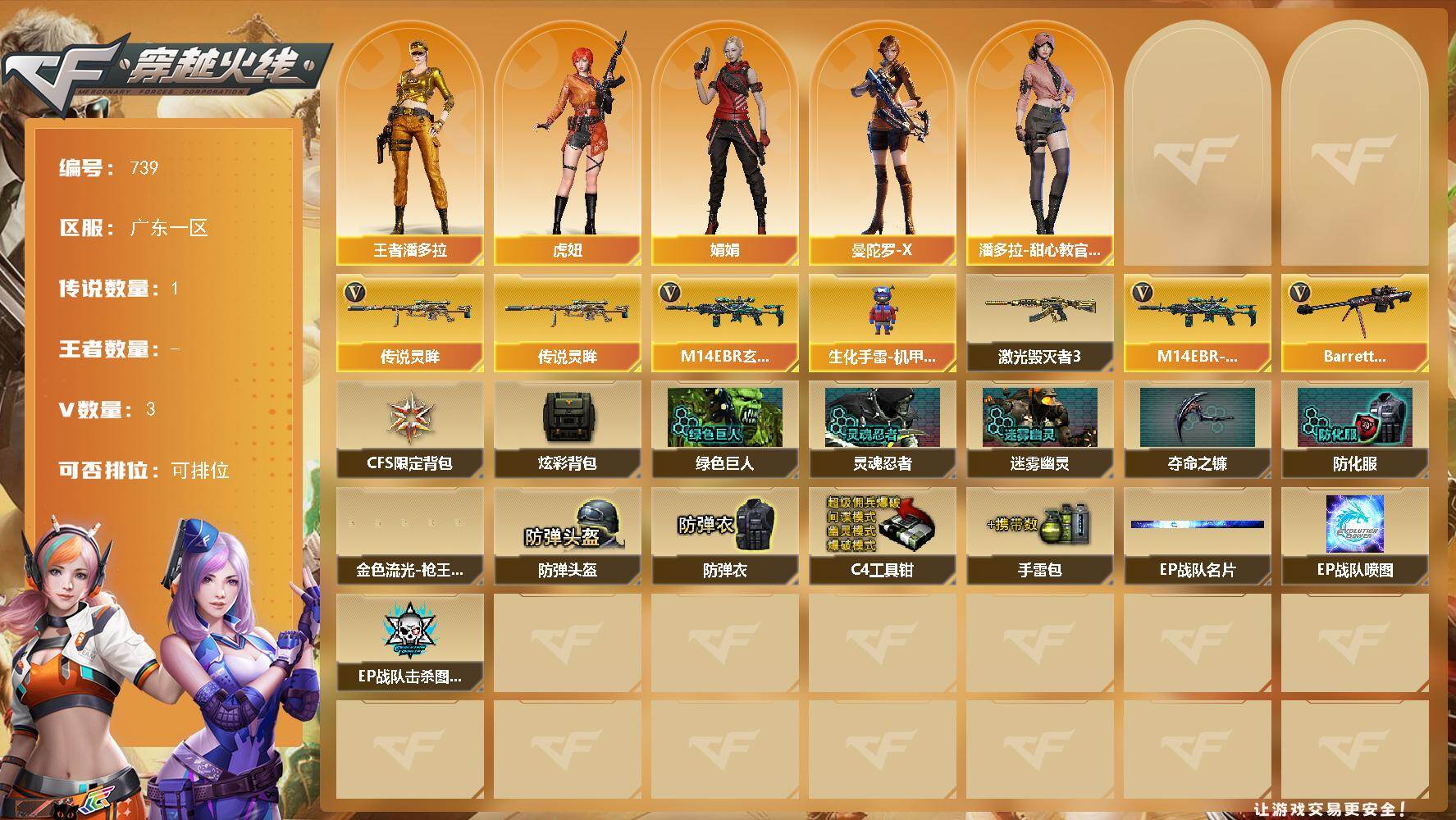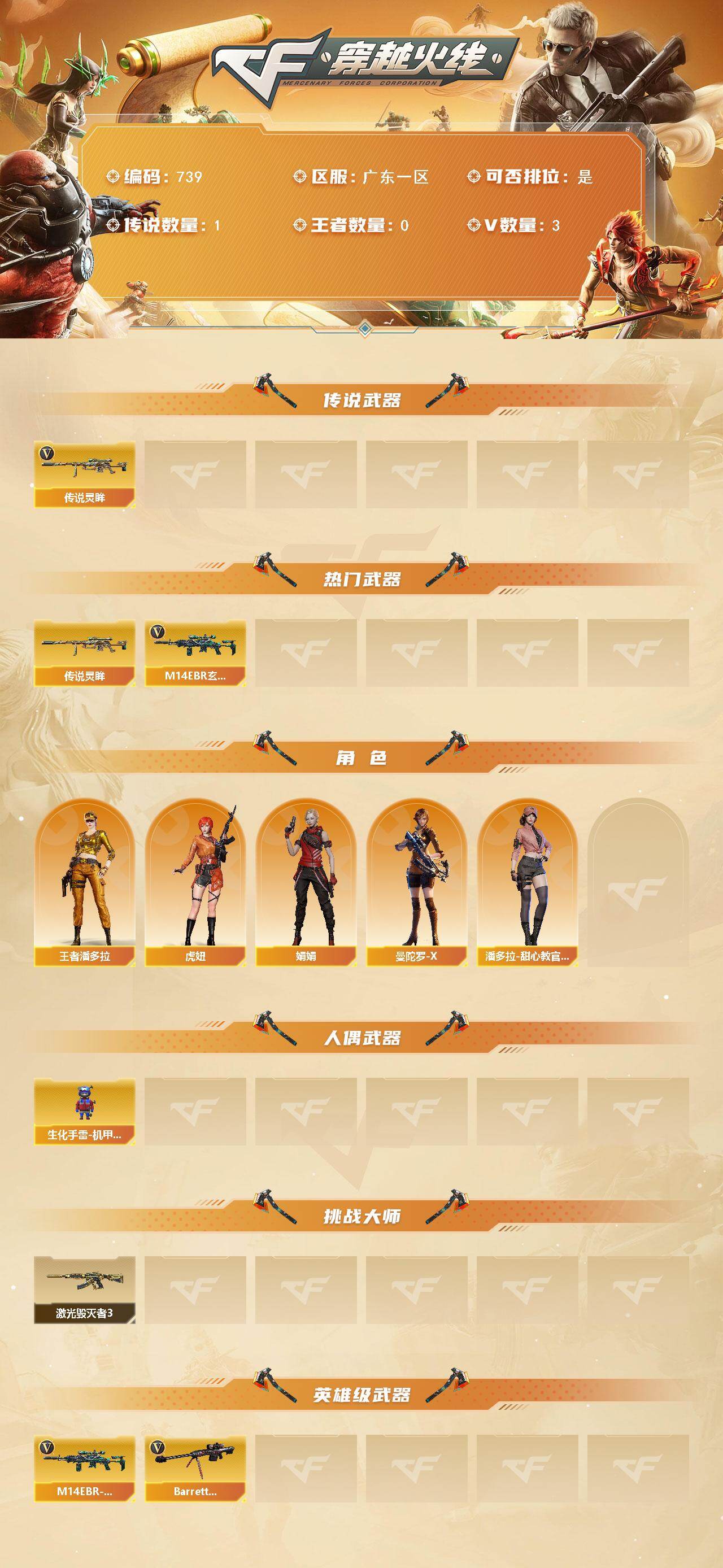 [15678072]广东一区-3V-0王者-0炫金 【传说武器】:传说灵眸 【热门武器】:传说灵眸,M14EBR-玄武 【角色】:王者潘多拉,虎妞,娟娟,曼陀罗-X,潘多拉-甜心教官 【人偶武器】:生化手雷-机甲核心 【挑战大师】:激光毁灭者III 【英雄级武器】:M14EBR-玄武,Barrett-毁灭 【道具】:CFS限定背包,炫彩背包,绿色巨人,灵魂忍者,迷雾幽灵,夺命之镰,防化服*2,金色流光-枪王排位,星辰流光-枪王排位,枪王排位28赛季金色流光,EP战队名片,EP战队喷图,EP战队击杀图标,防弹头盔*2,防弹衣*2,C4工具钳*2,手雷包*2 【特殊枪械】: