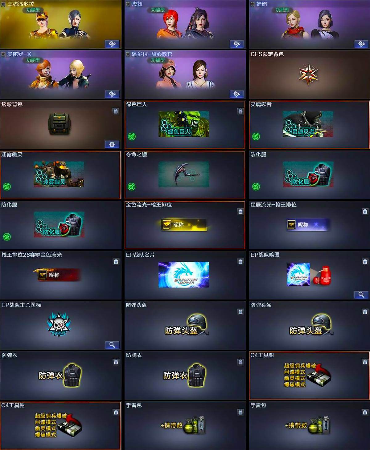 【道具】:CFS限定背包,炫彩背包,绿色巨人,灵魂忍者,迷雾幽灵,夺命之镰,防化服*2,金色流光-枪王排位,星辰流光-枪王排位,枪王排位28赛季金色流光,EP战队名片,EP战队喷图,EP战队击杀图标,防弹头盔*2,防弹衣*2,C4工具钳*2,手雷包*2
